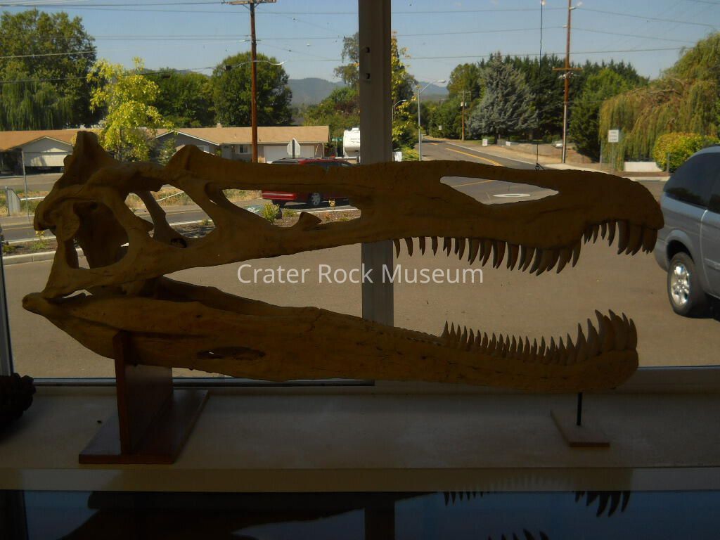 Description: This specimen is a fiberglass cast of a skull which is highly detailed and fully represented with the exception of a few missing teeth which will have to be cast at a later date. The color is a bone white. This specimen is on loan from Mike Hammer.