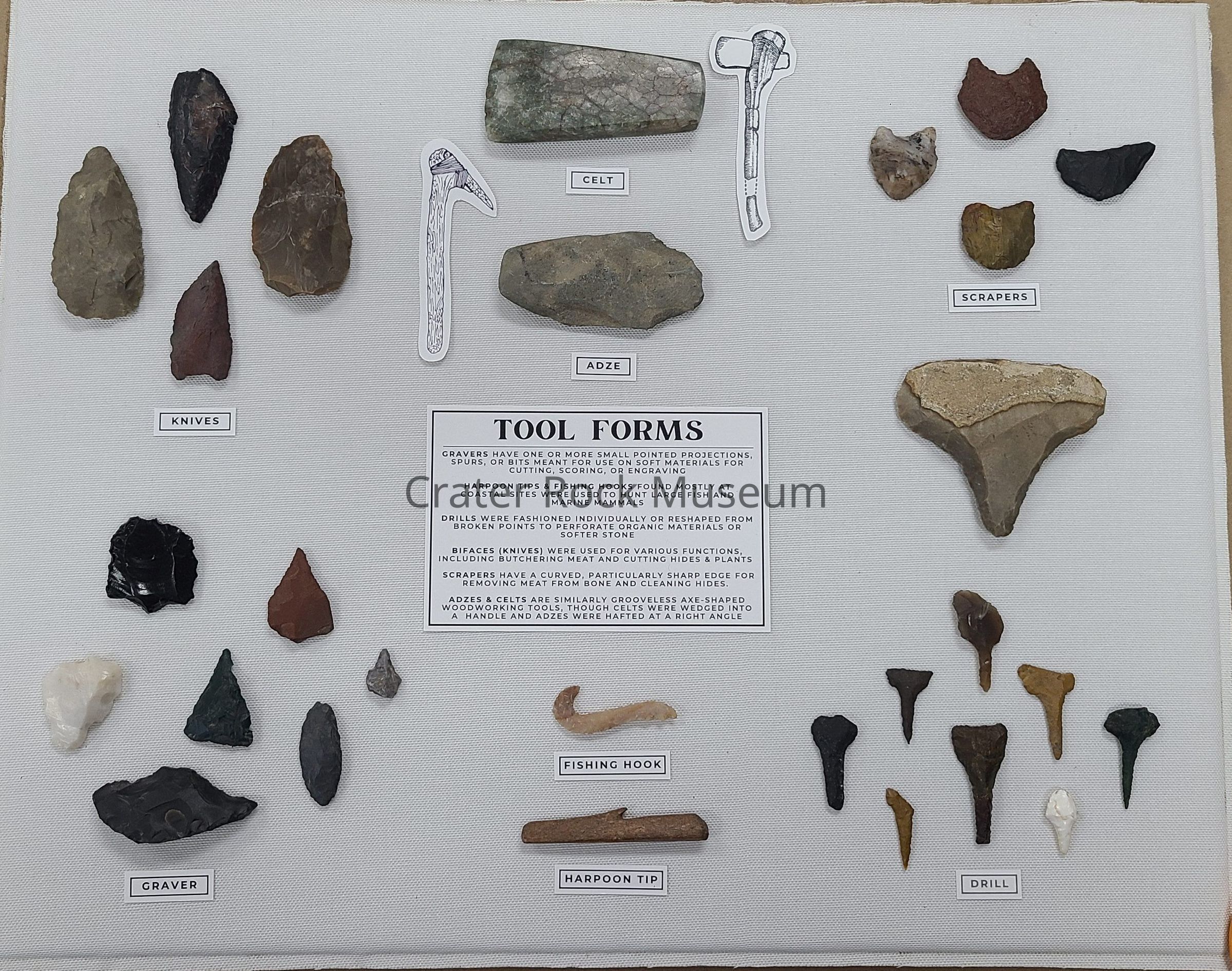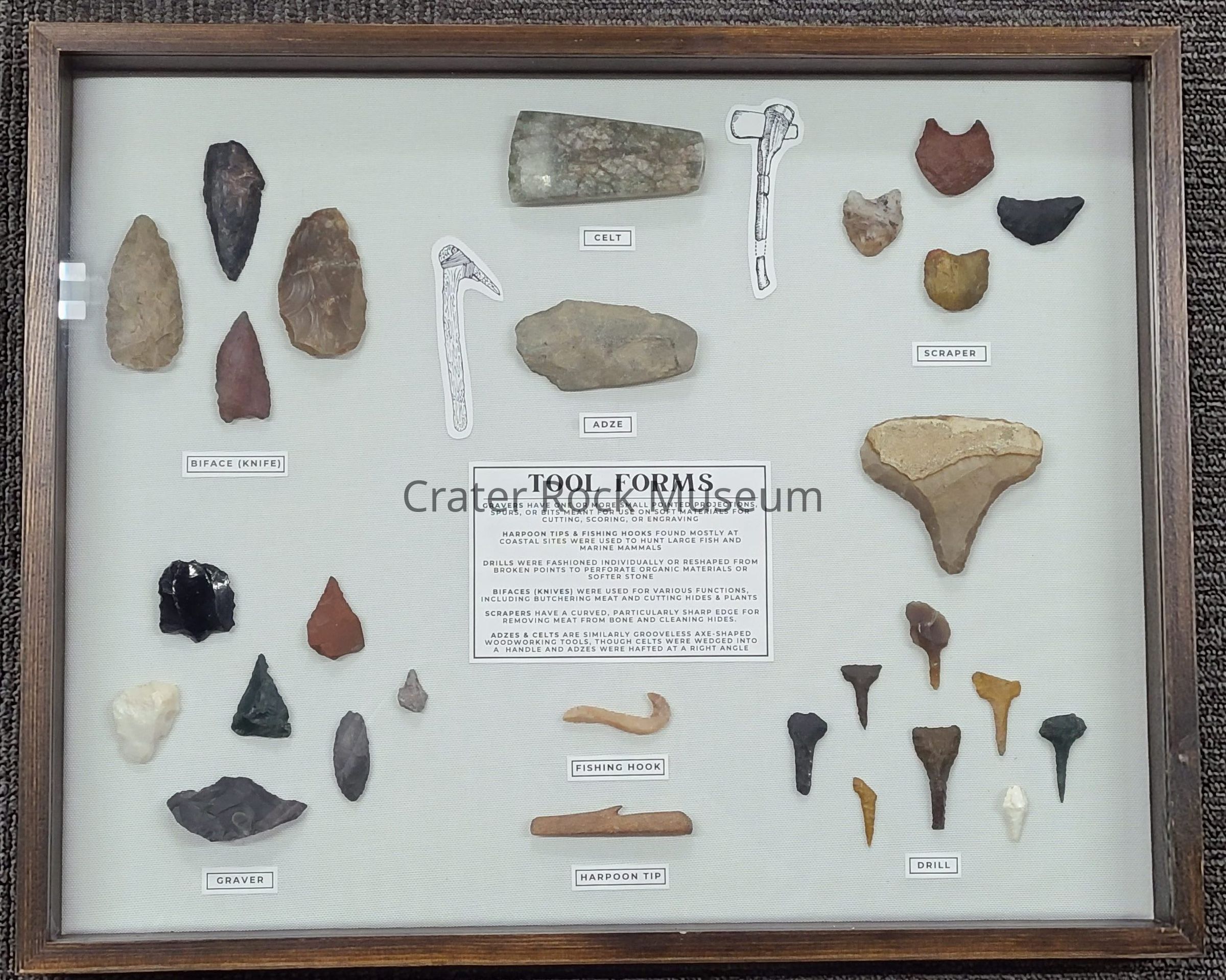 A collection of 28 tools forms composed of various materials in a shadow box, assembled as part of the 2024 Oregon Heritage Grant