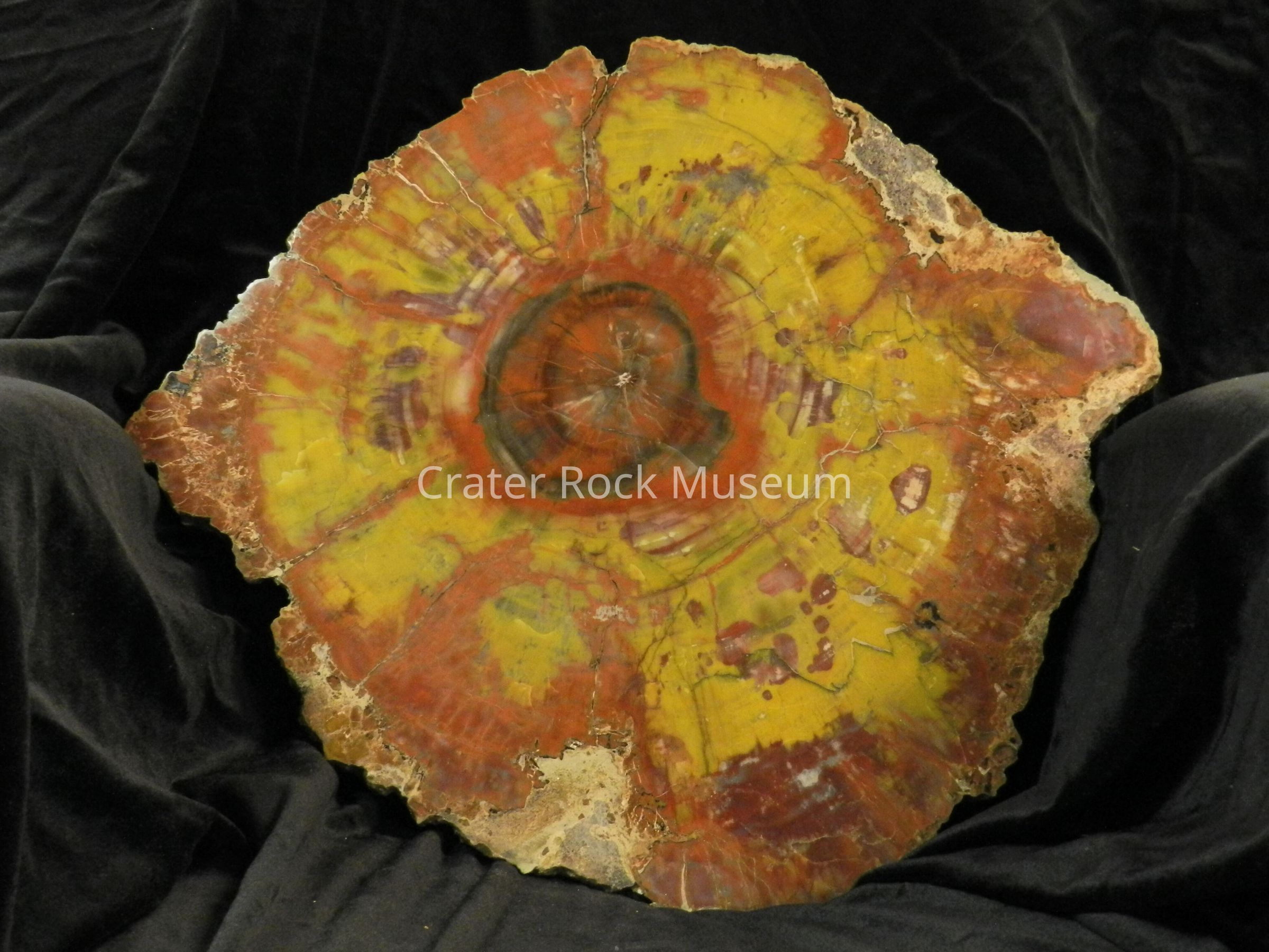 Description: Slab of a complete round the polished facef is red, a golden-yellow, brown, with a black center ring