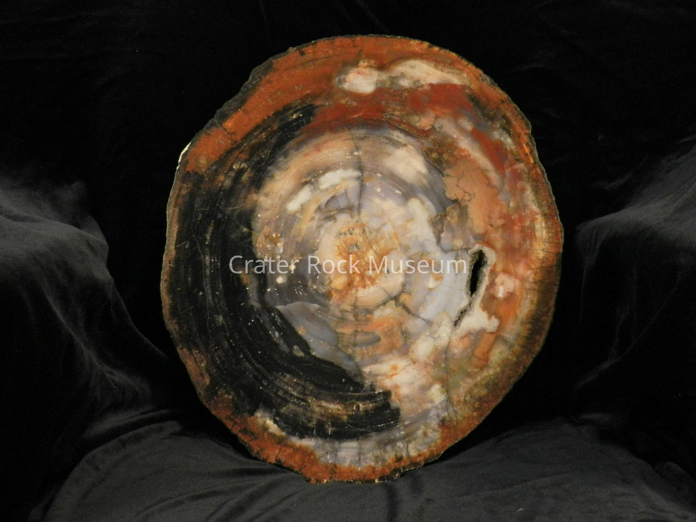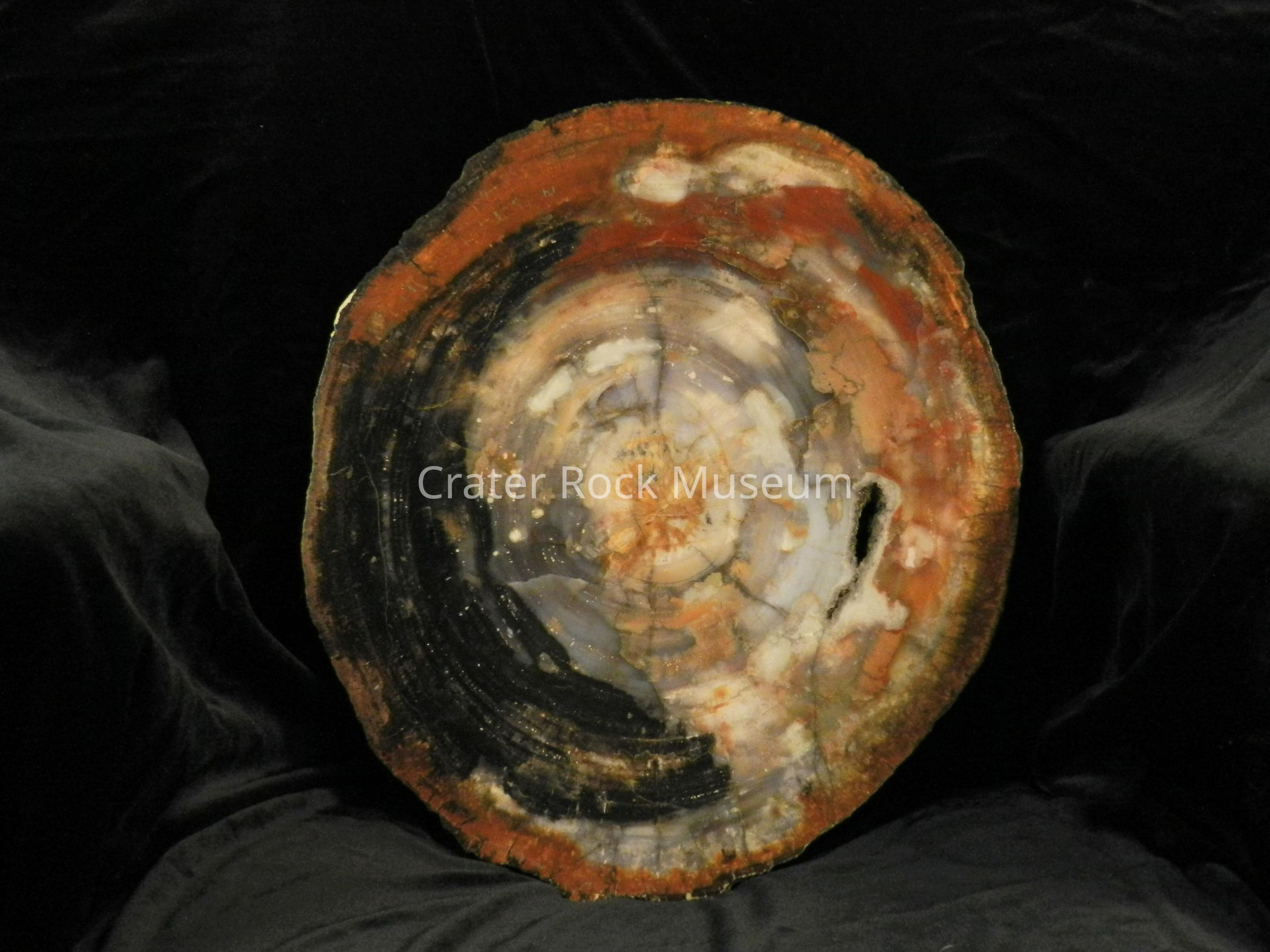 Description: Slab complete round the polished face is coloerd red, white, black, brown
