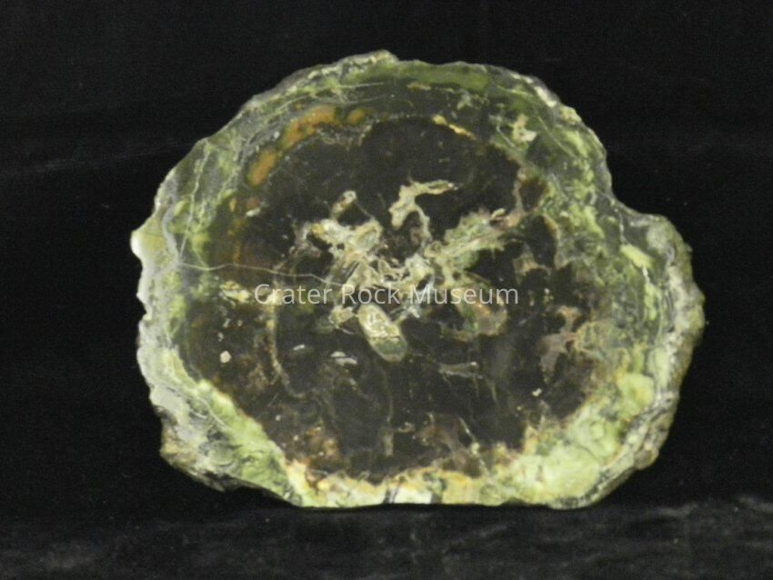 Description: One of three small round slabs with polished faces colored green, black, tan, surrounded by petrified algae