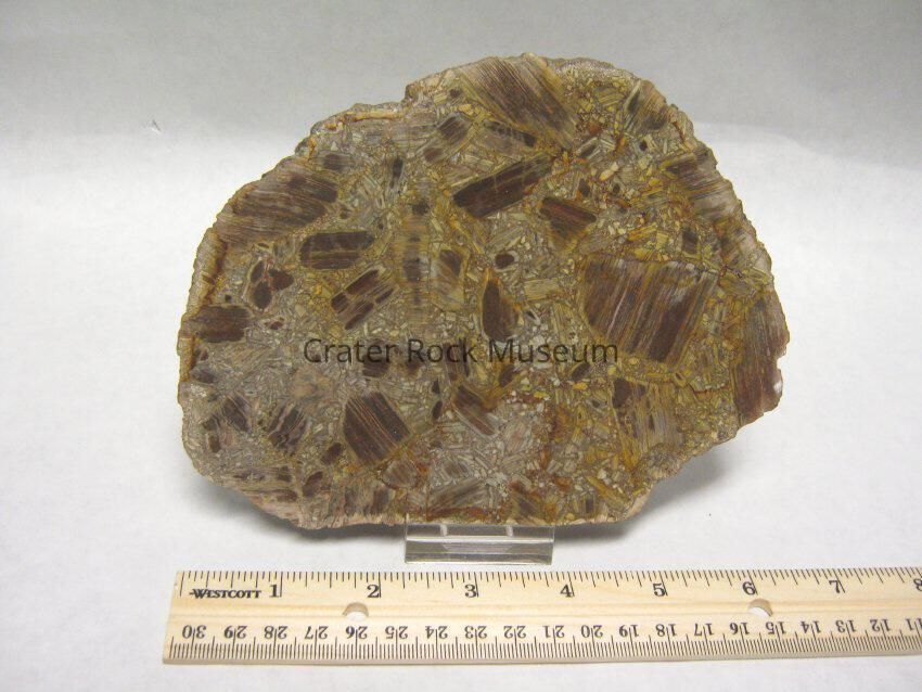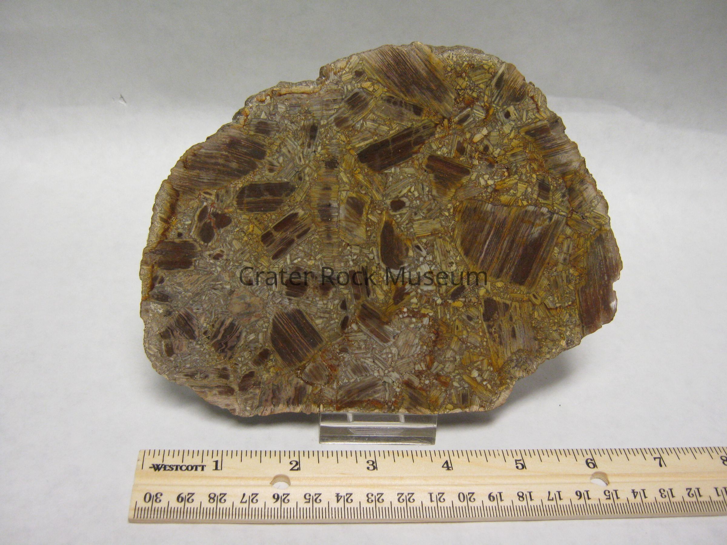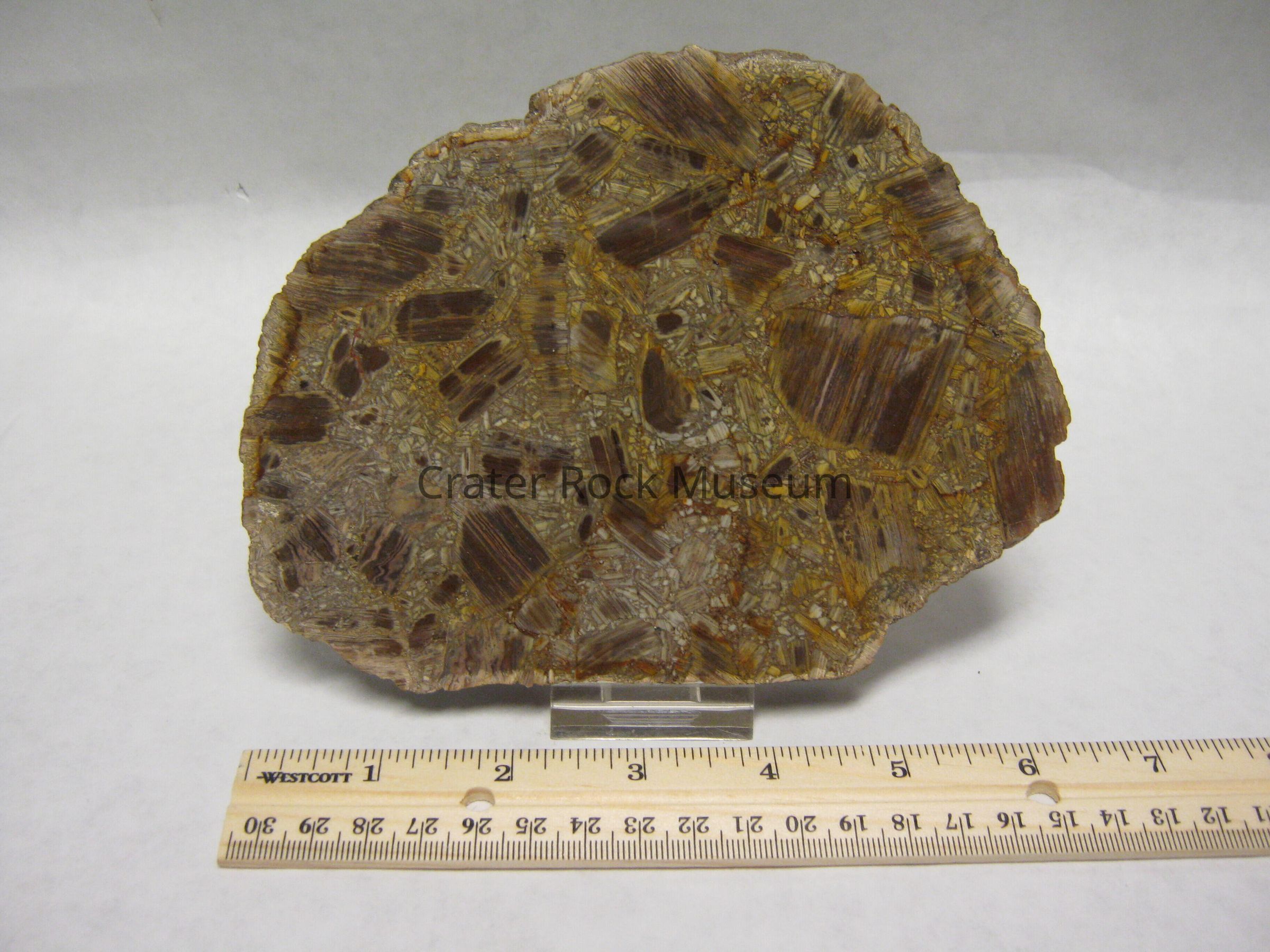 Description: Polished cut slab, shows growth rings & rays, multi-colored brown, yellow, grey, white, orange tones.