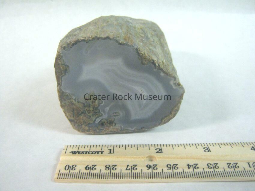 Description: Water worn, polished ends show fortified agate in greys with small crystalline center with a surrounding green and brown rock at edges. Outer cast is grey with some greens.