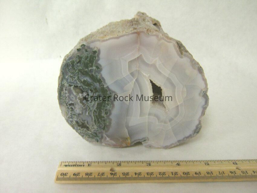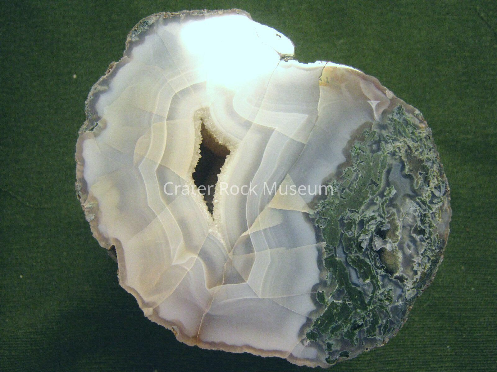 Description: Polished face that is clear, white, beige agate with green running through on one side, and crystalline pocket in the center. Outer pinkish agate with blue/greyish woody appearance.
