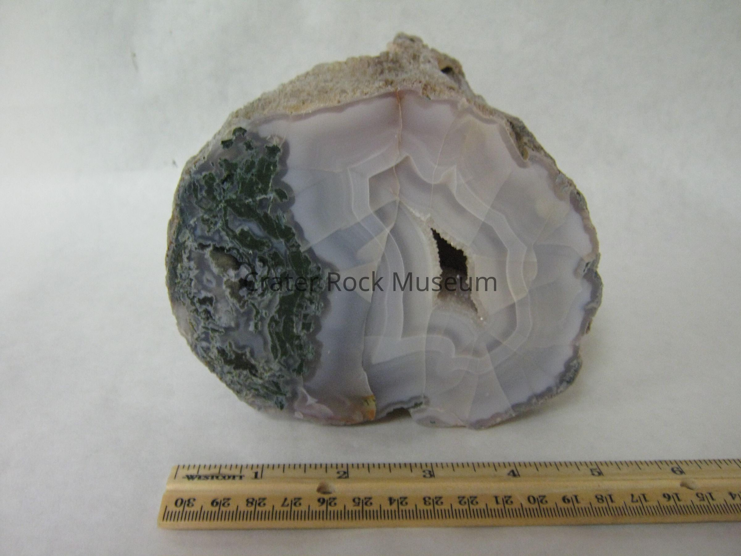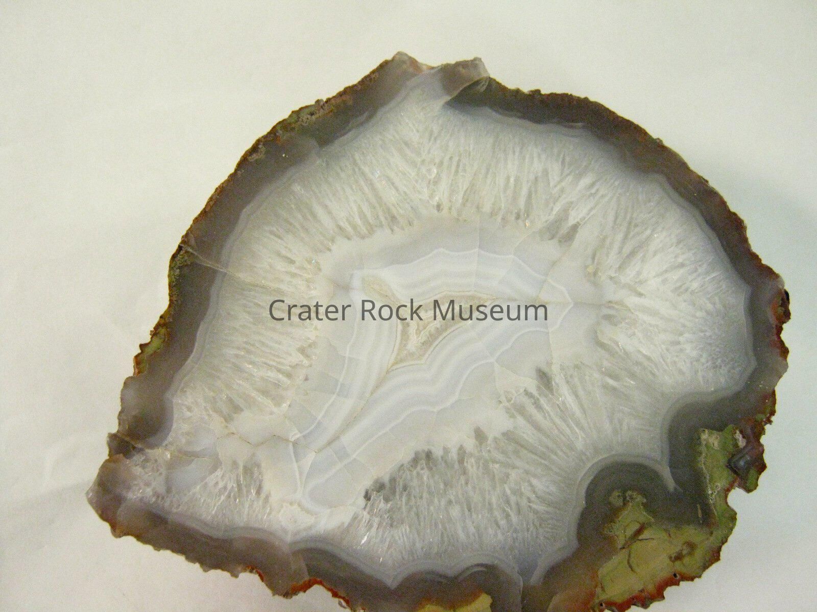Description: Polished end shows large crystalline fortified agate center in white, light grey, surrounding by darker grey and some green & red rock at edges.