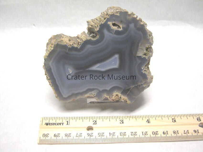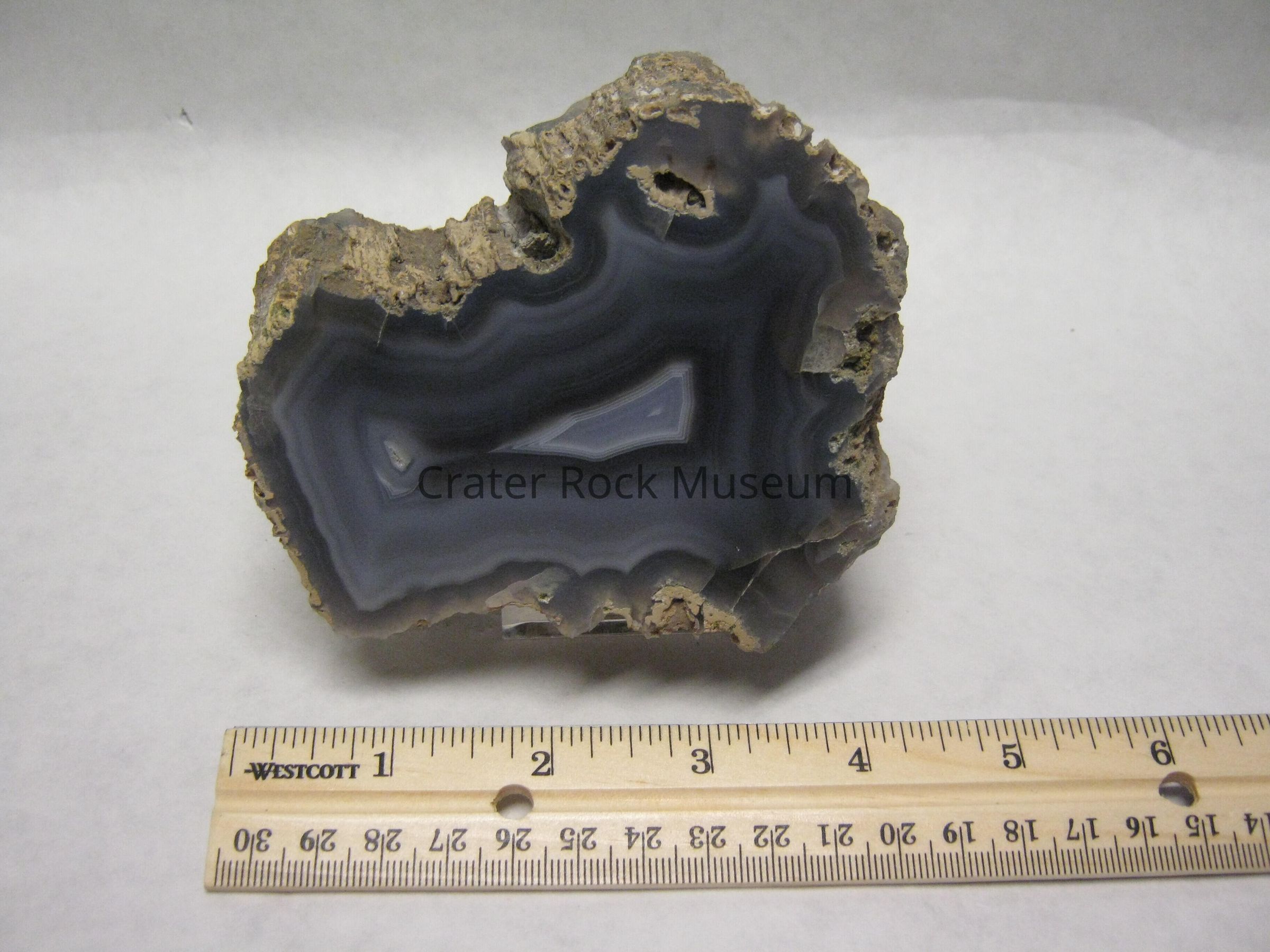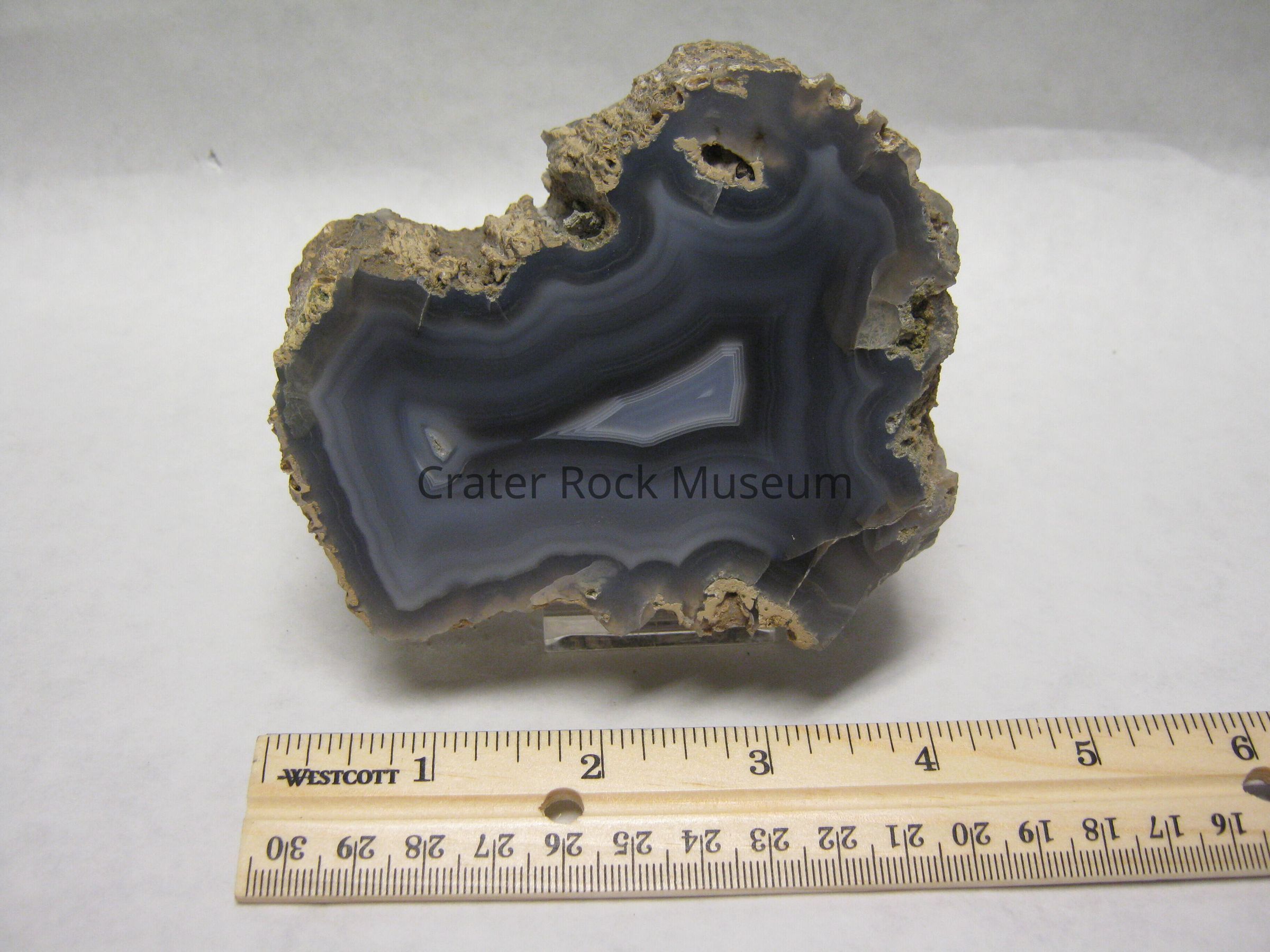 Description: Polished sides shows fortified agate in ligth & darker blues/greys. Each has a small crystalline spot surrounding rock is a cream. Slice is in the shape of a ram