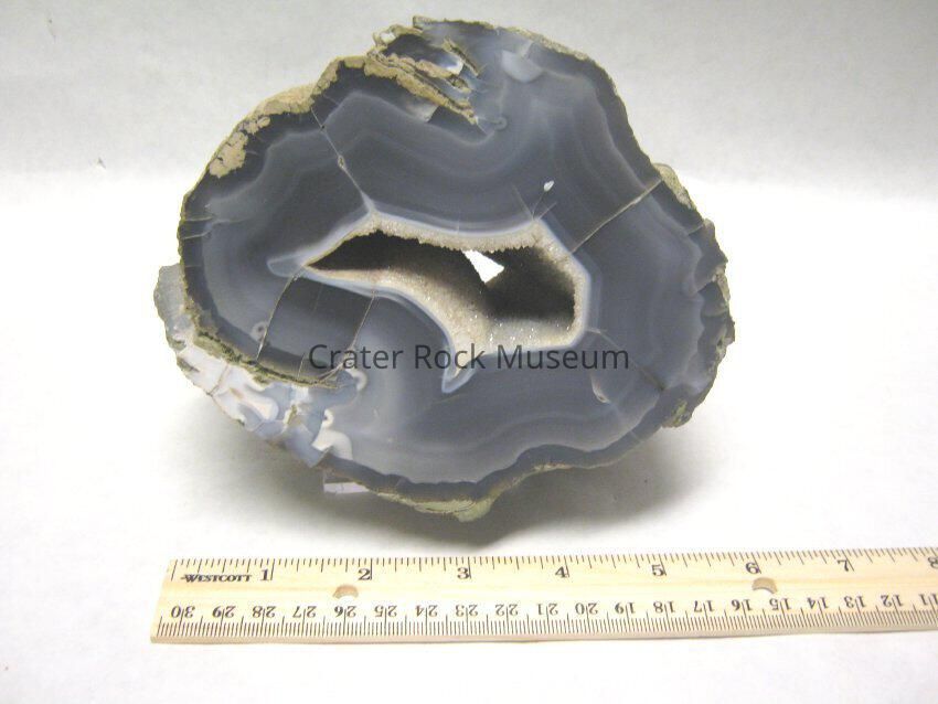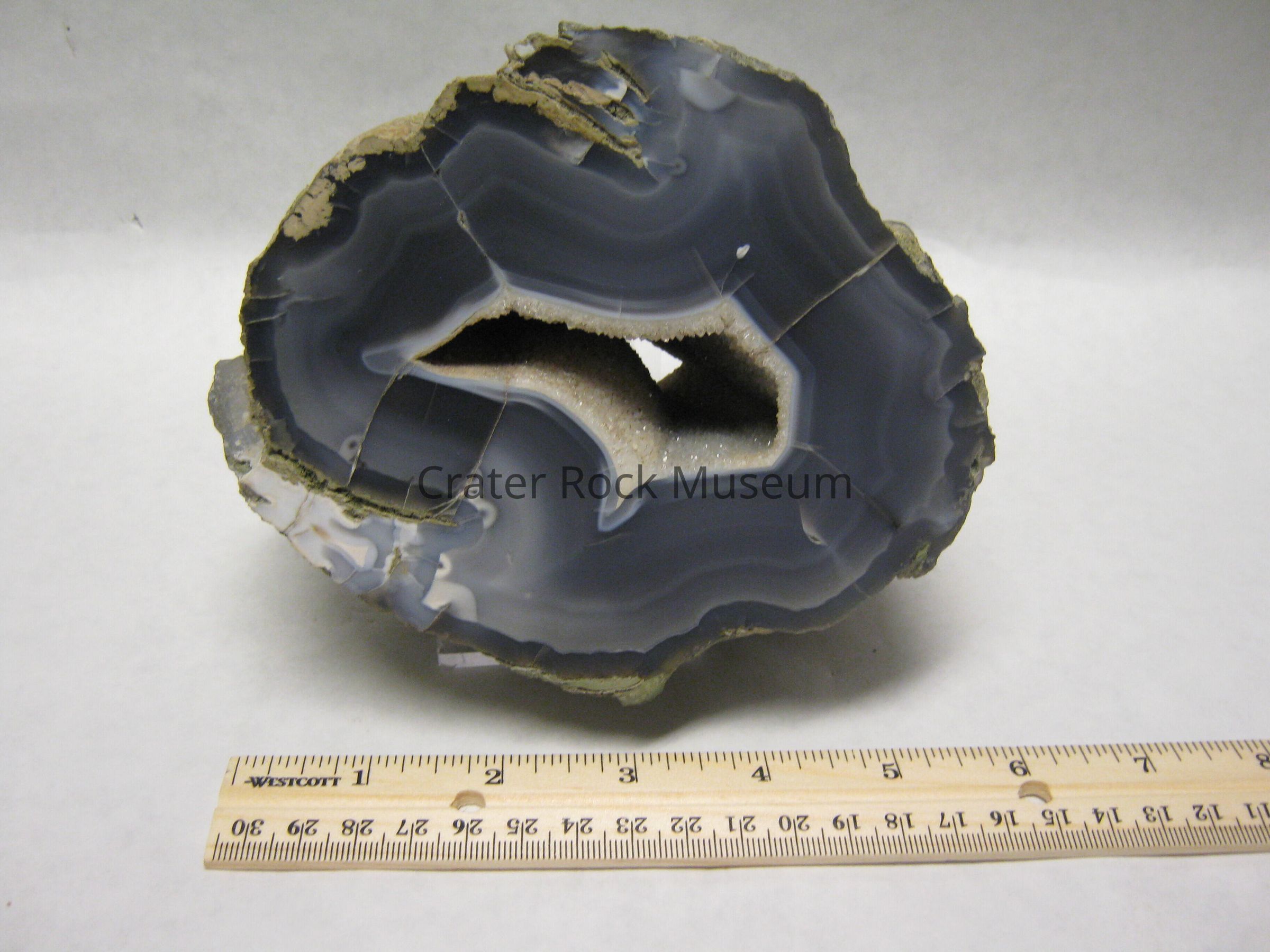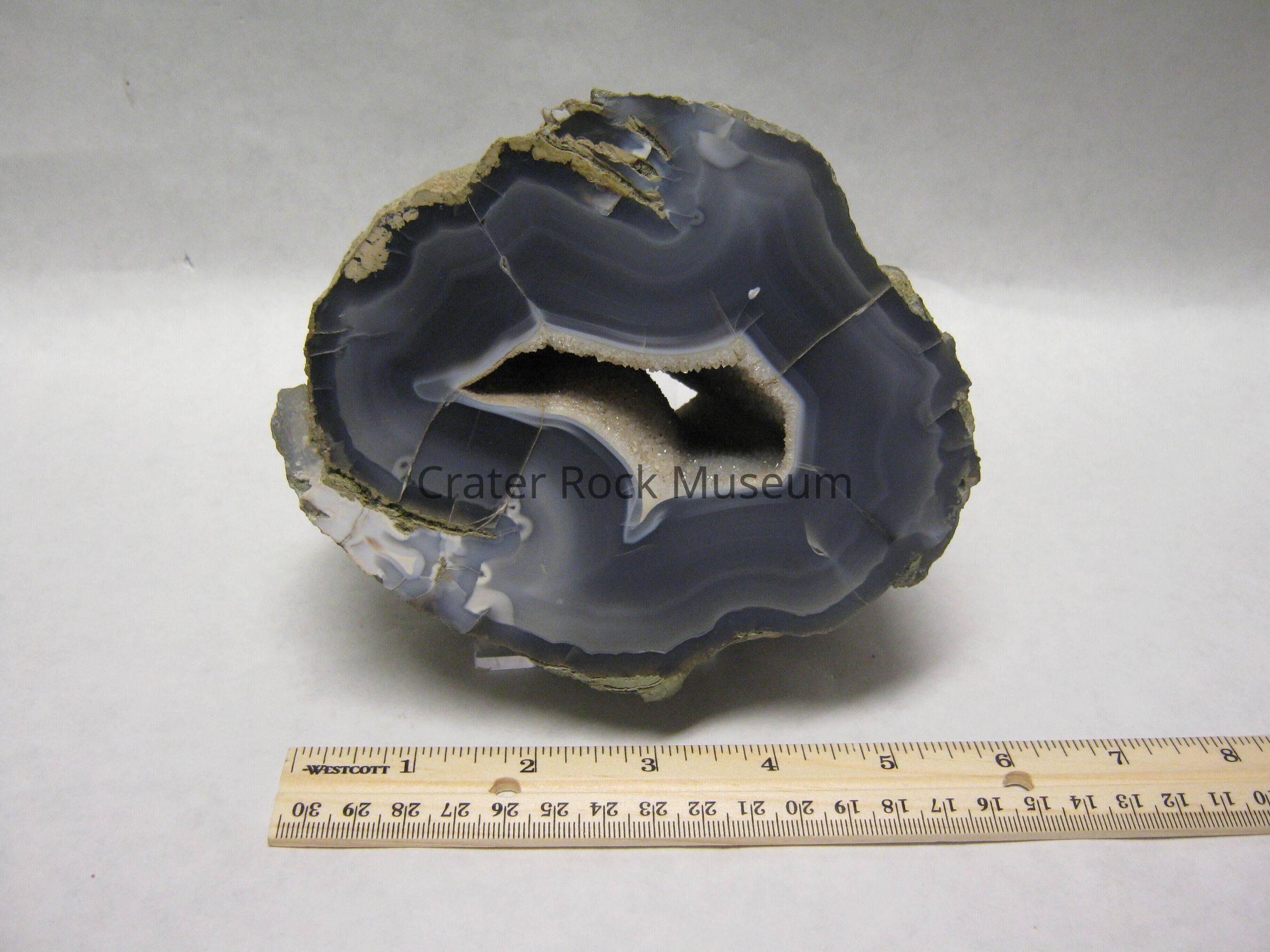 Description: Polished side shows open crystalline center in grey and white surrounded by dark blue grey fortified agate with some white at some points along outer edge. Outer rock is in clay like beige and greenish material. Surface cracks seen.