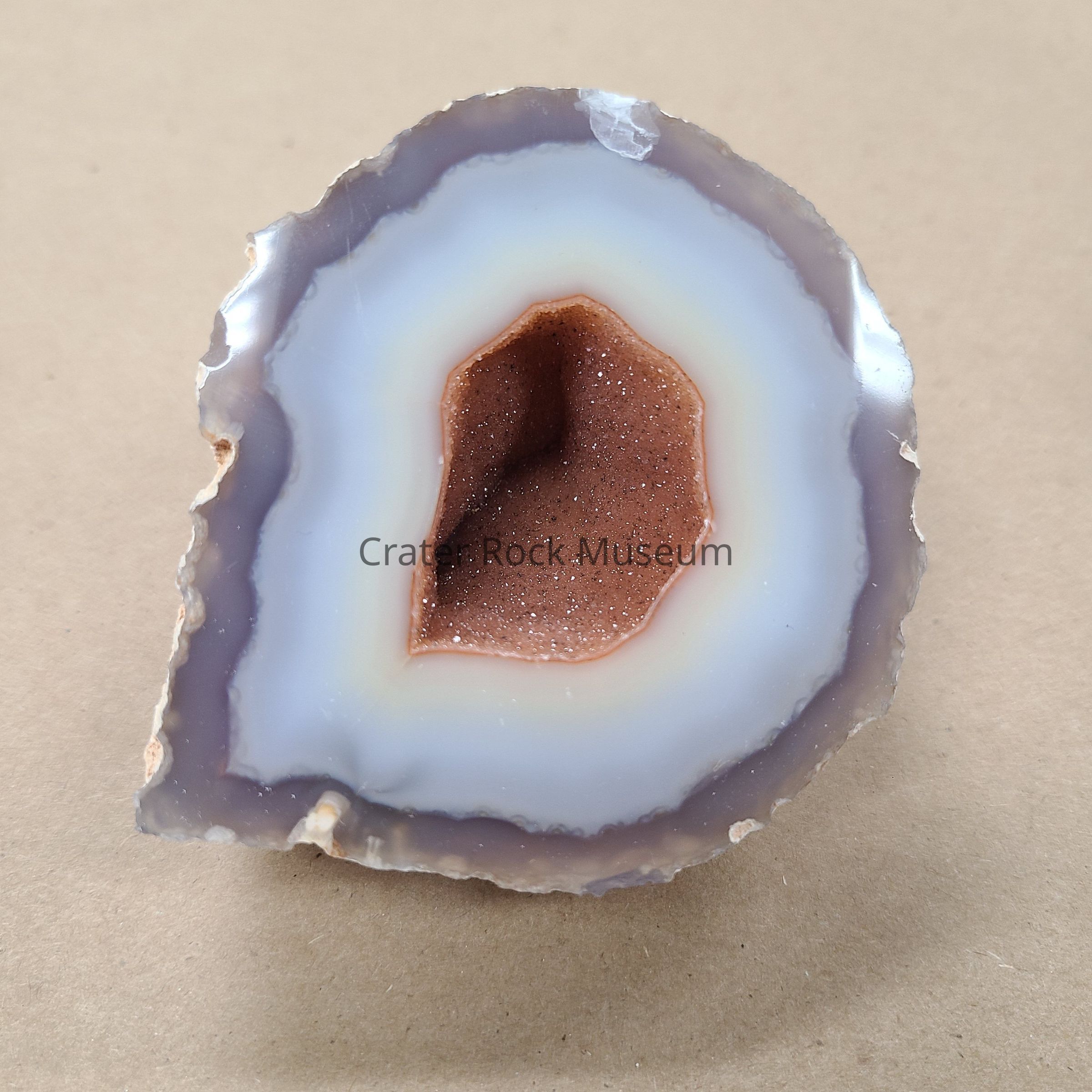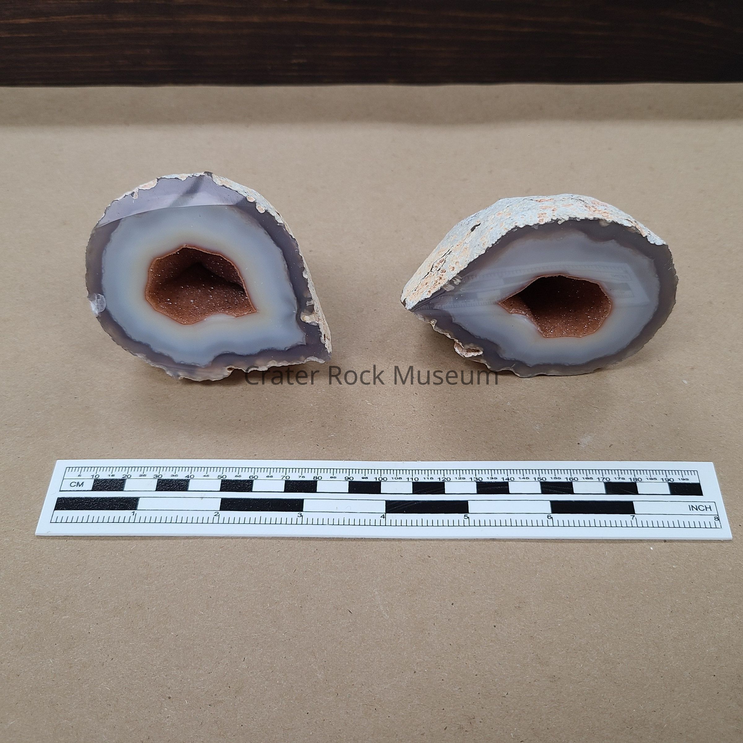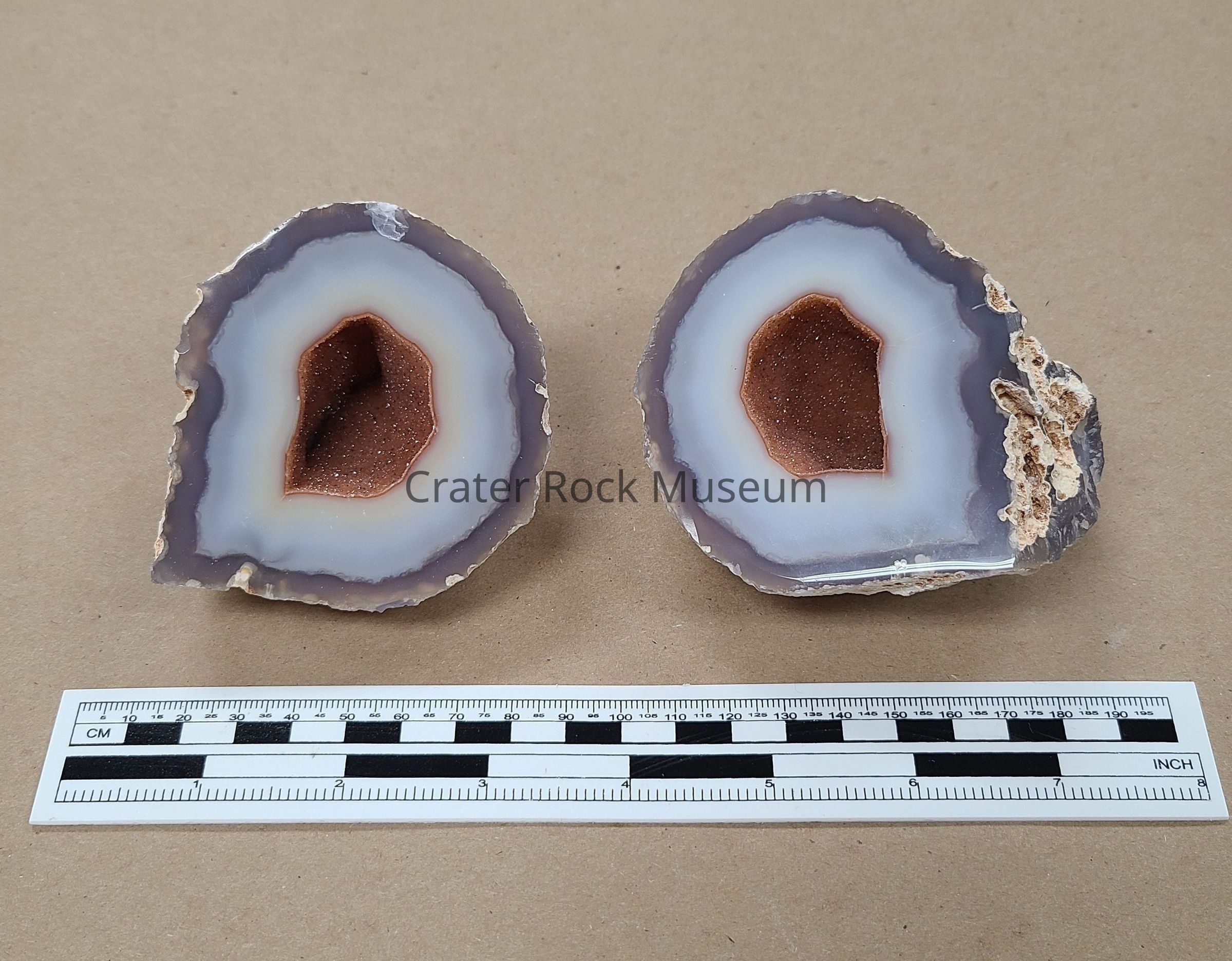 Agate geode in two halves with bands of grey, blue, white, pale yellow with a burnt orange drusy center. Minor chipping on the polished face of specimen A.