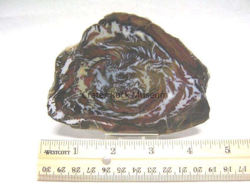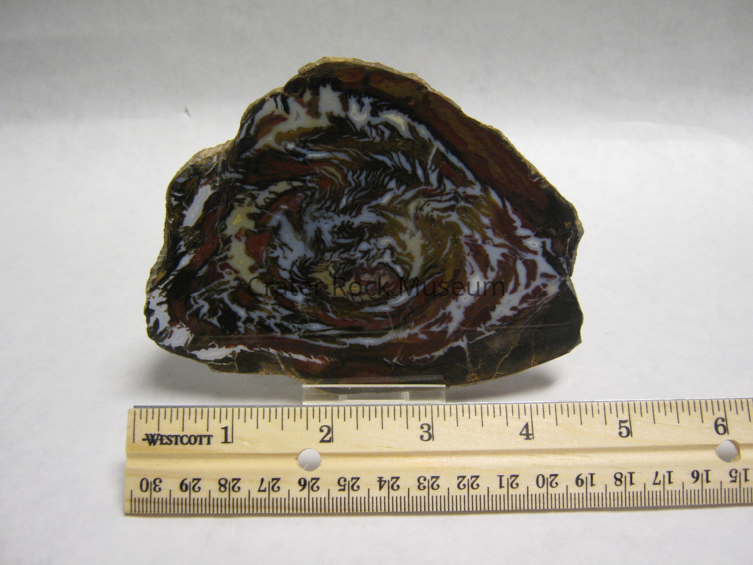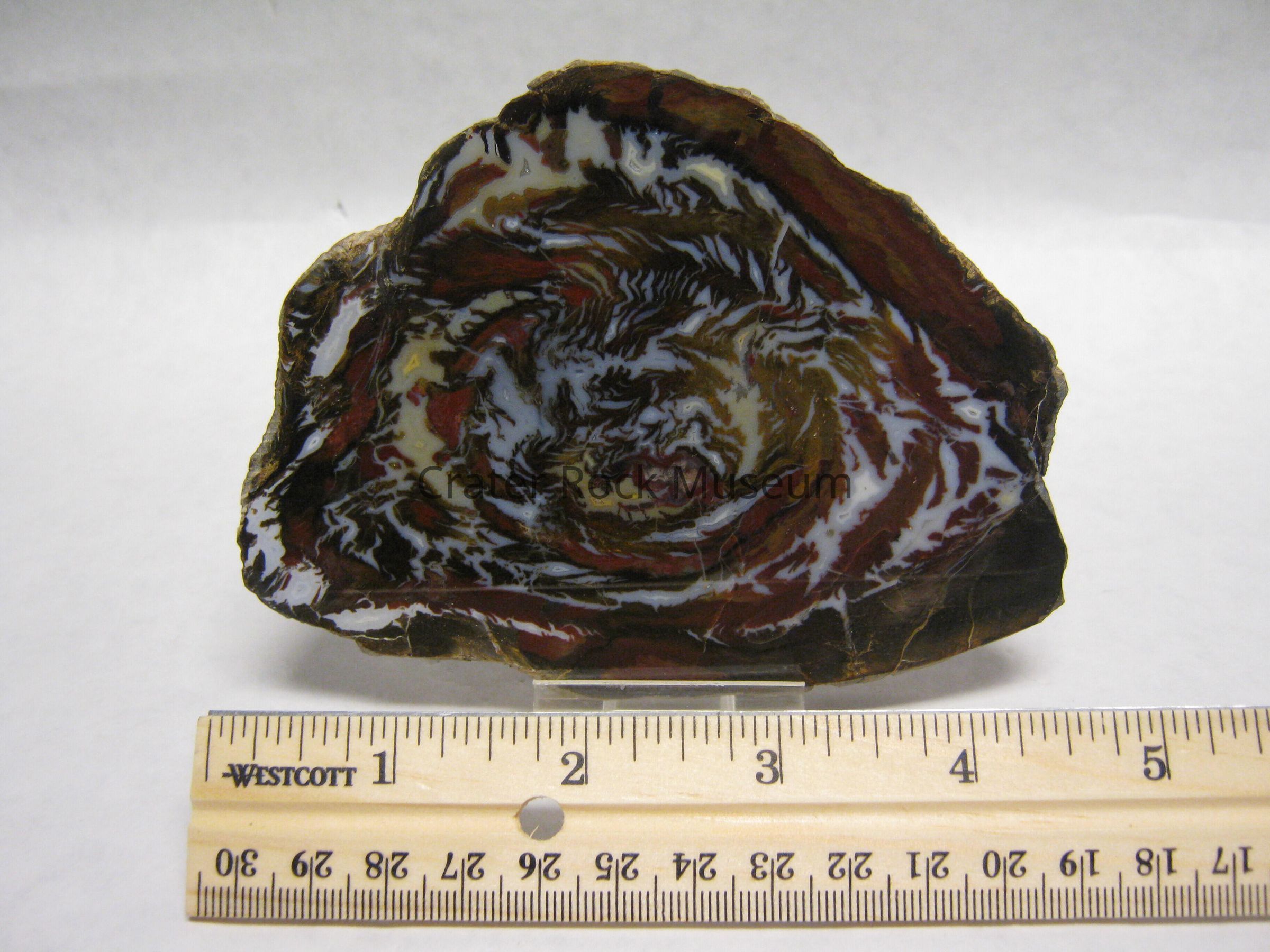 Description: Circular pattern of agatized minerals in reddish-brown, white and black.