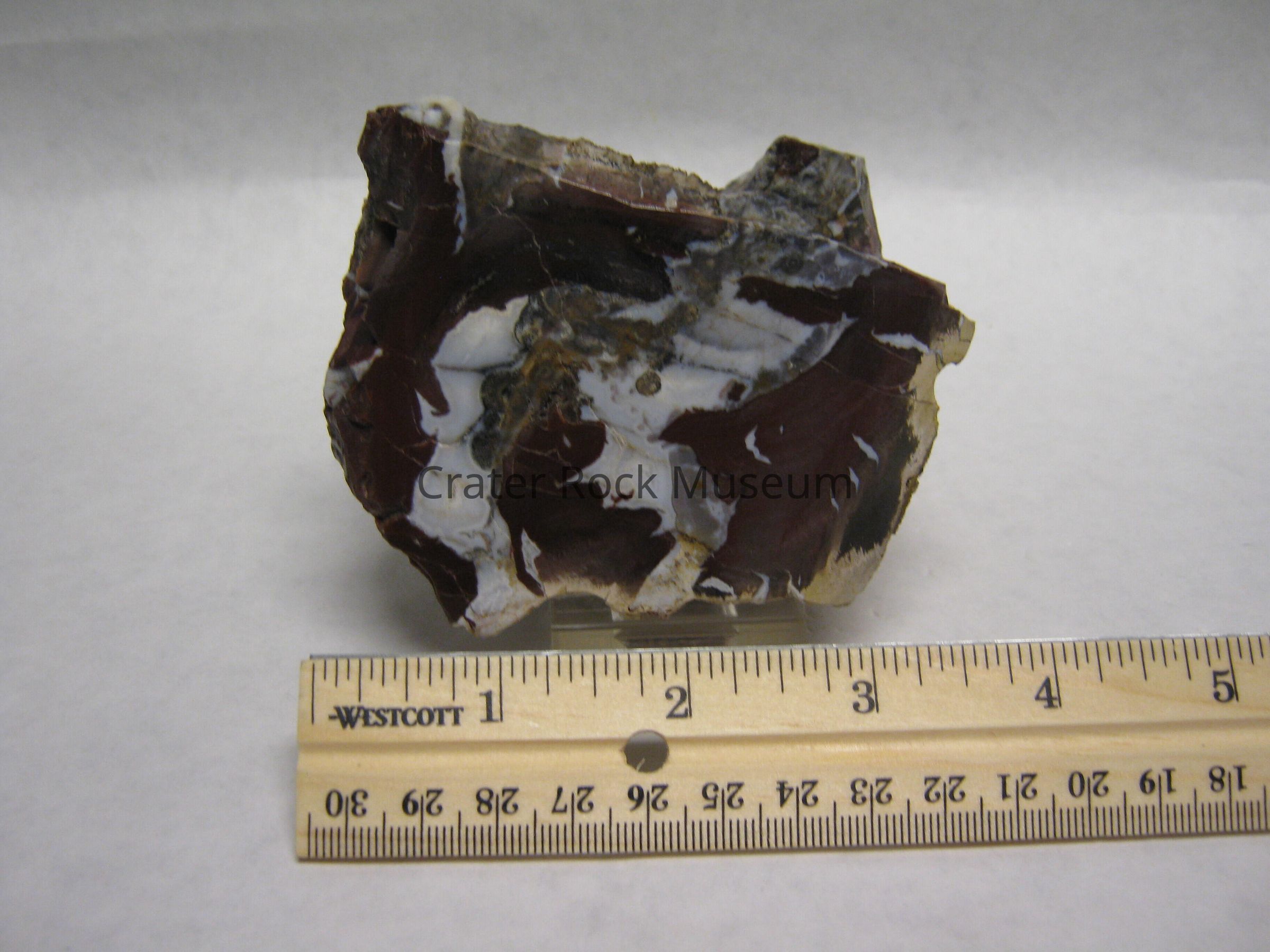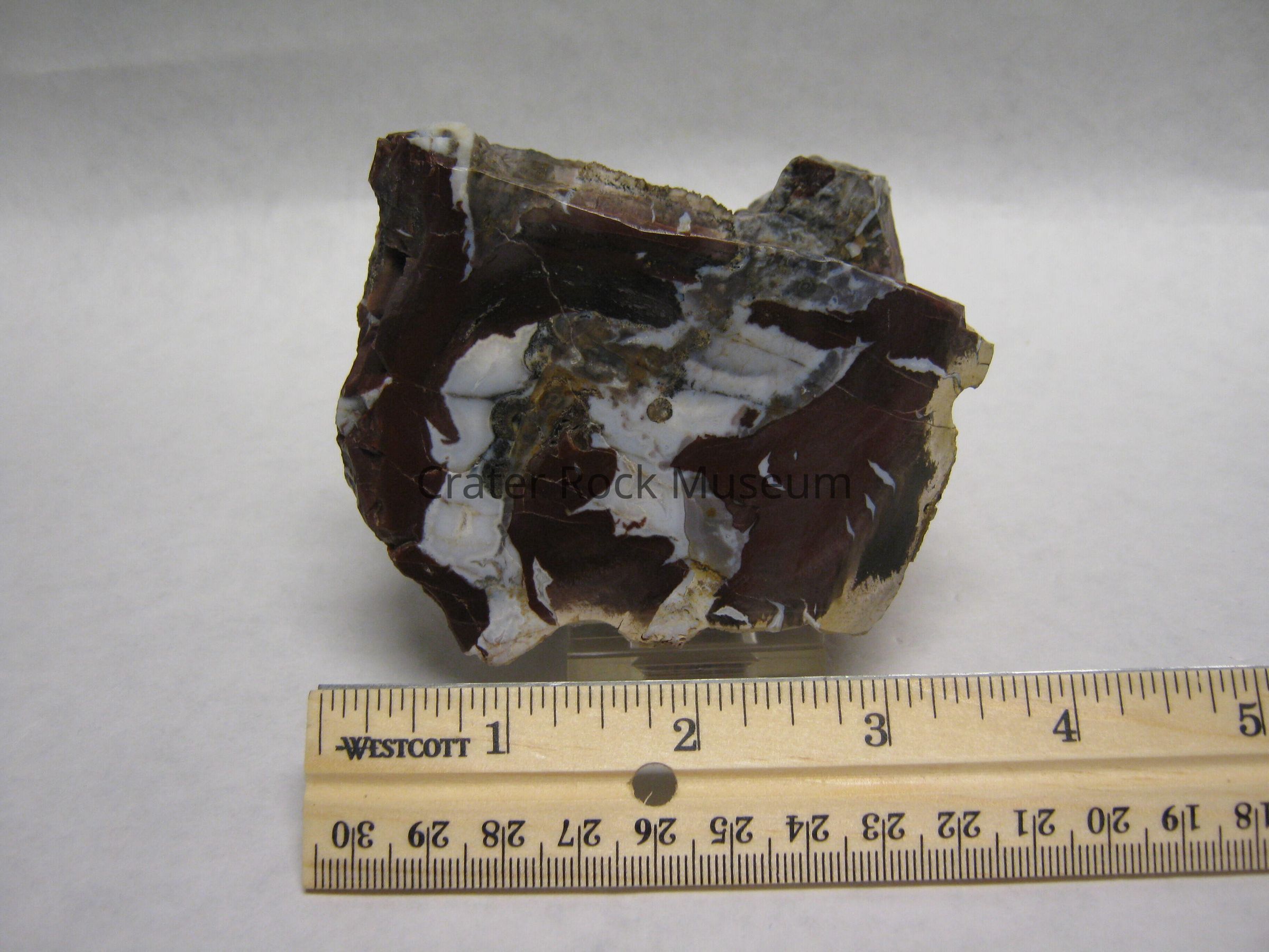 Variety: "Roxy Ann Wood " is composed of a mélange of petrified wood, chalcedony and jasper, with in fillings of volcanic ash and microcrystalline quartz. The specimens show woody texture on their outer surfaces, they are not true limb casts. According to geologist Marty Norris, the conditions necessary formation of limb casts were present, but these specimens were shattered, splintered and then began to decay before their transformation into petrified wood, and so they are "wood cast."