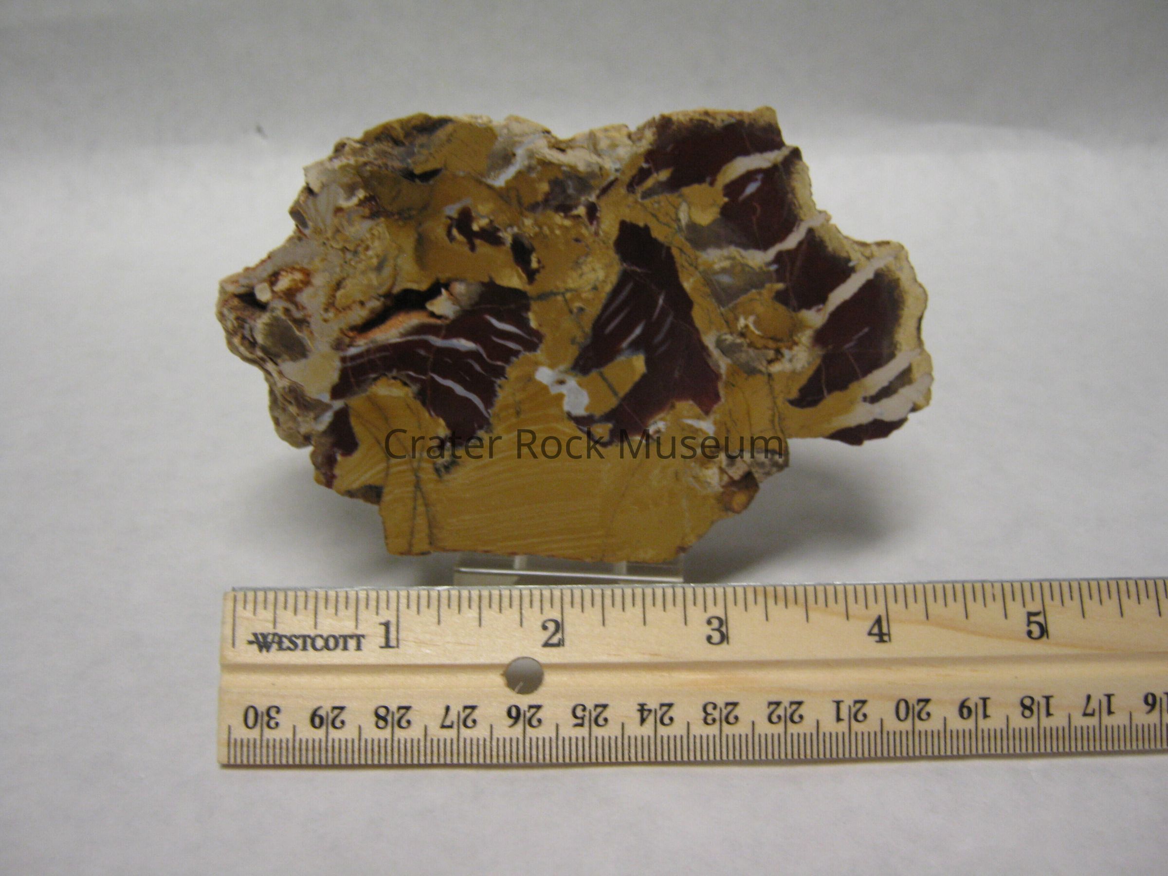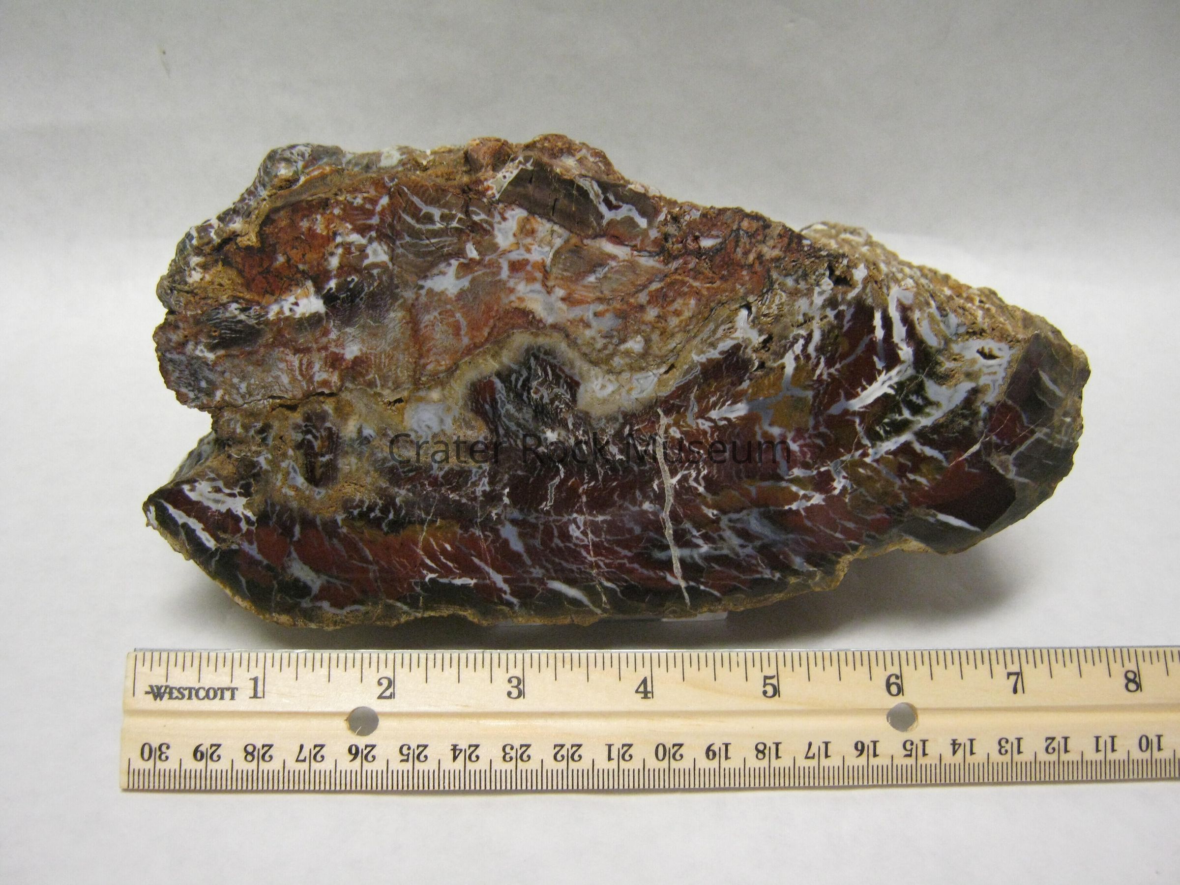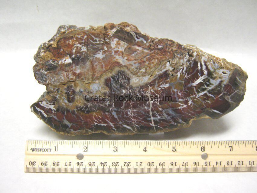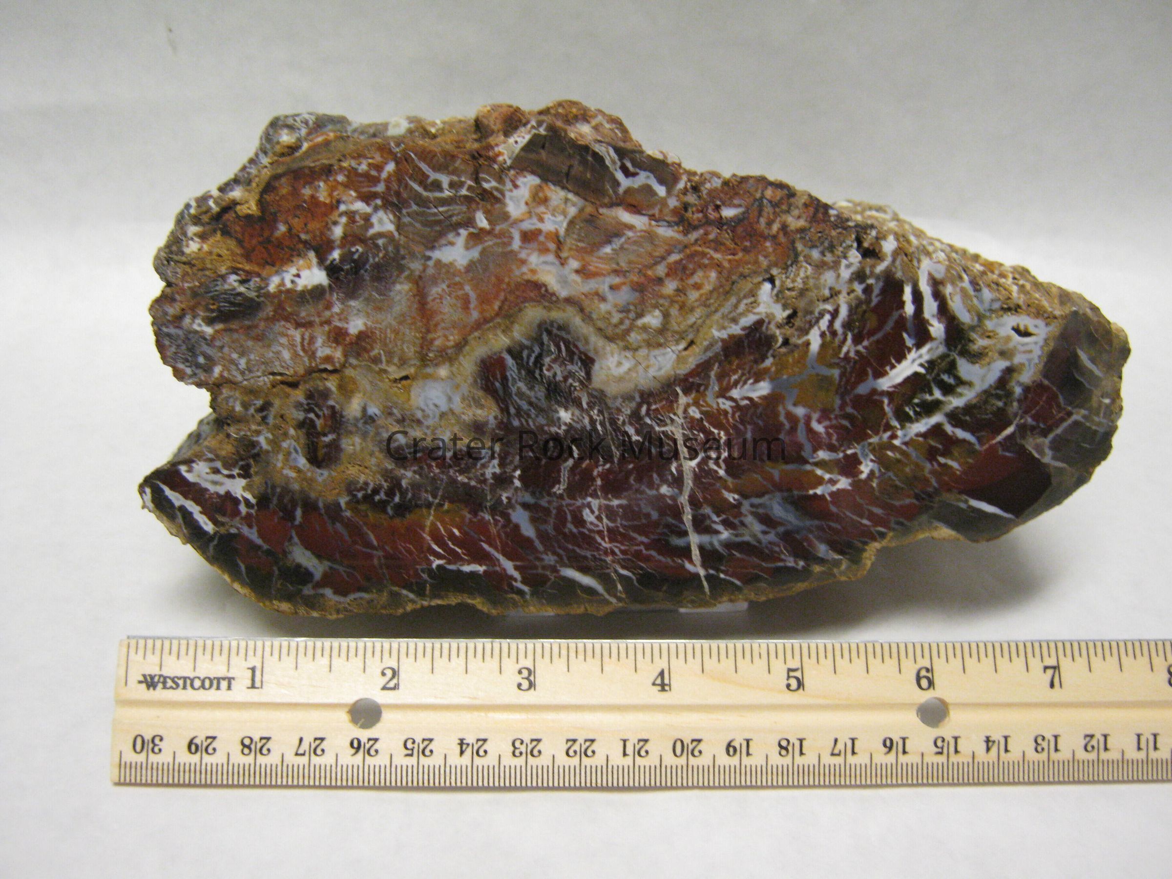 Variety: "Roxy Ann Wood " is composed of a mélange of petrified wood, chalcedony and jasper, with in fillings of volcanic ash and microcrystalline quartz. The specimens show woody texture on their outer surfaces, they are not true limb casts. According to geologist Marty Norris, the conditions necessary formation of limb casts were present, but these specimens were shattered, splintered and then began to decay before their transformation into petrified wood, and so they are "wood cast."