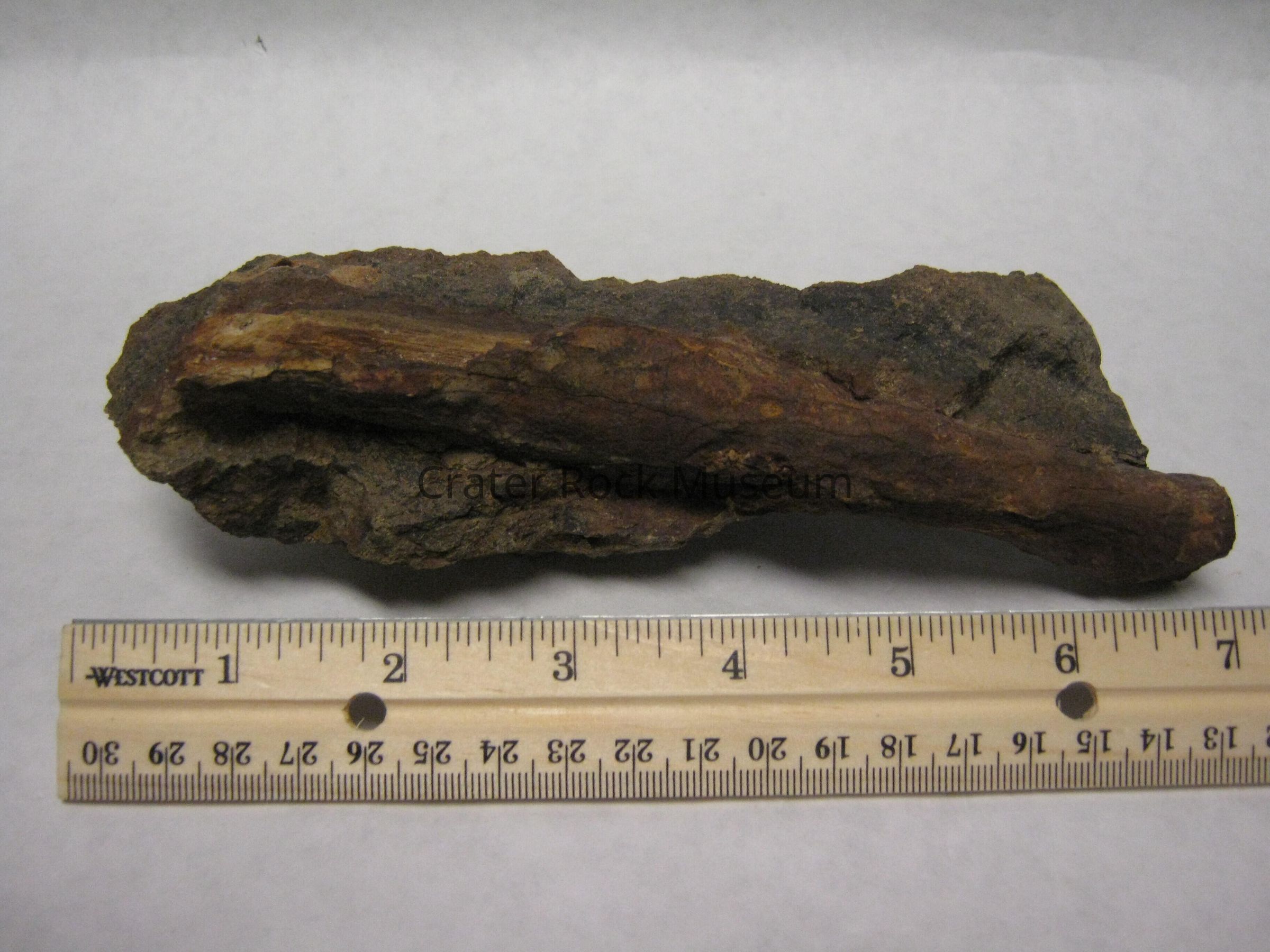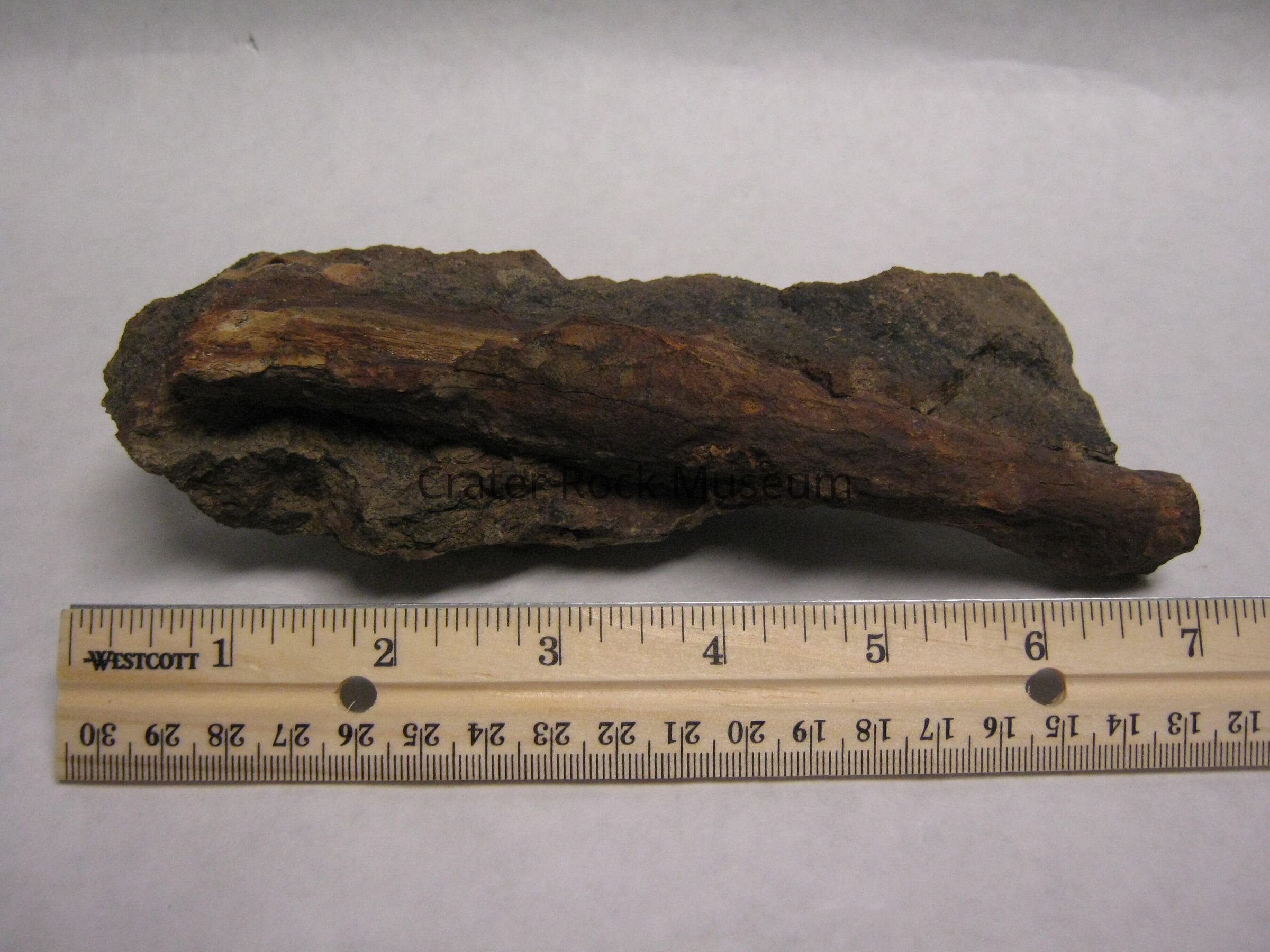 Description: Wood branch is in a fine grained volcanic tuff material which is brown to reddish the branch is shown a complete stick with simlar colors to the tuff as tanish brown to reddish brown