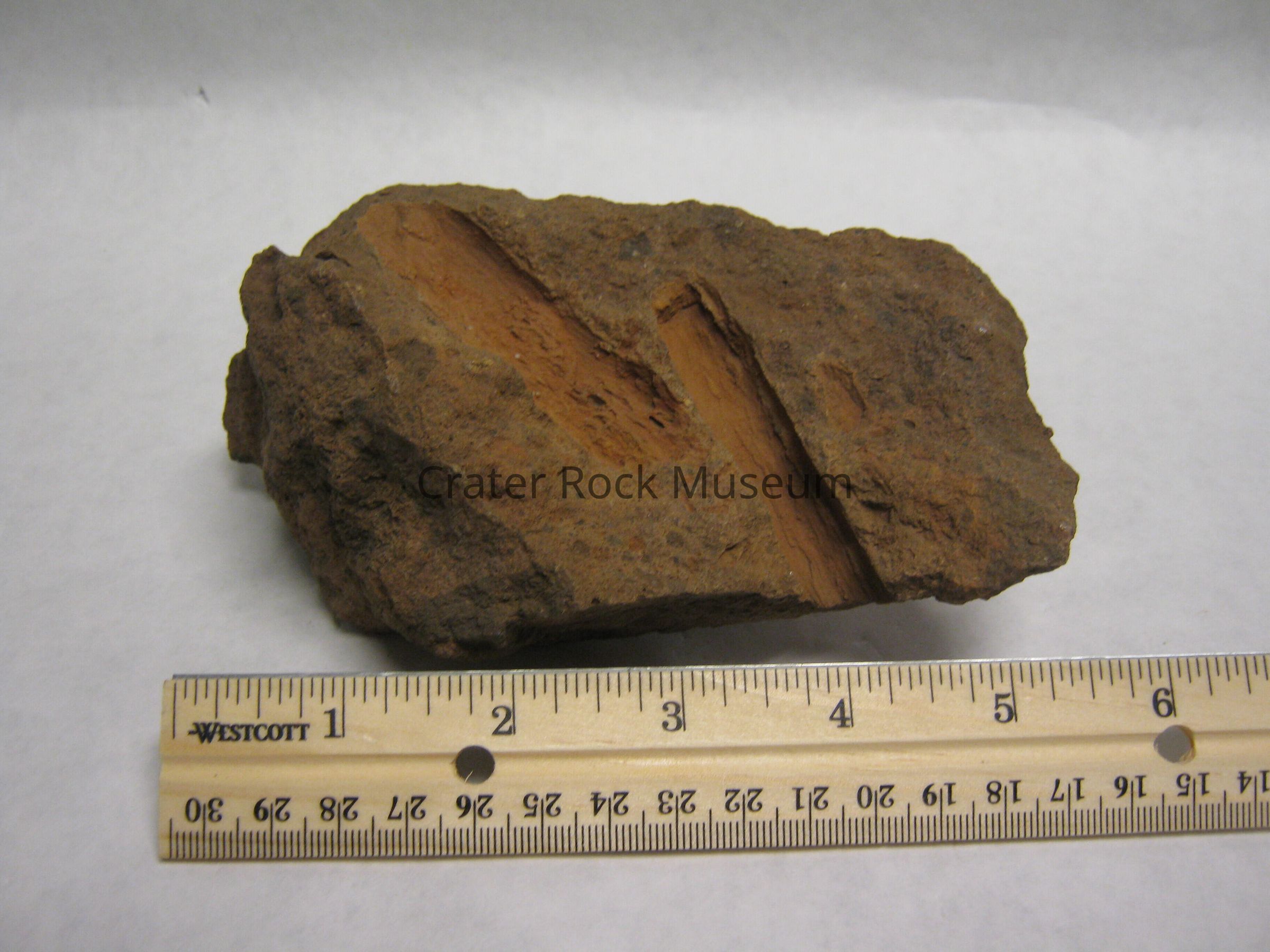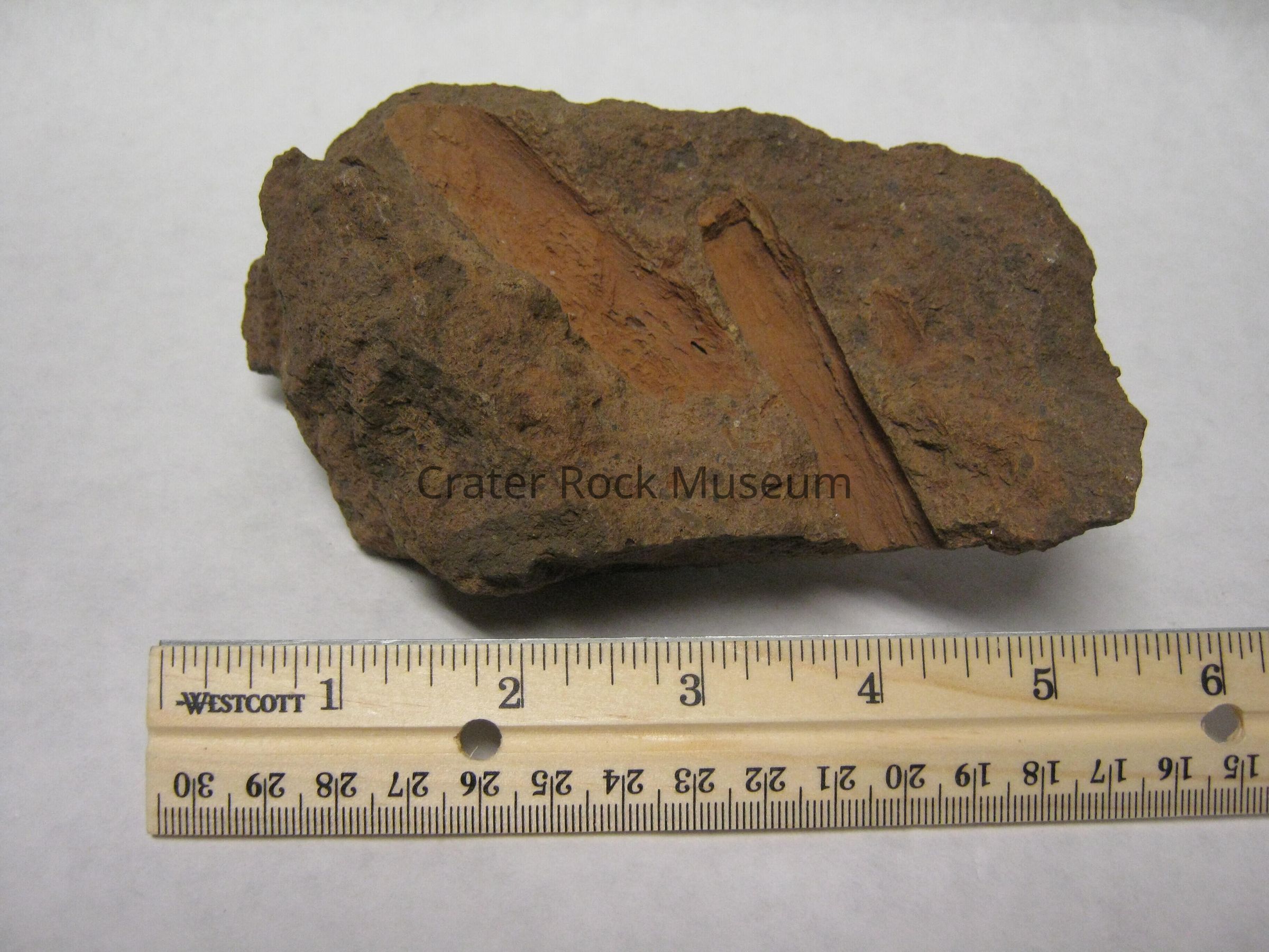 Description: Mold of a branch in volcanic tuff, shades of browns to reddish browns