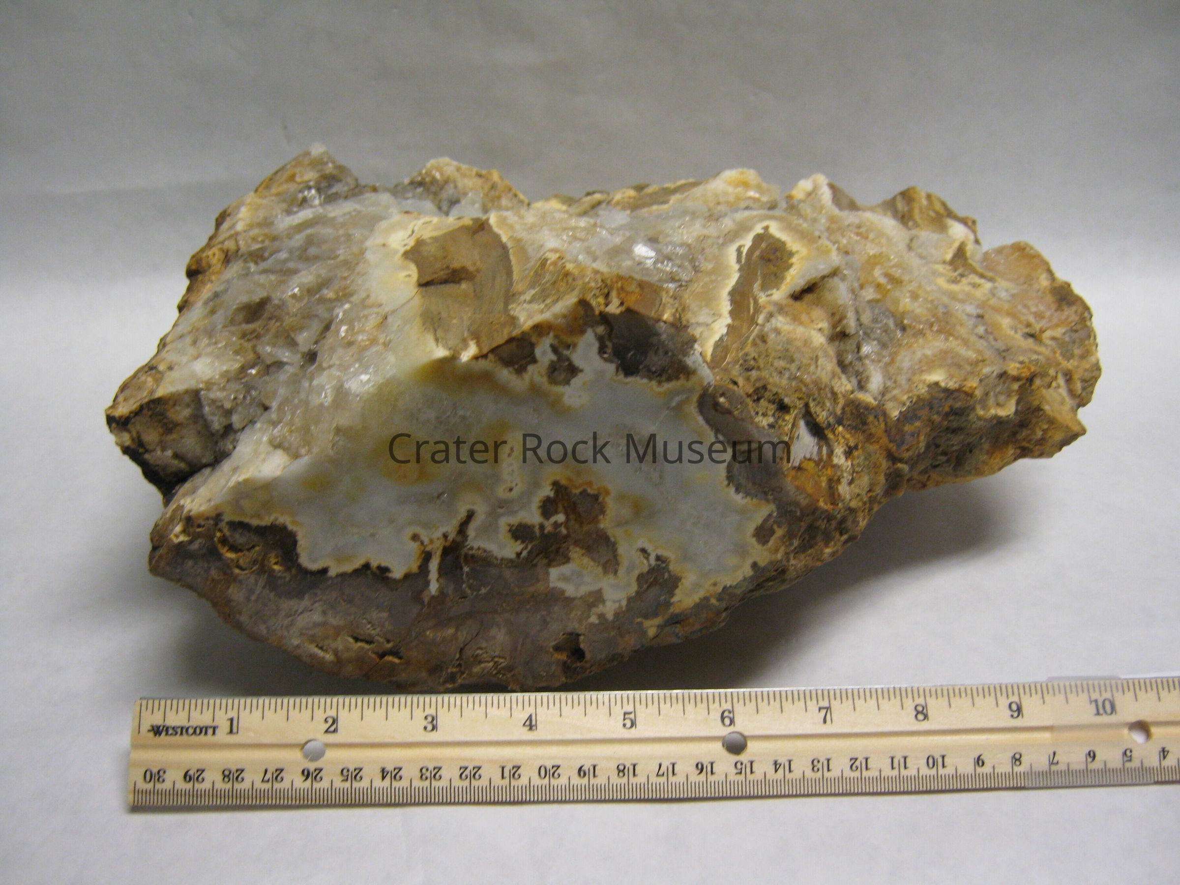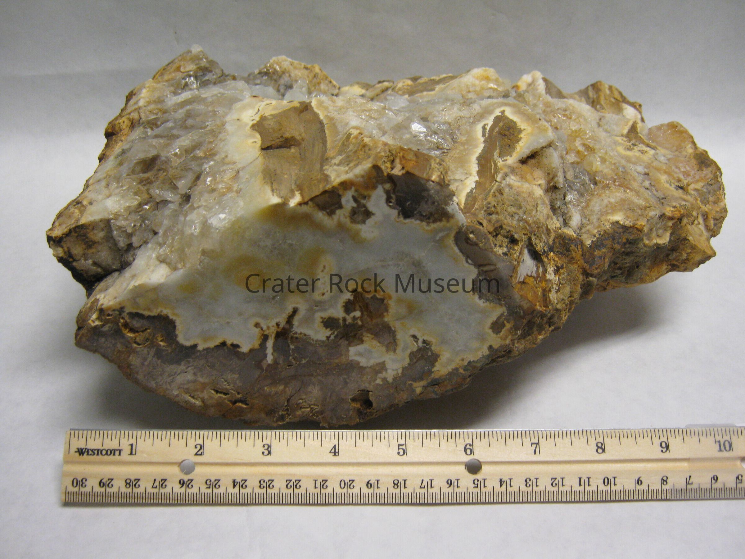 Description: A one of a kind specimen half of a round log with huge quartz crystals clear in color filling in what was the log's central chamber. The cut faces are cream, brown, yellow, tan and white jasper & agate.