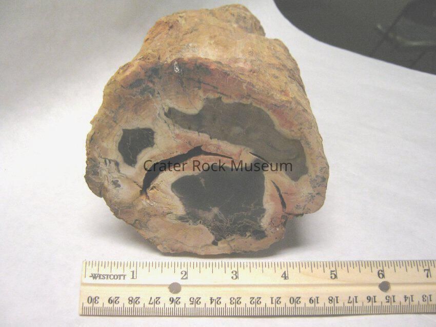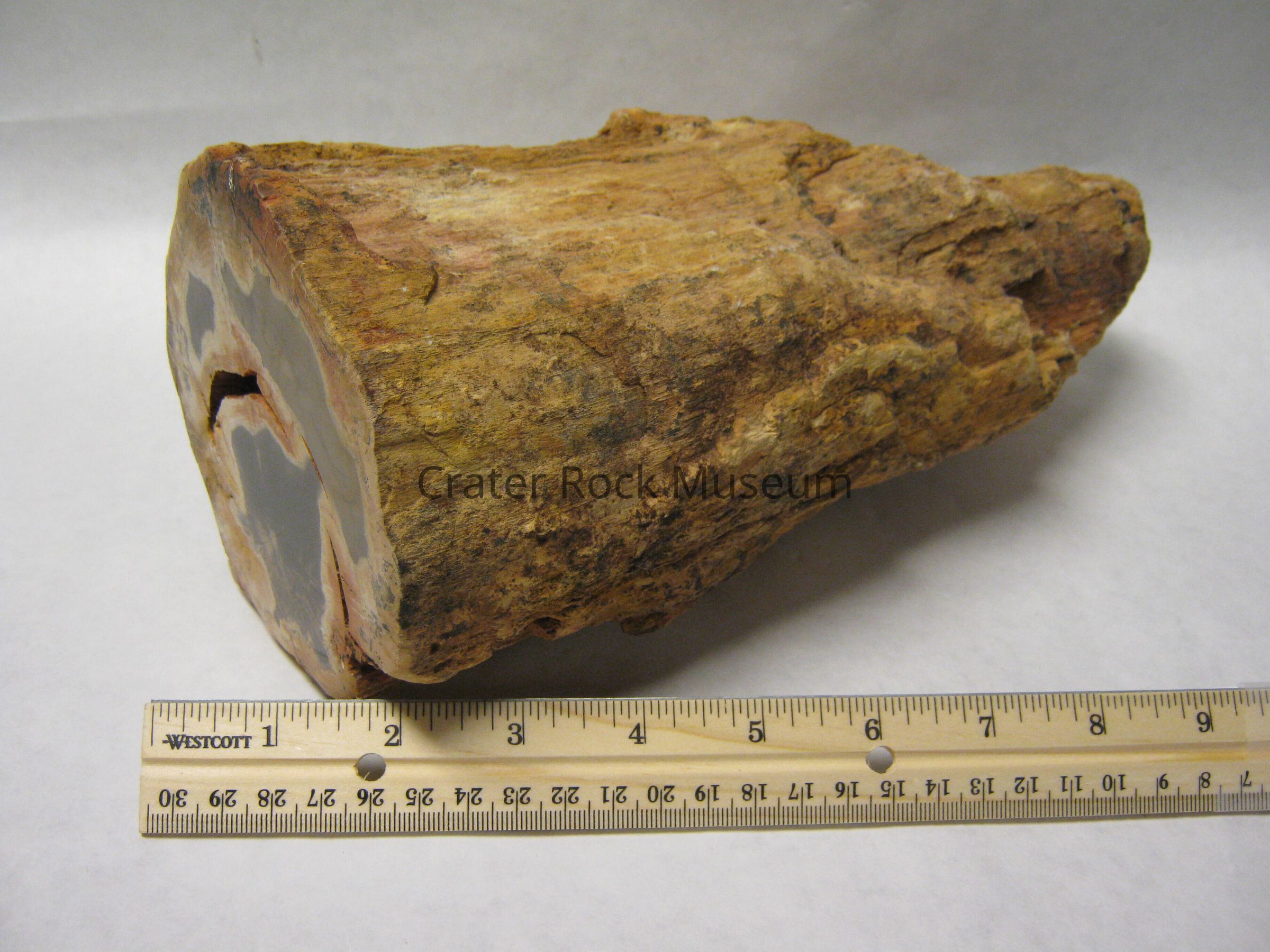 **This basswood limb from Sweethome, Oresgon shows several cresent-shaped pressure cracks caused by the weight of overburden pushing down on the limb before it wes fossilized. Had amorphous silica later re-entered this limb, these cracks most likely would have been filled with quartz..