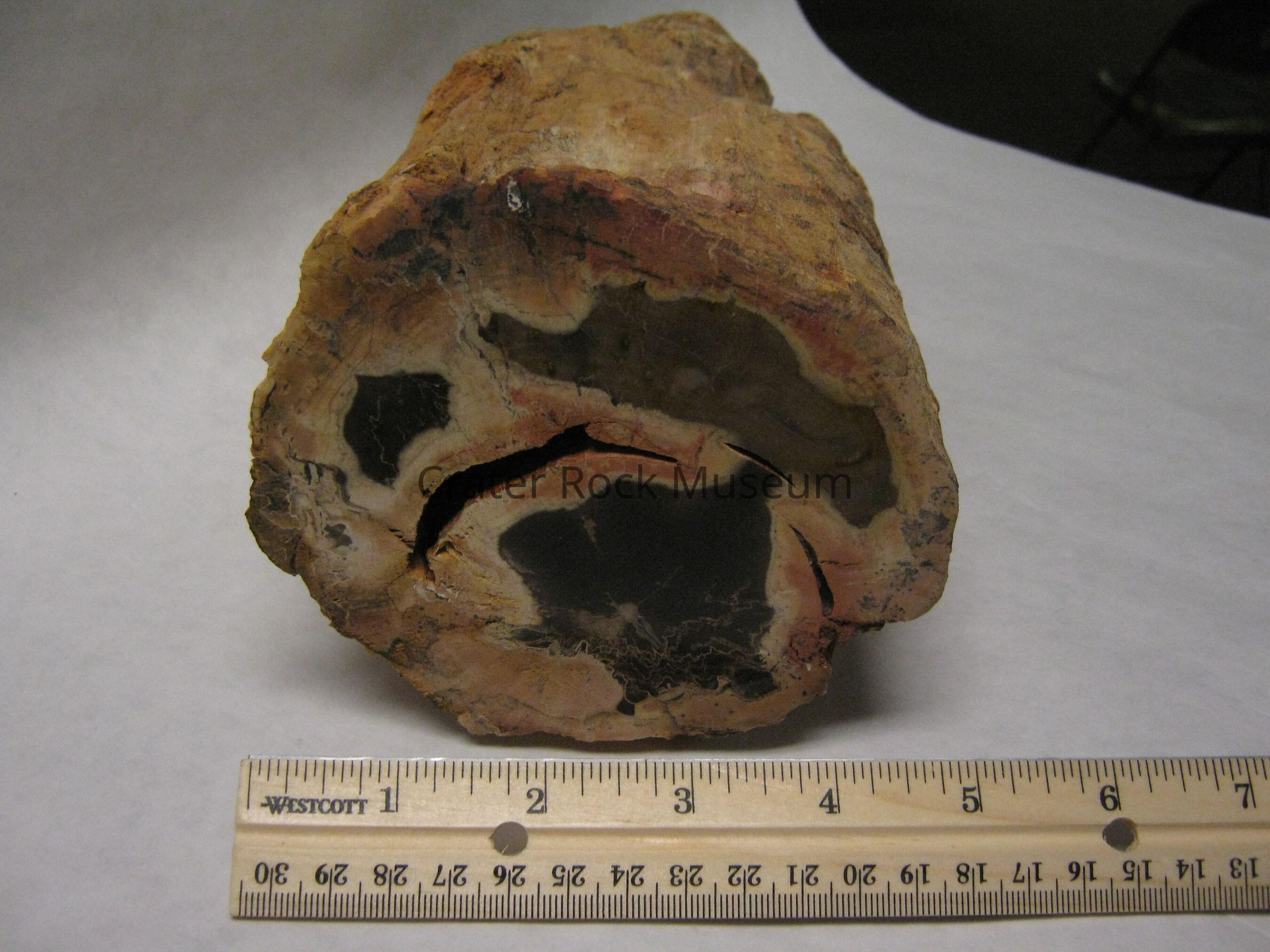 Description: Outer cast is a pinkish tan with a bark texture, the polished face shows growth rings with colors ranging from beige, pinkish tan, and brown
