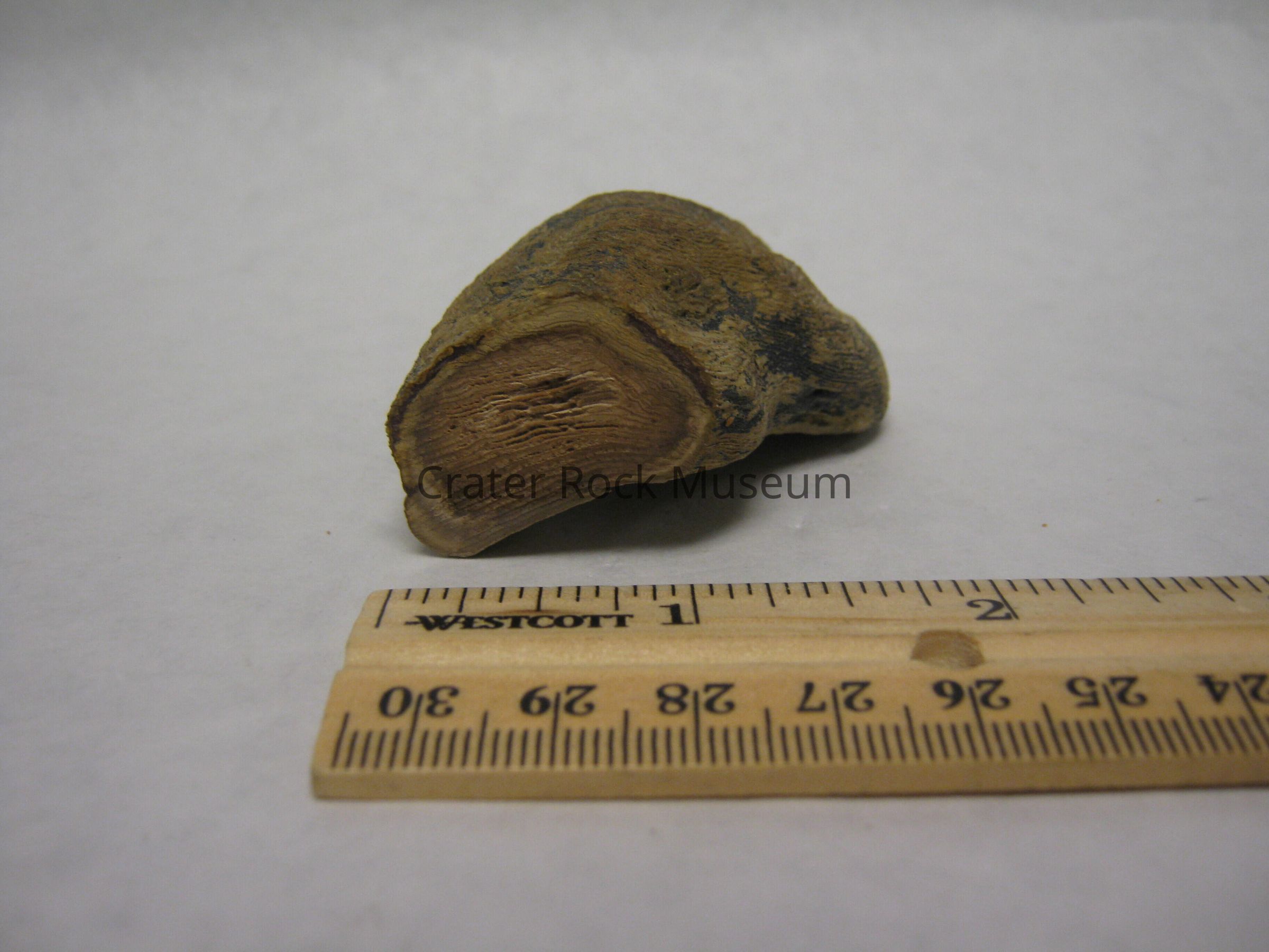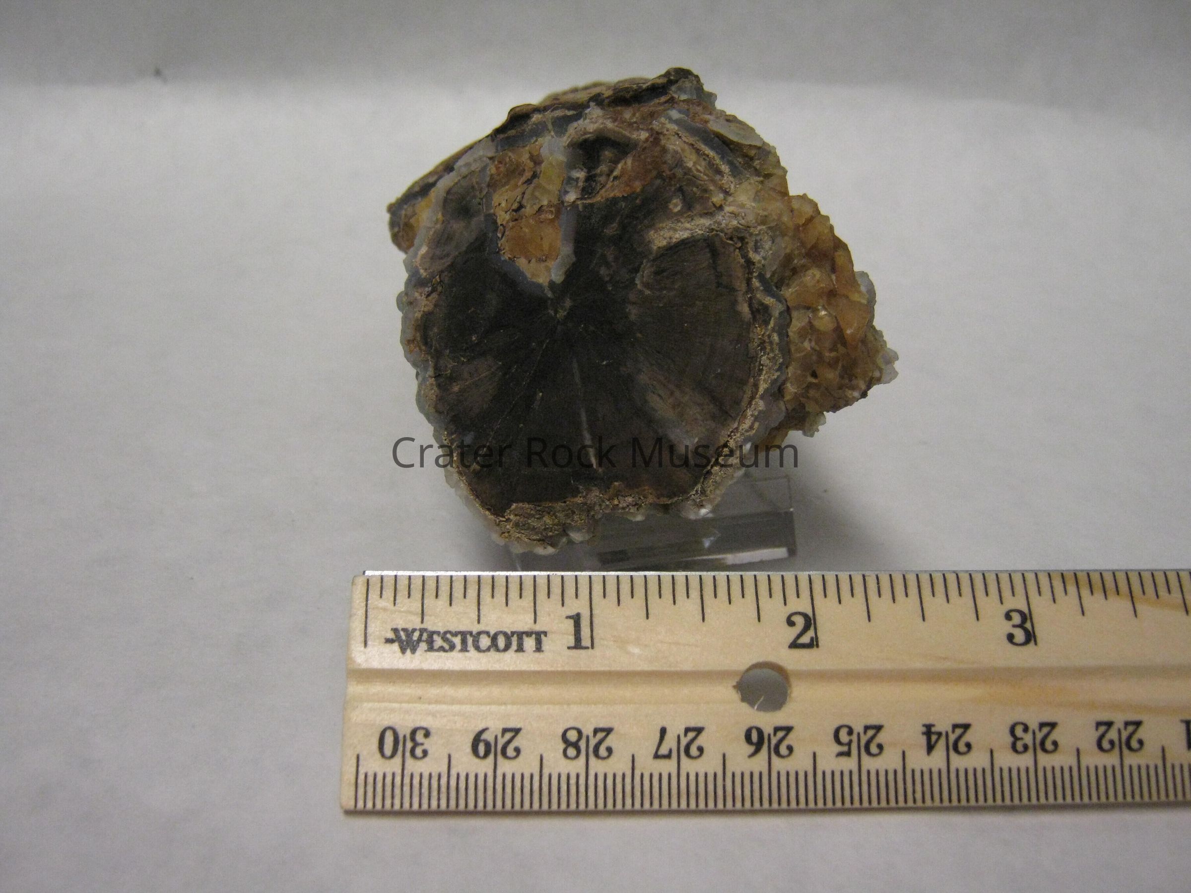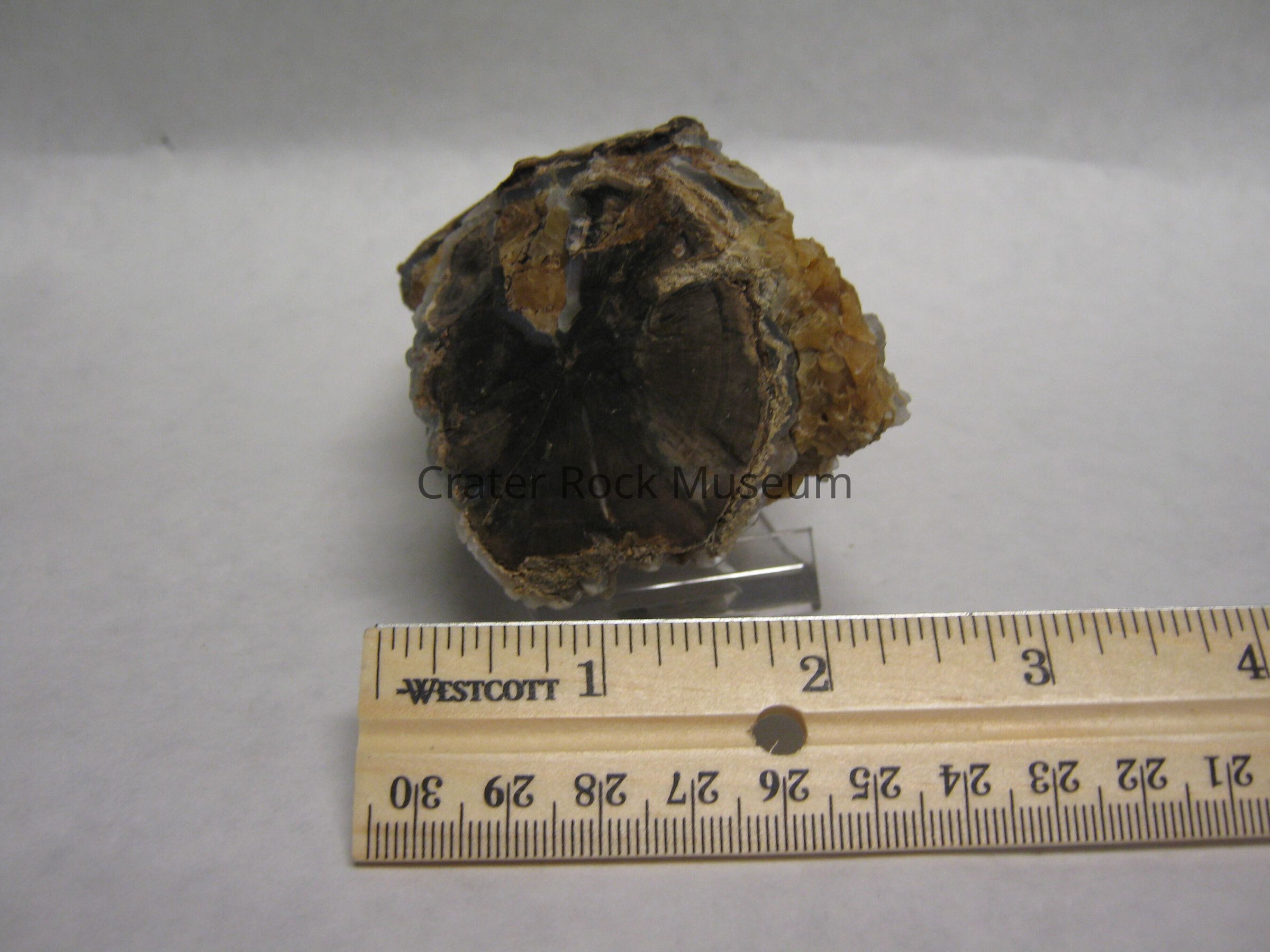 Description: The limb shows the formation of calcareous rock attached to the outerside with grey botrytoidal and yellowish crystal along with a bark appearance in tan. The inner limb is in brown shades with growth ring and rays.