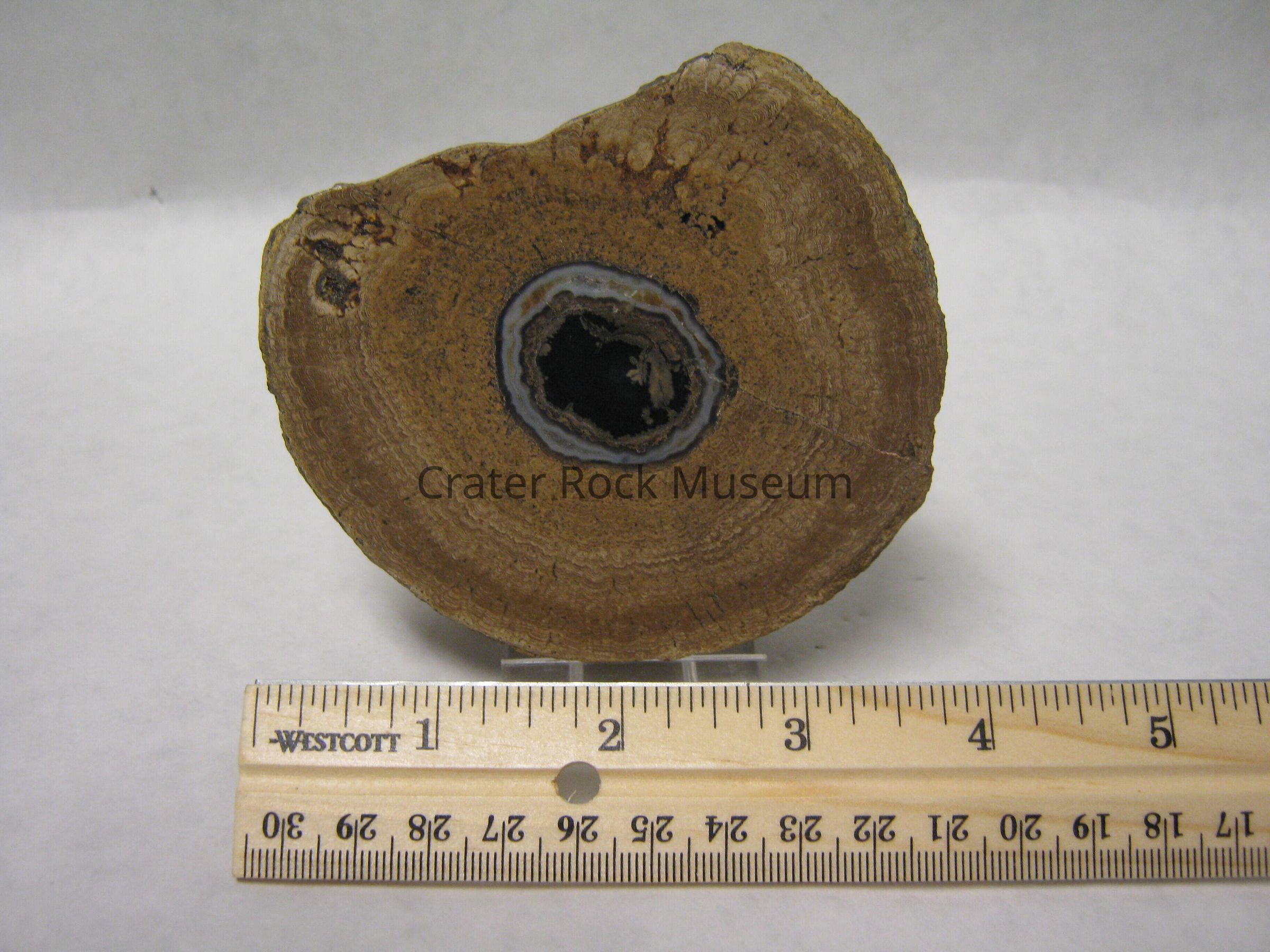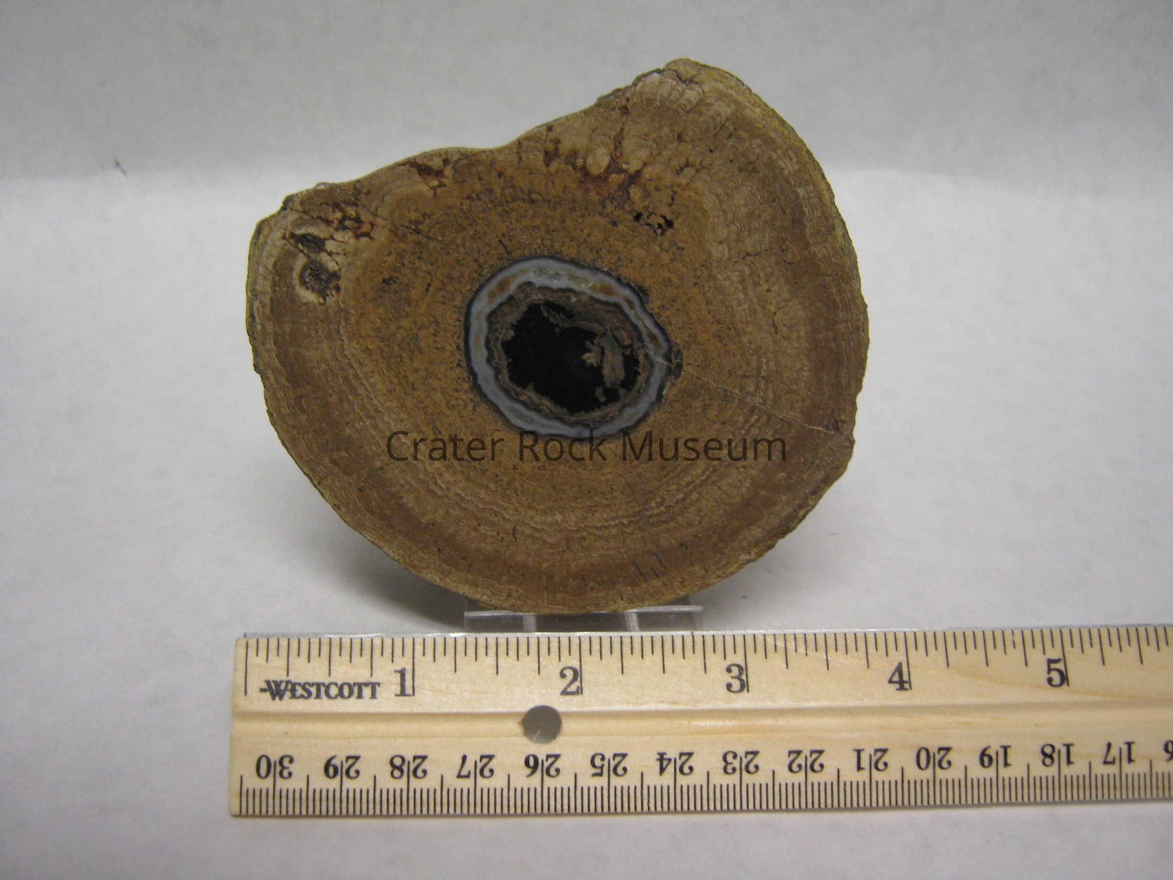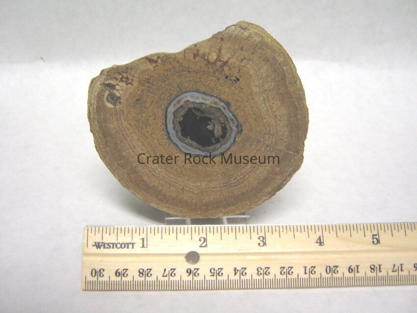 Description: From the Green River formation in the mid-eocene (55 mya) petrified when the branch fell into the ancient lake where it was covered with blue-green algea which petrified the branch - demonstration of field condition. Outer cast is tan with very little a bark texture seen, the polished face shows growth rings with colors tan to a darker brown in the center, there is also a clear ring of crystalized agate around the dark brown center