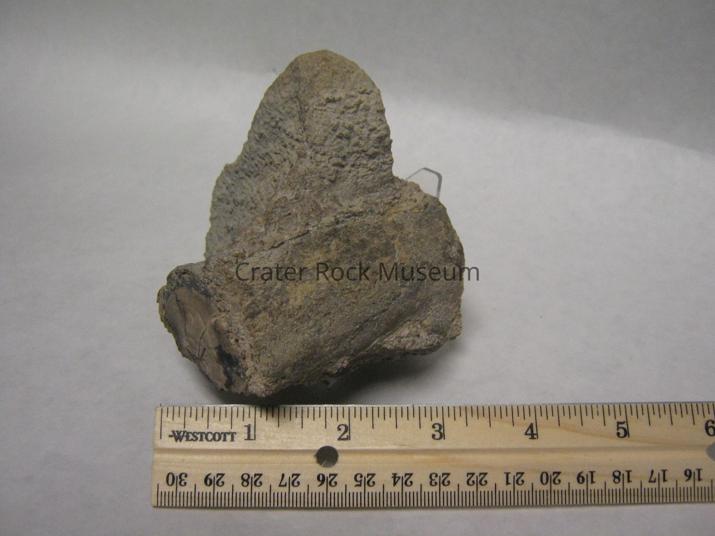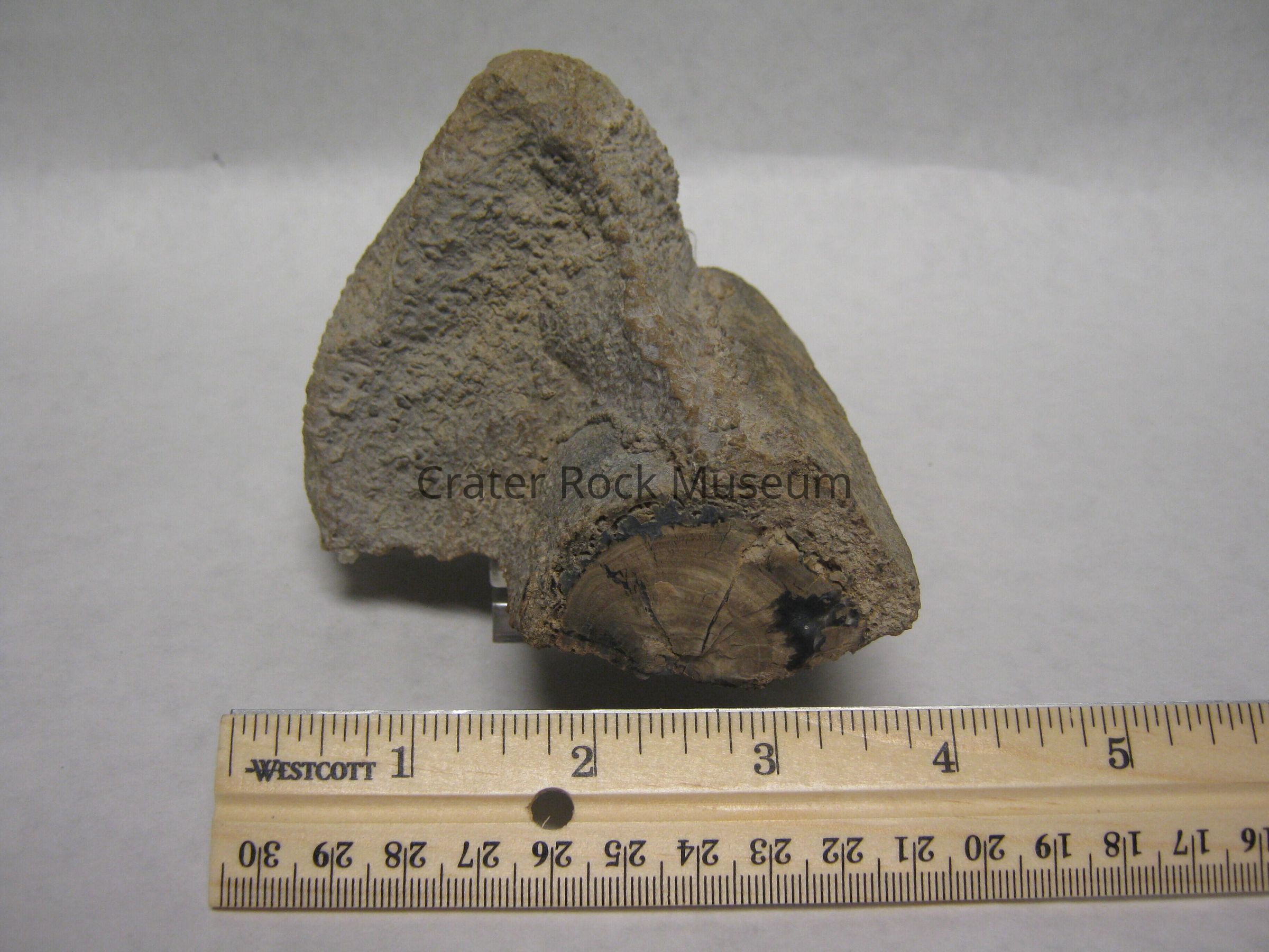 Description: Volcanic ash surrounding the tree limbon one side, colors whitish-beige calcareous rock sediment . 3/4 of the limb is present with both side and face view of the limb shown, colors are shades of brown and tans, and growth rings, rays can be seen, also there are crystal pockets on the side of the limb