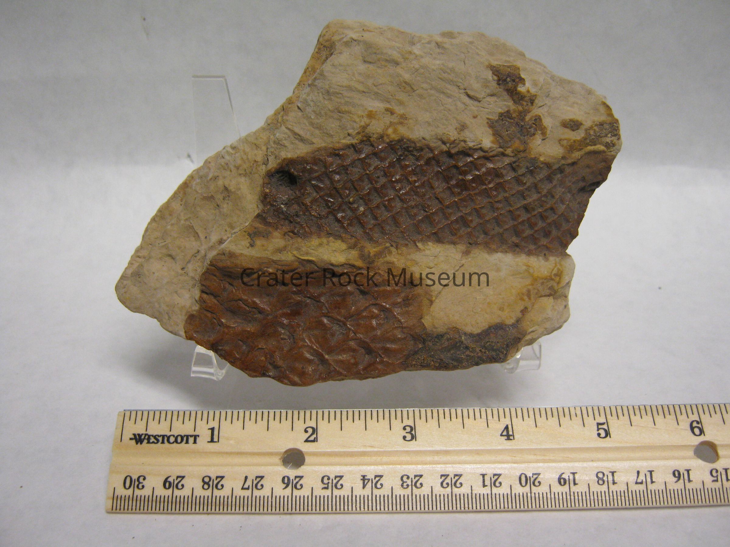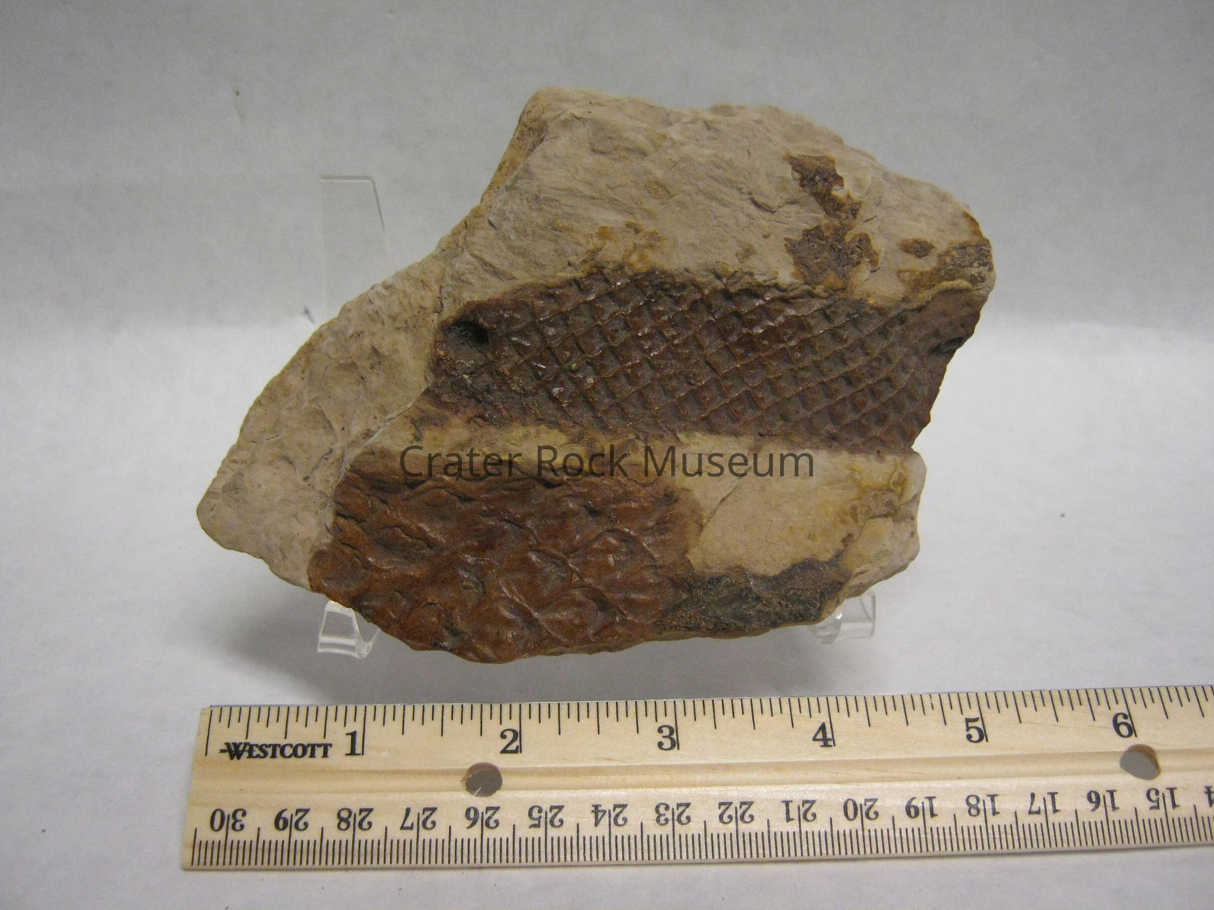 Description: two impression of the outer scales of two lepidodendron tree branches, tan and rustie-brown