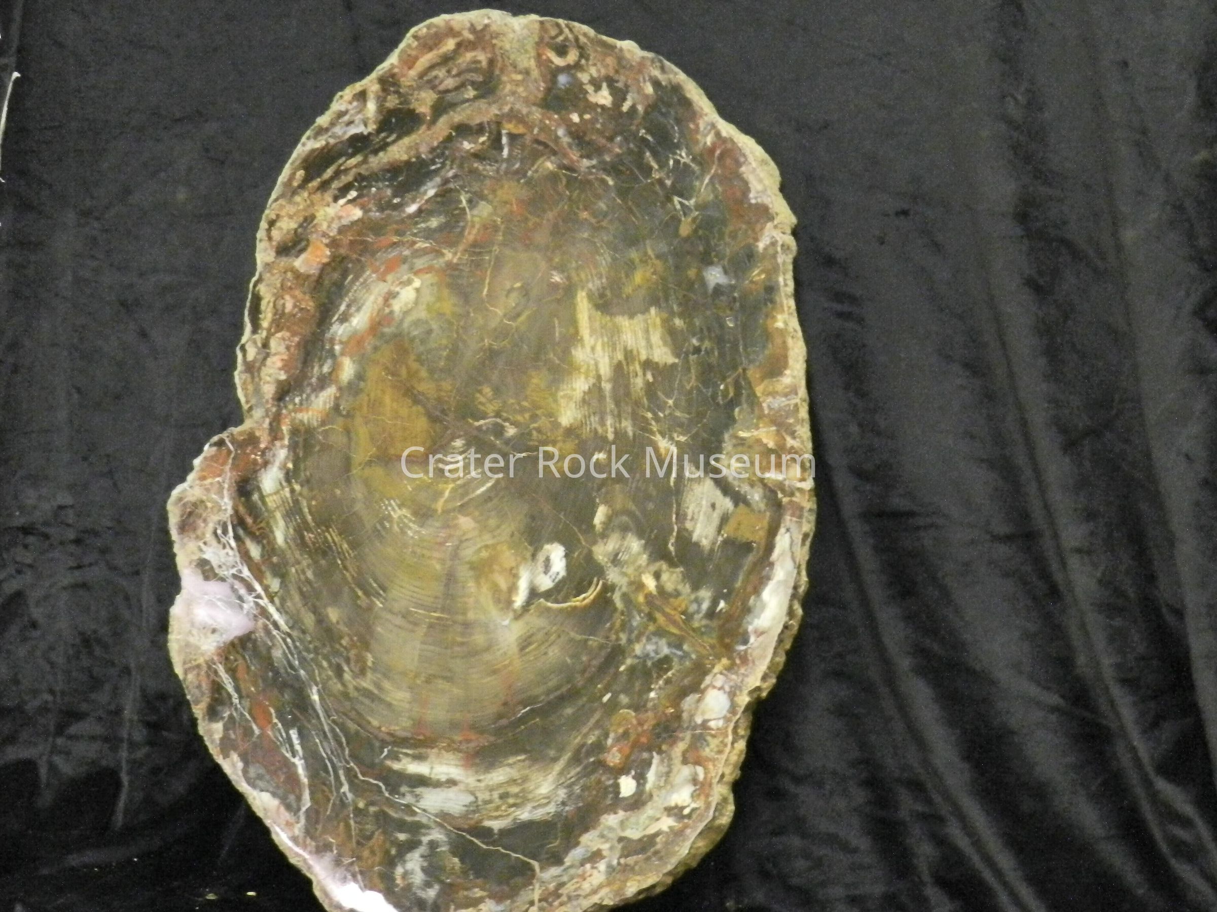 Description: Large polished slab of a complete round colors mostly browns with tan, white and red. Growth ring can be clearly seen.