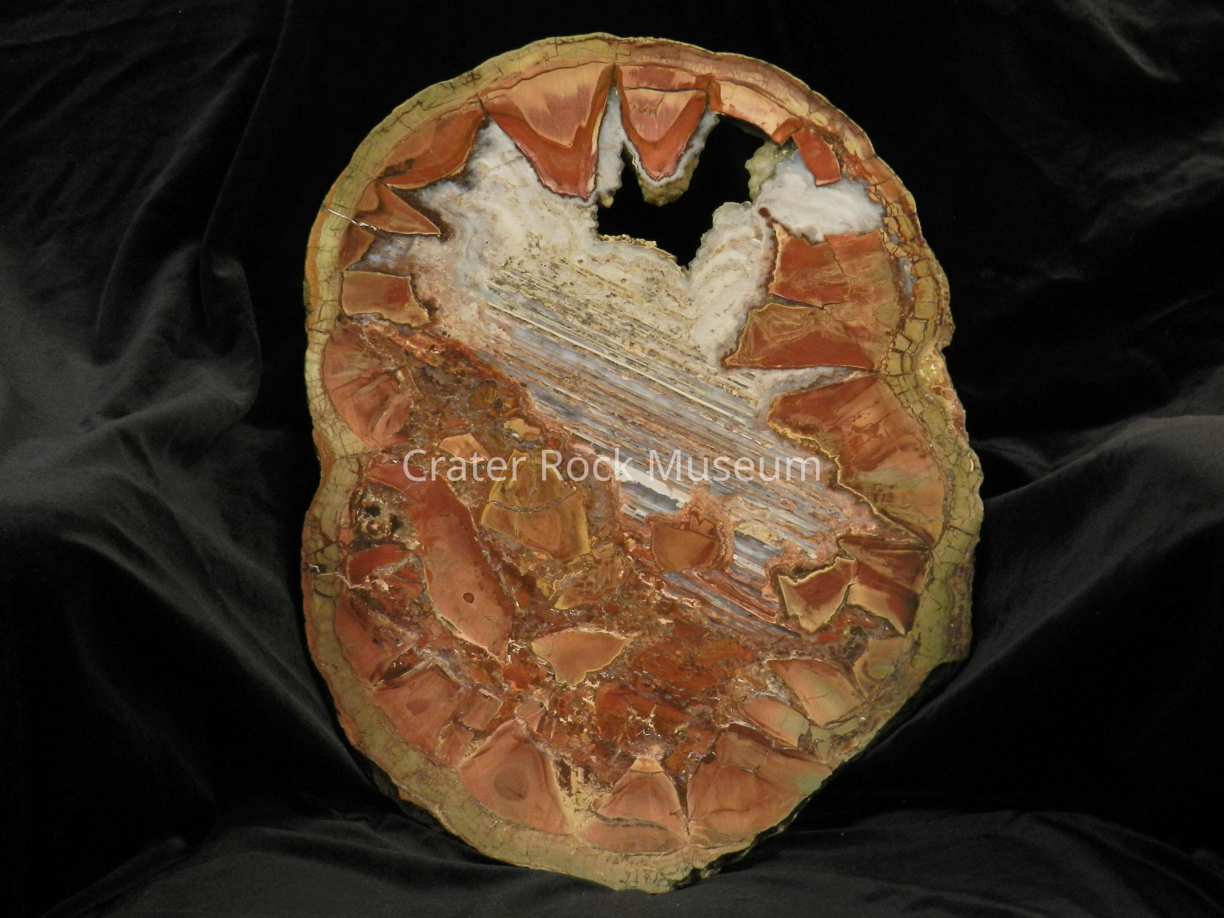 Occurrence: Thundereggs are only found in areas of previous volcanic activity . As silicic lavas poured out on the ground, the gasses made it frothy and bubbly . The lava cooled and over a period of millions of years, became buried . Water, which contains many minerals including silica, penetrated the gas pockets through a crack in the nodule. As water slowly dissipated, the solution deposited agate ( chalcedong SiO2 ) .