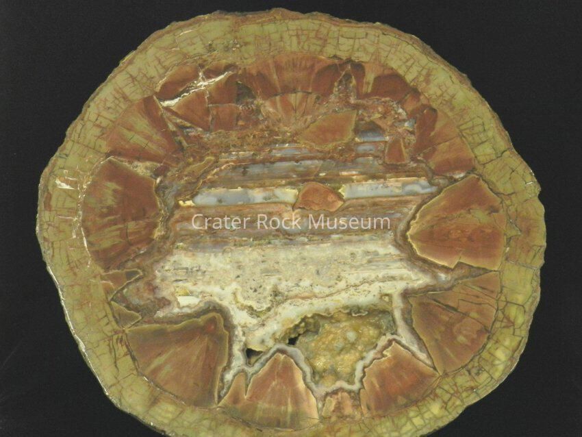 Description: Polished slice, colors greenish-tan, red to pink, beige, white and clear