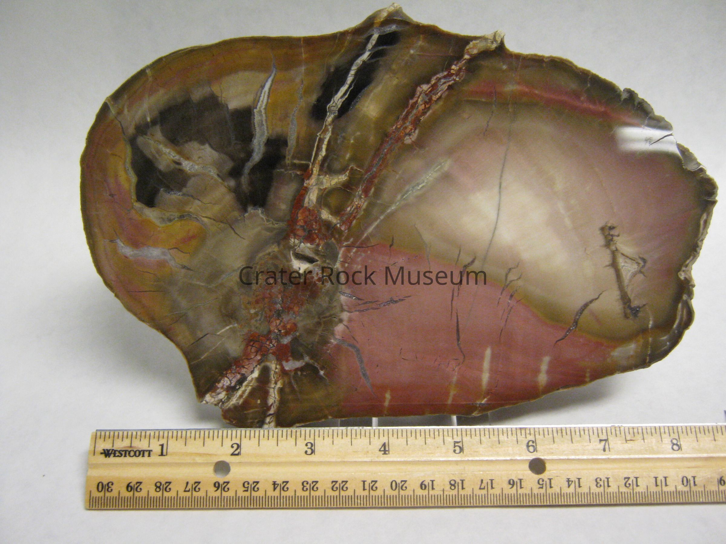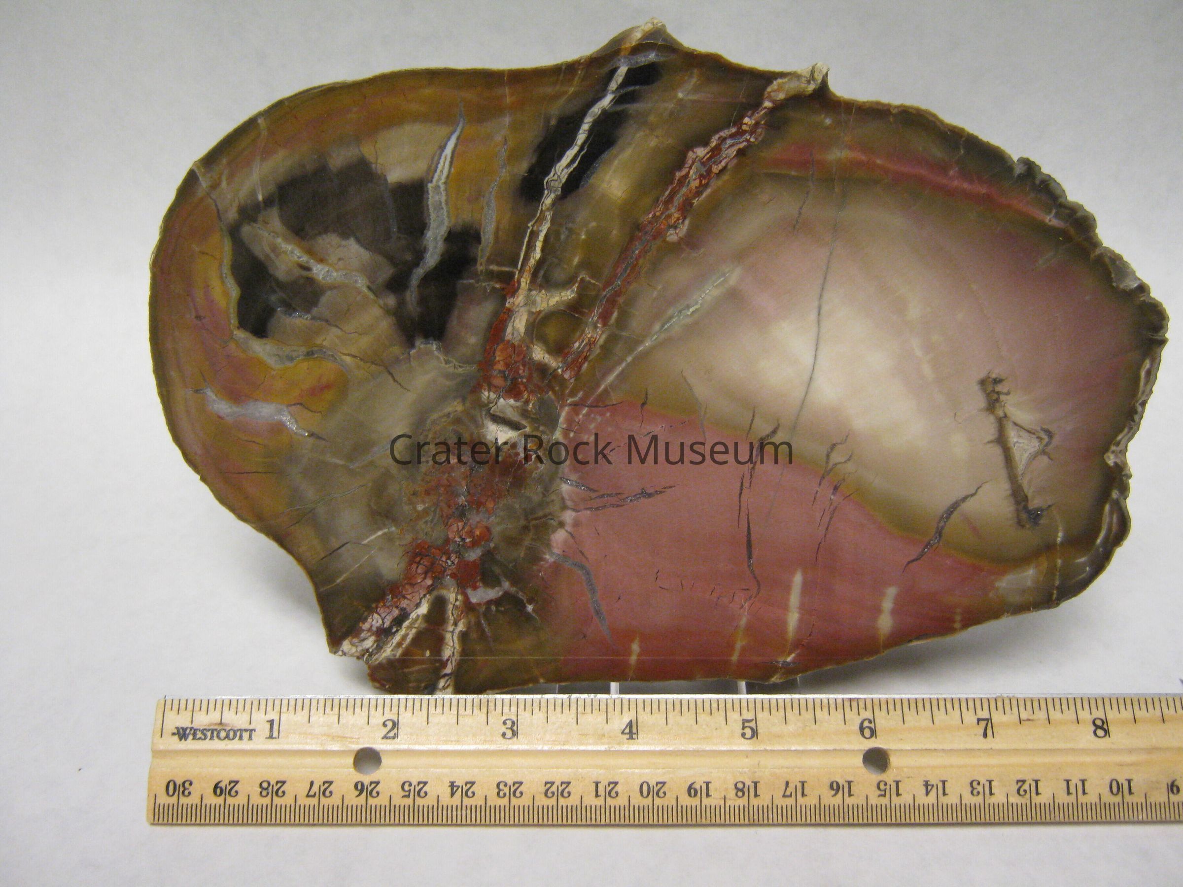 Description: Polished cut slab with colors white, beige, grey, black, brown and red, growth rings are apparent