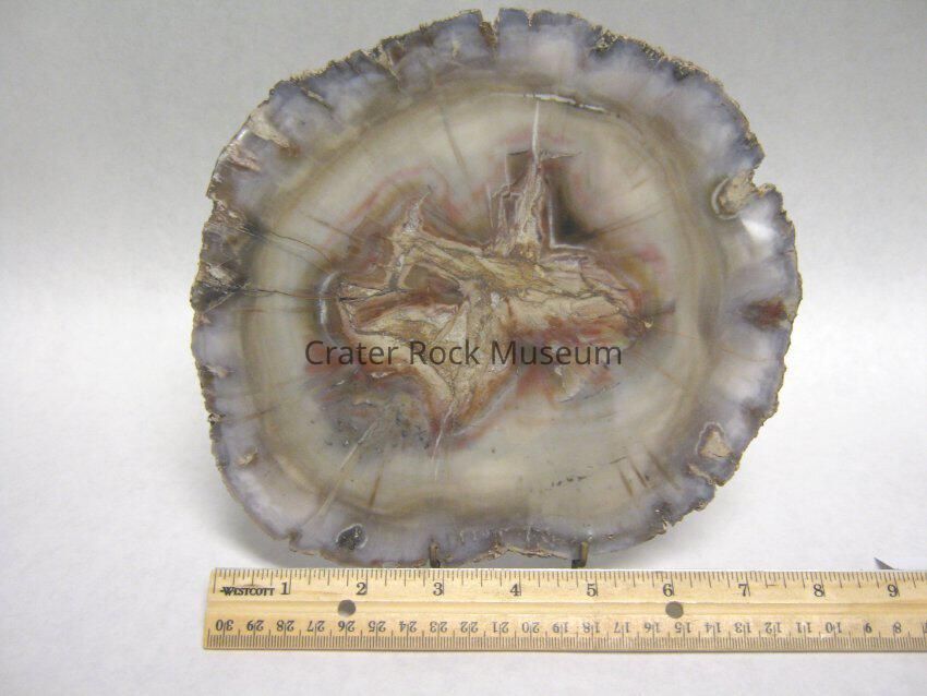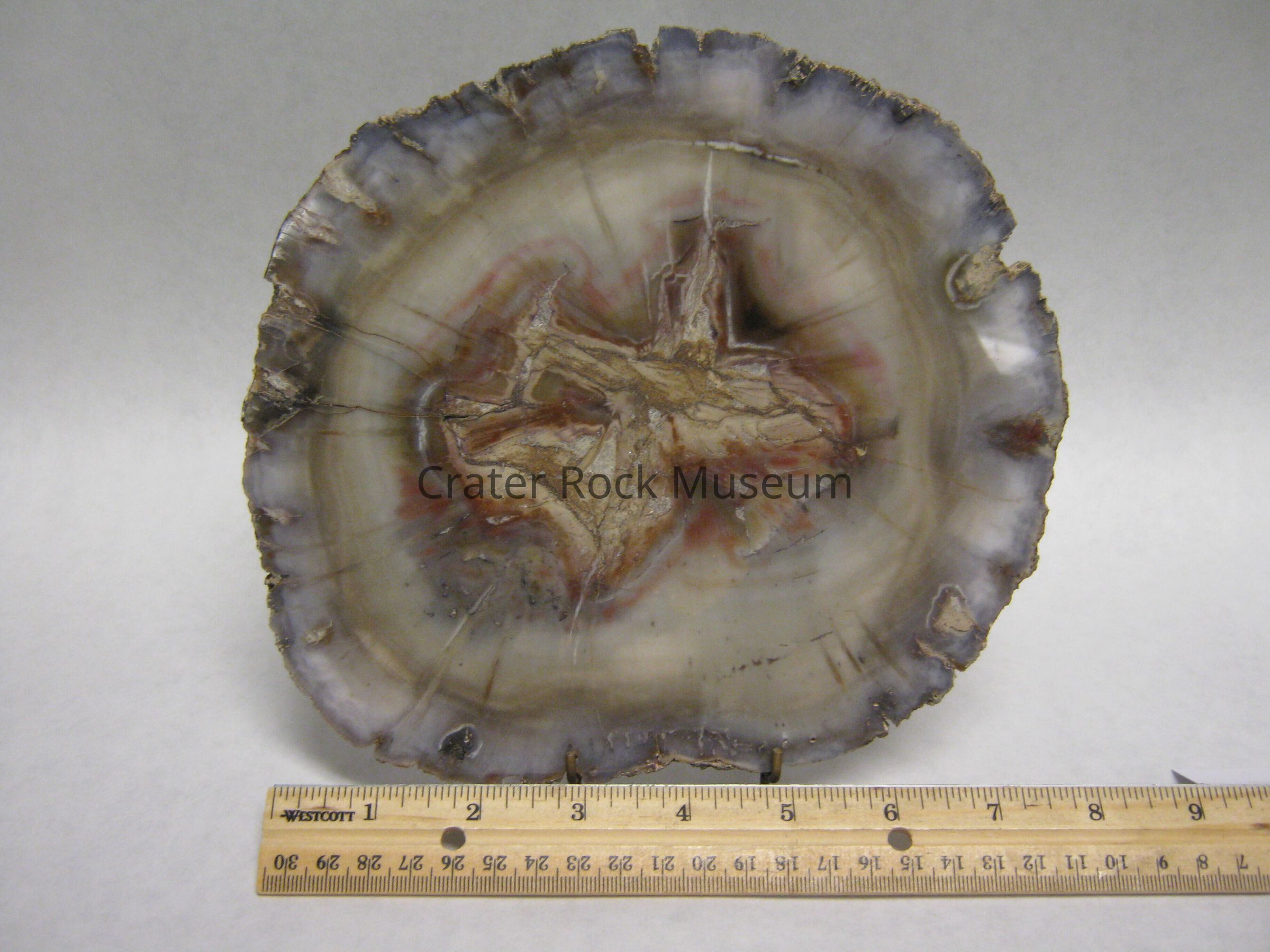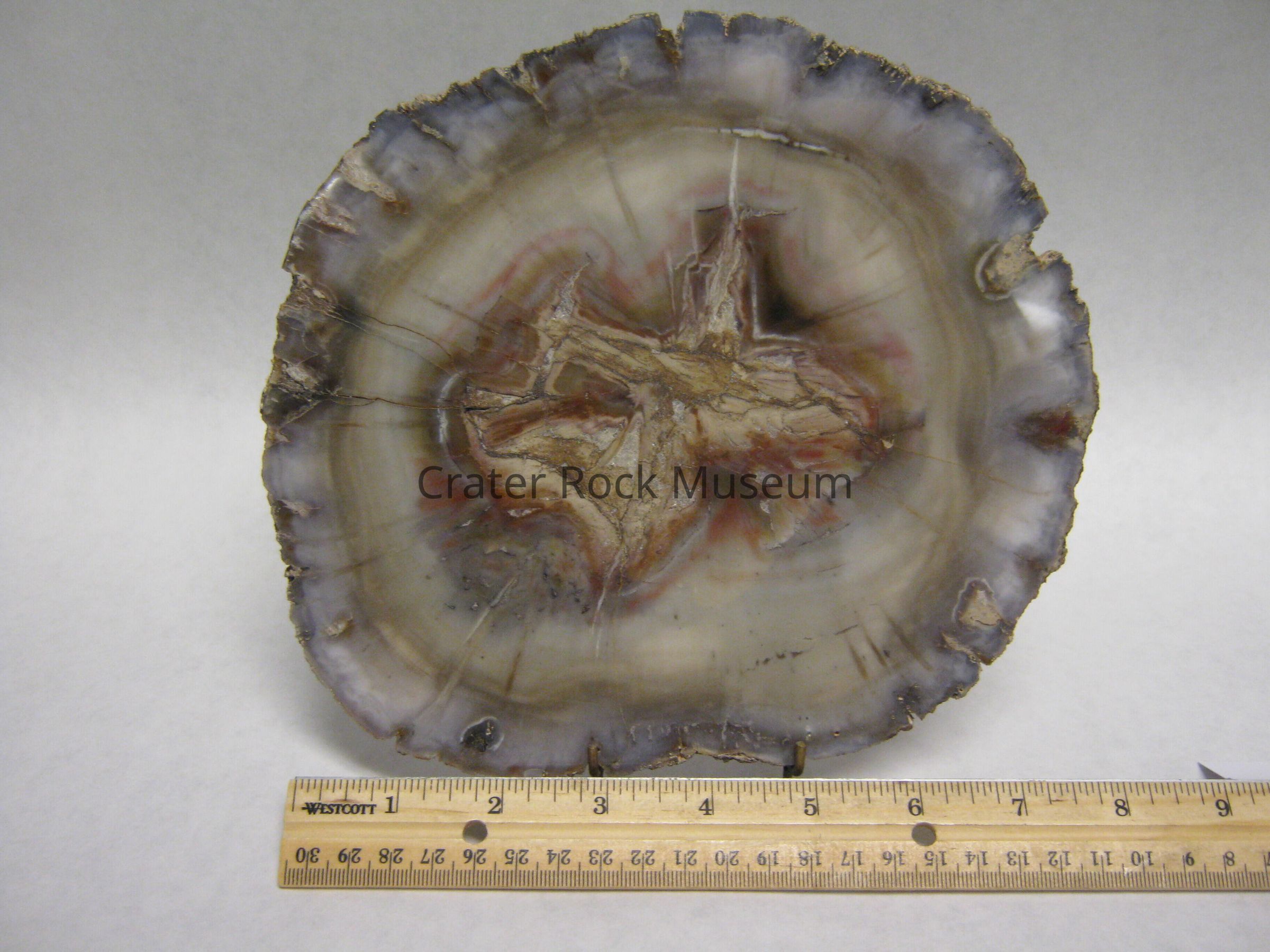 Description: Delmar describes this pieces as 1/2" (1.2cm) thick slice of petrified wood , variety "Woodworthia" from east central Arizona. Tropical variety. Polished side shows an opaque center with jagged edge in beige, silver and brown wood, some red, surrounded by agatized wood in beiges with some pink and grey (with inclusions) at outer edge. Several cracks visible. Probably from Jurassic period (Mesozoic era)