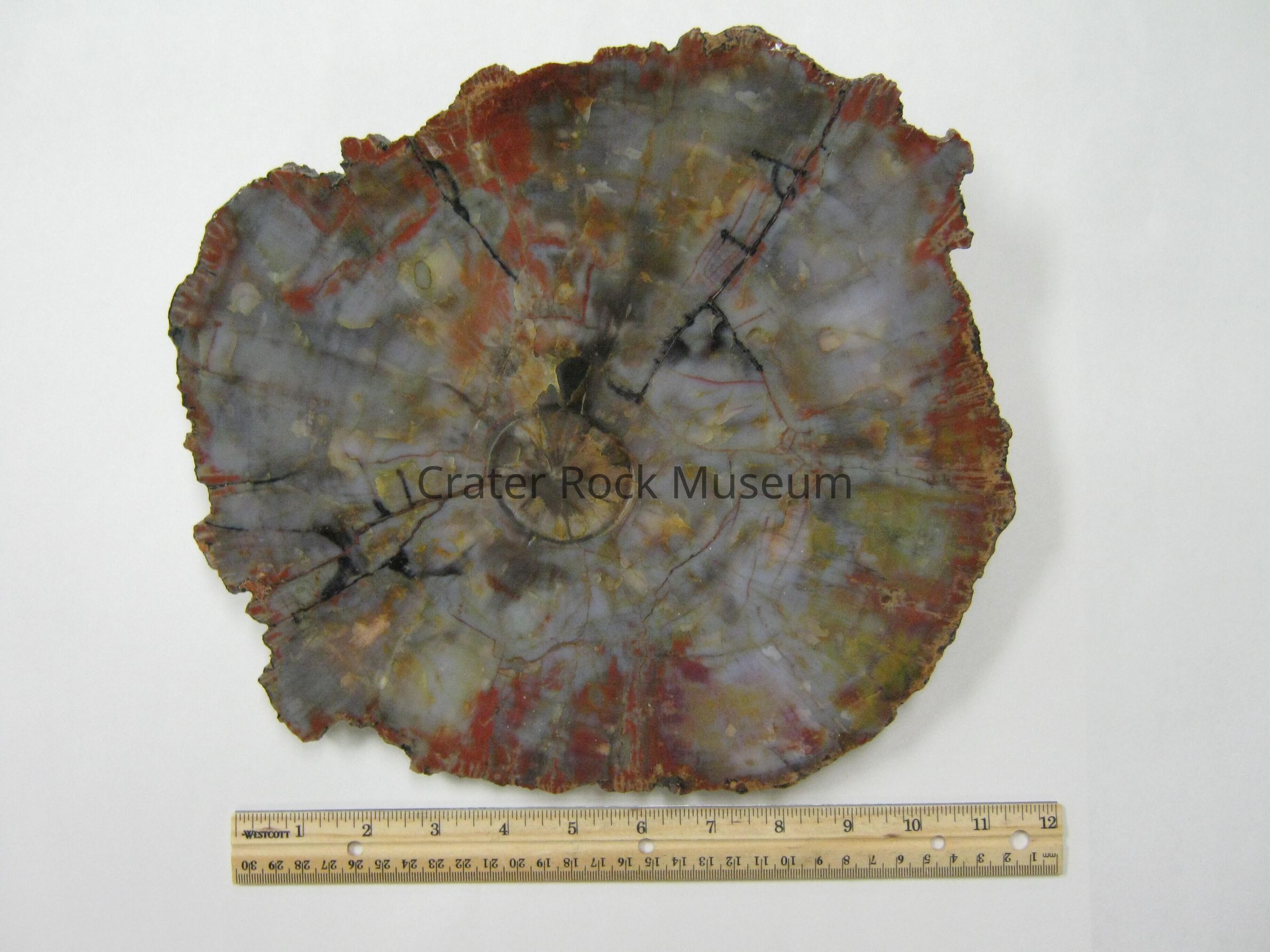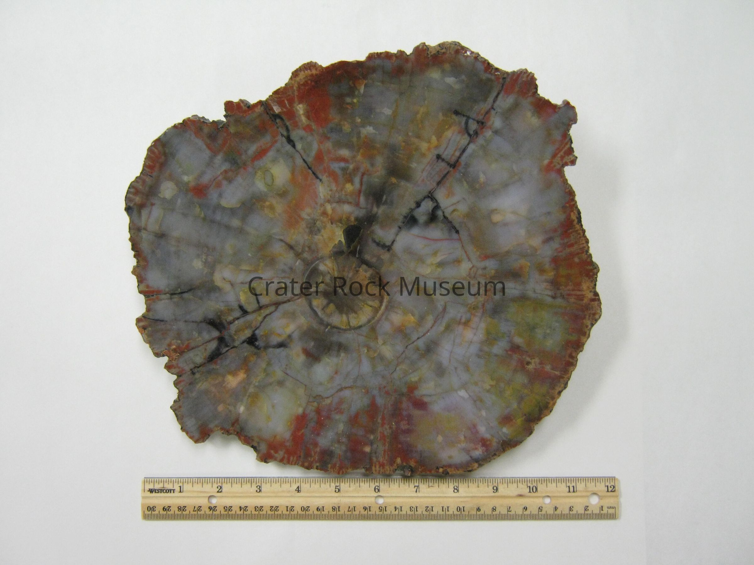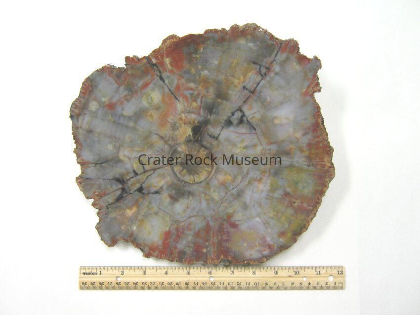 Description: Polished face shows colors of white, orange, yellow, black, brown, grey, purple and pinkish tones, growth rings are apparent. The slab is a complete round