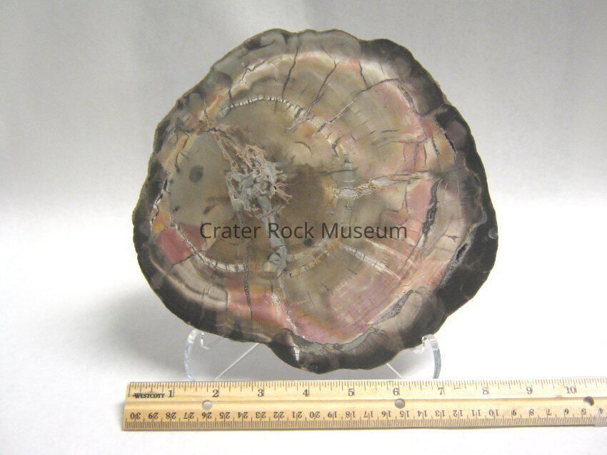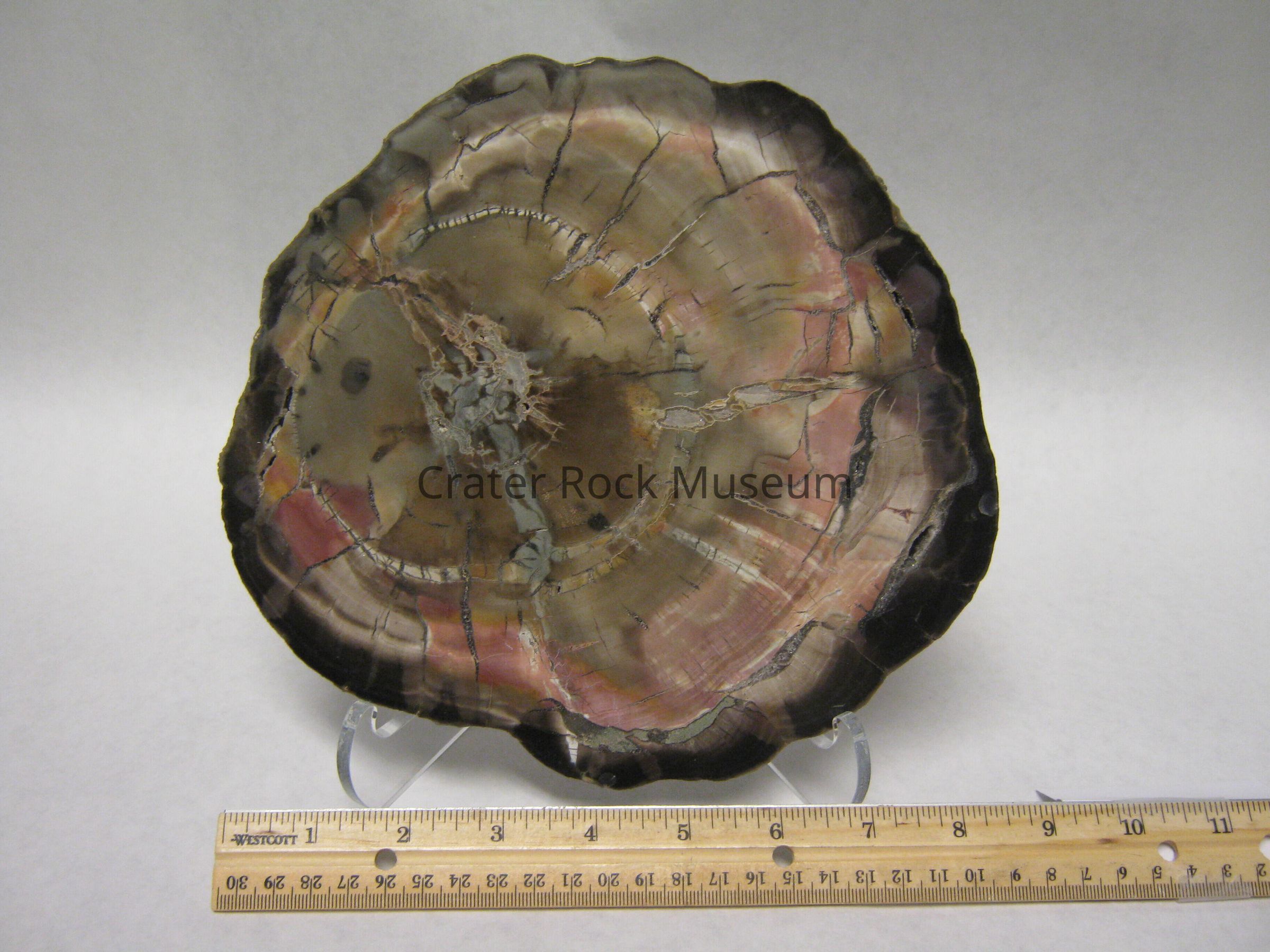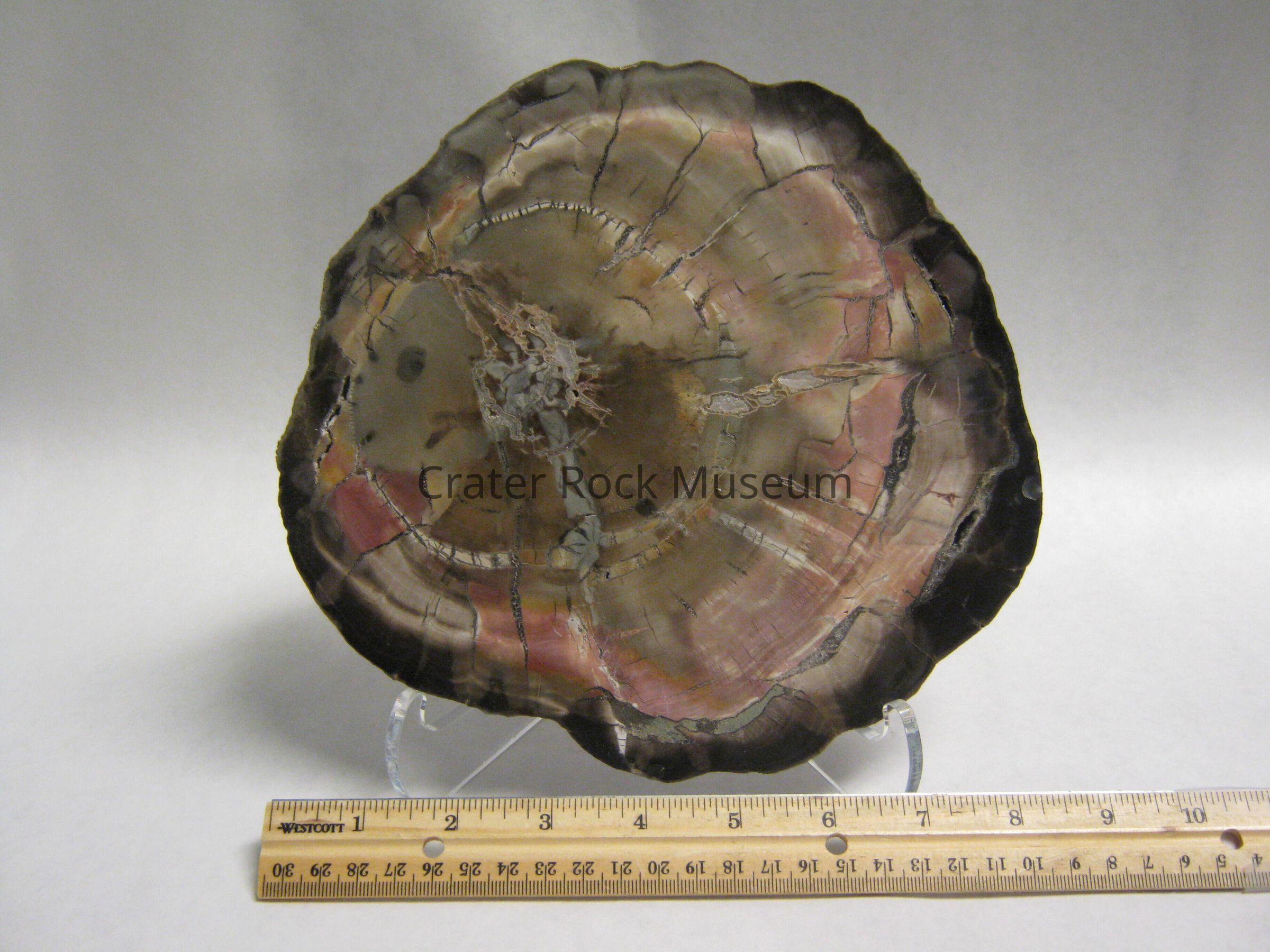 Description: Polished cut slab with colors white, grey, black, brown and pink . The growth rings are apparent and the slab is a complete round