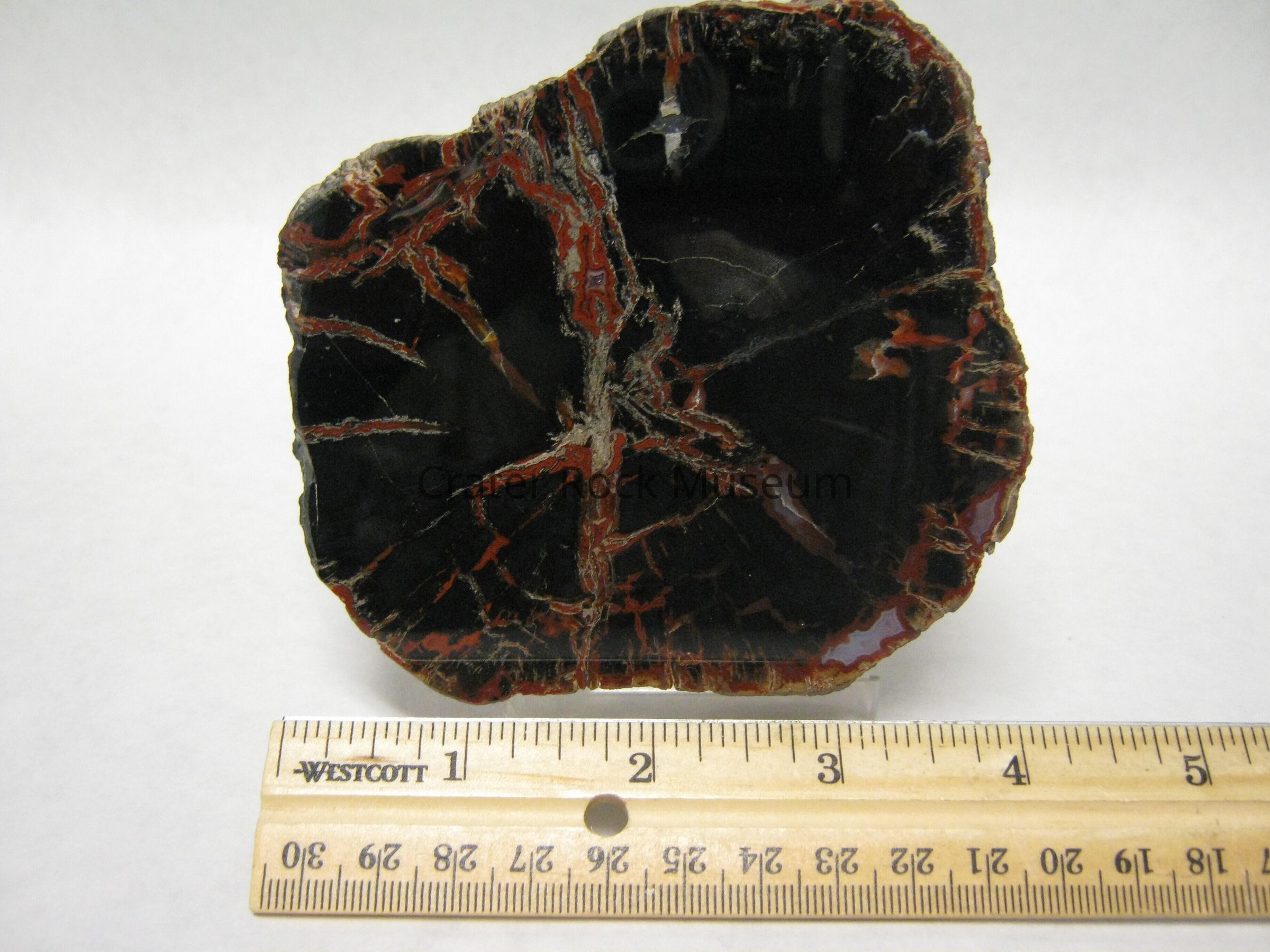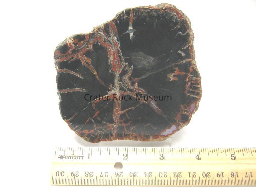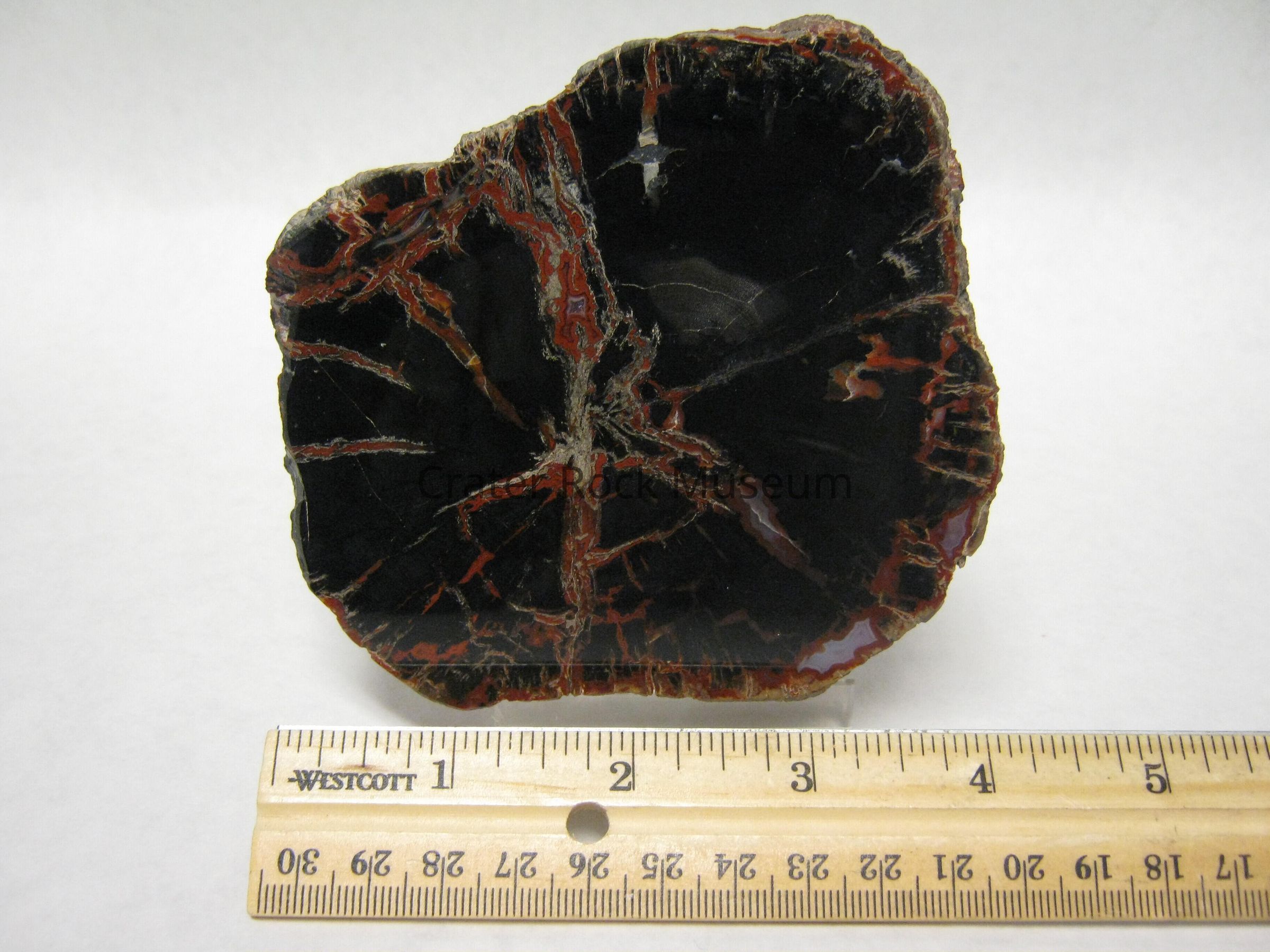 Delmar description: A 7/8" (2.2 cm.) thick slice of petrified wood from Utah. Polished side shows black wood with red stain and some grey silicate, some grey wood seen. Delmar believe this piece was from Jurassic but it is actually from the late triassic (Mesozoic era)