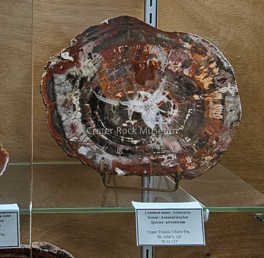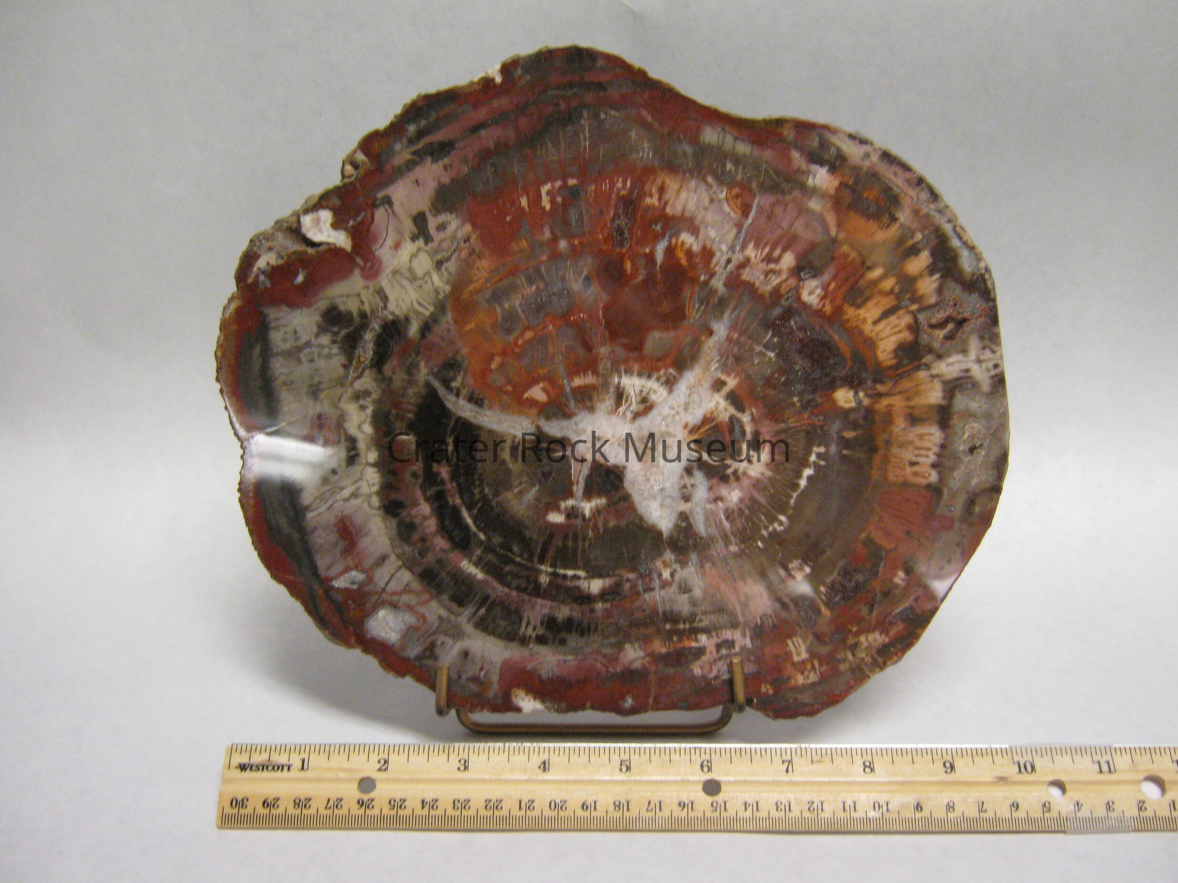 Description: Delmar describes this pieces as 7/16" (1.0cm) thick slice of petrified wood from Utah. Polished side shows brightly colored wood oranges, pinks and reds,greys, browns and black with large white crystalline cracks in center and crystalline patches in grey and red. Tropical tree. Delmar believes this piece was from Jurassic but it is from the late Triassic (Mesozoic era)