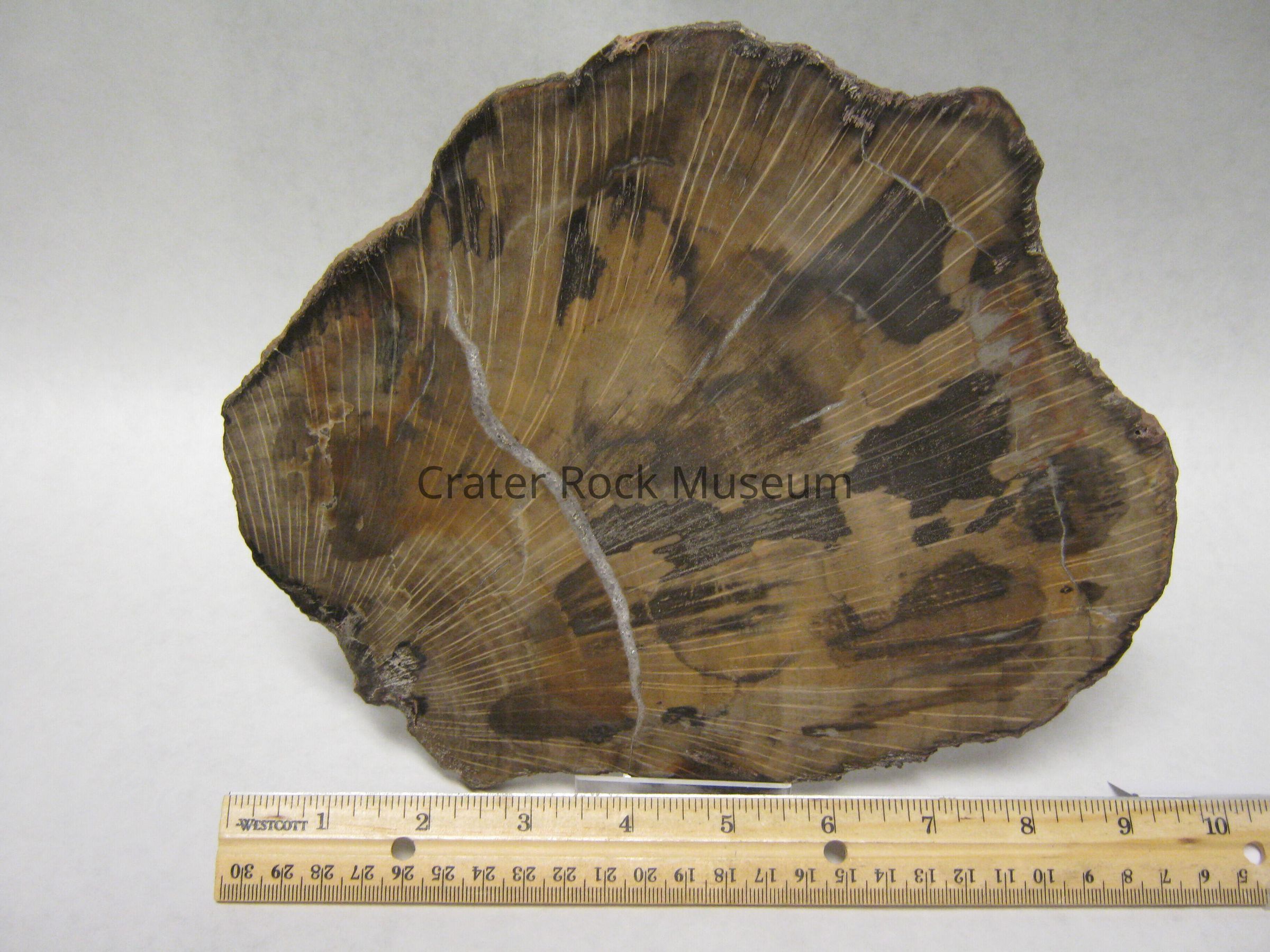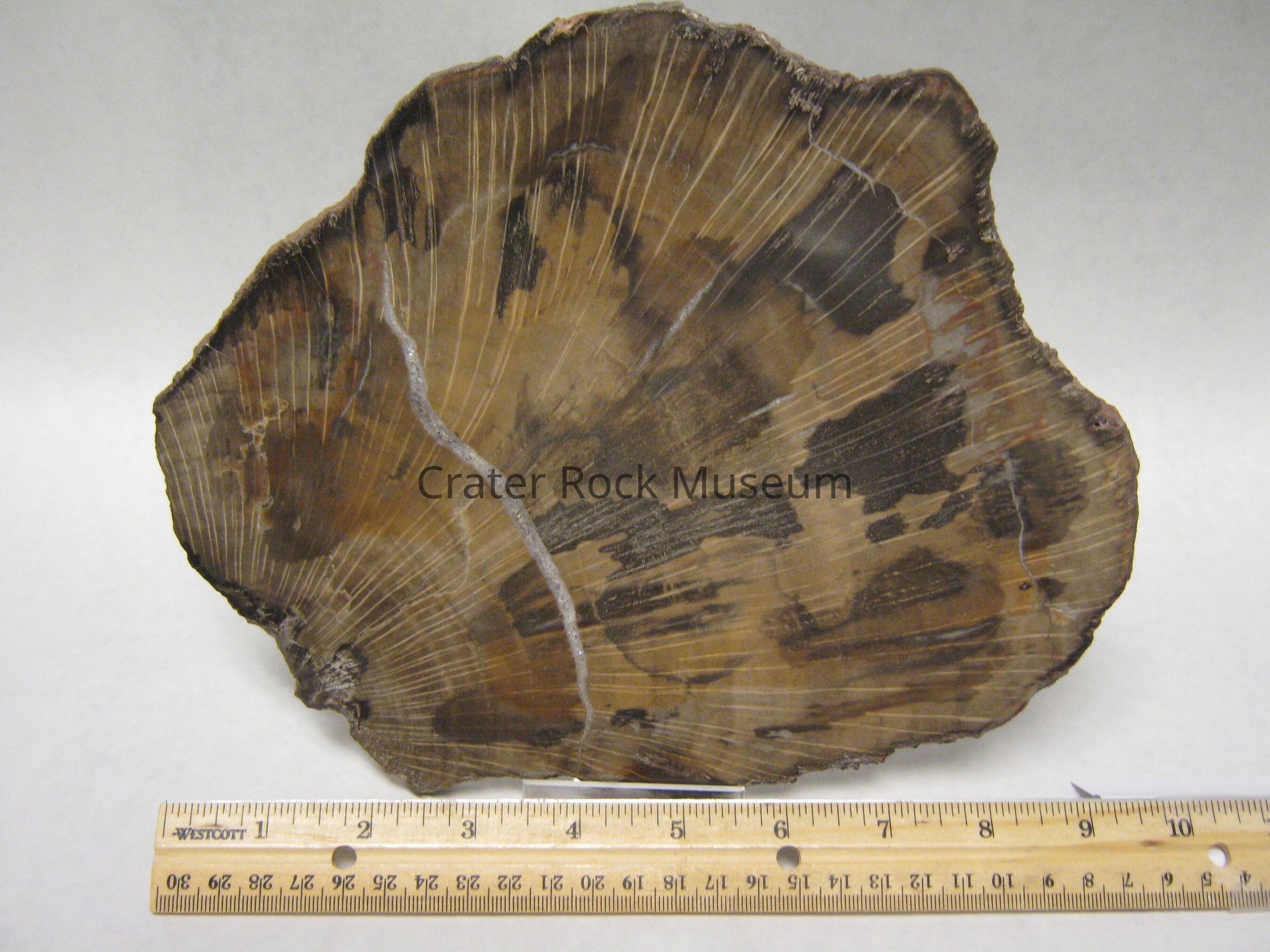 Delmar describes this pieces as a 3/8" thick slice of petrified wood , variety "Schilderia" from Snowflake, Arizona. Polished side shows wood in brown and black, some red, with silicate cracks. Piece resembles a fan in shape and wood design. Tropical variety. Probably from Jurassic period (Mesozoic era)