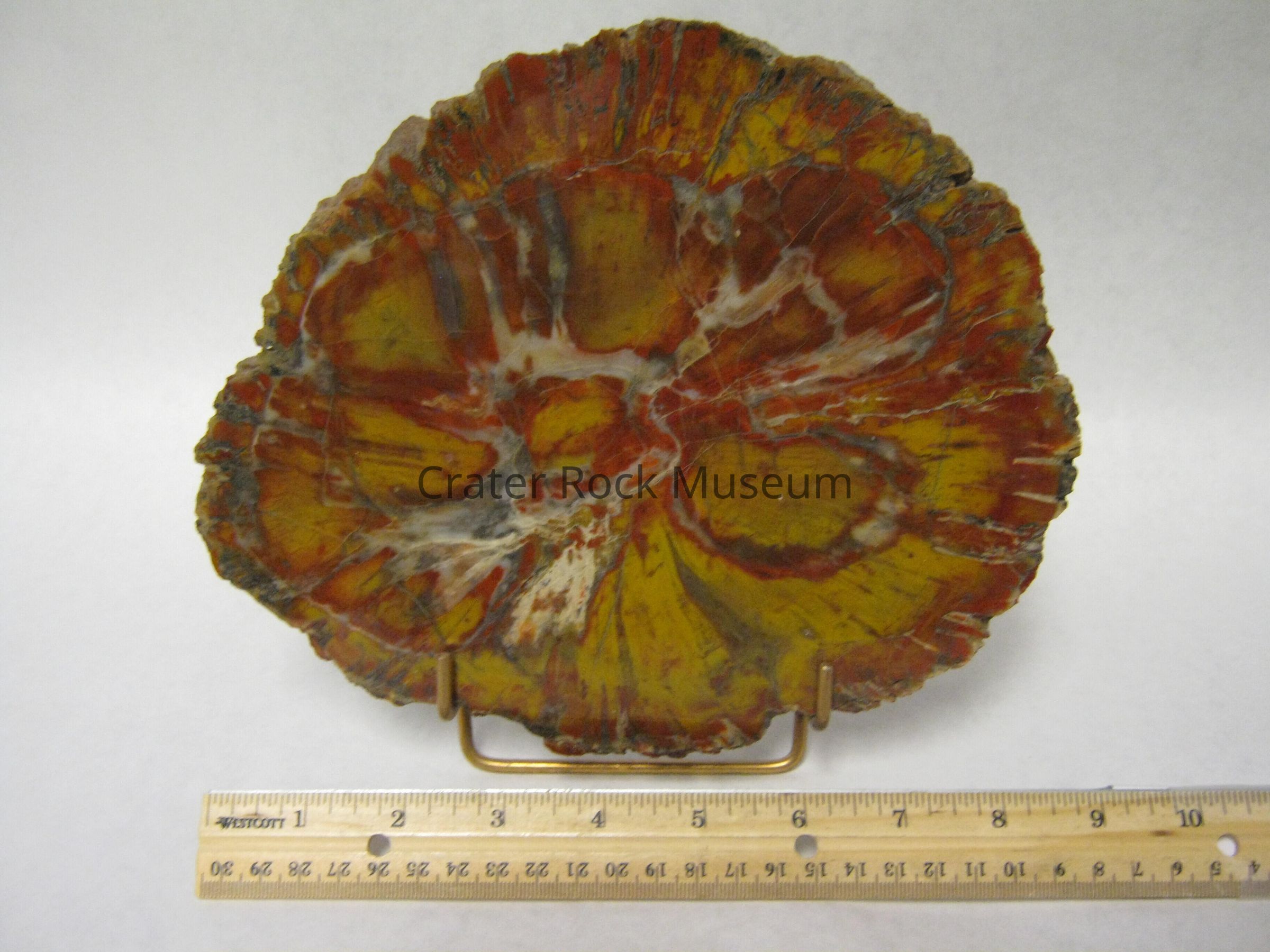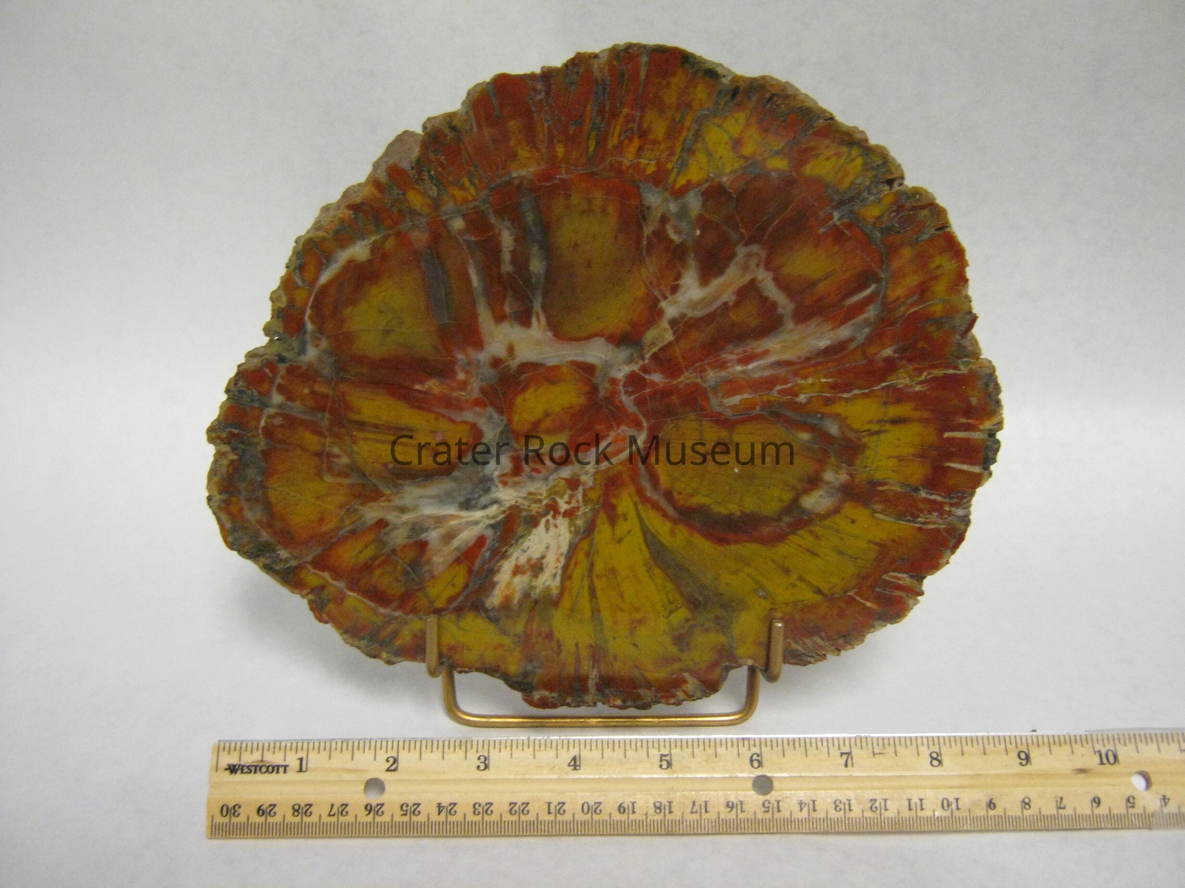 Description: Polished cut slab with colors mustard, rust, red and white to clear veins.