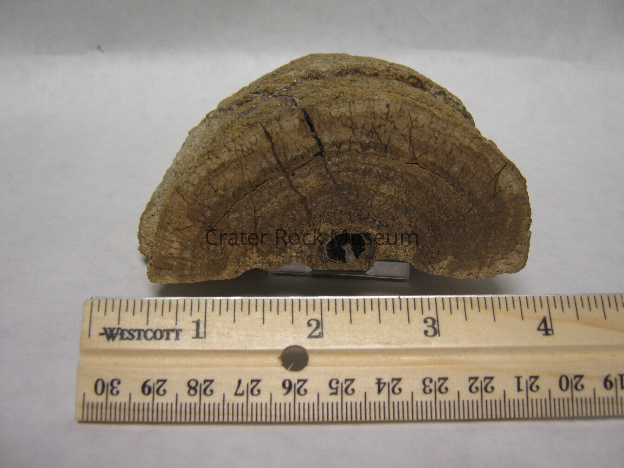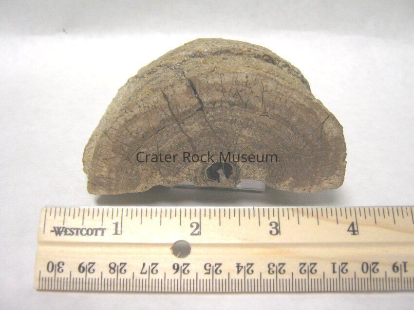 Description: From the Green River formation in the mid-eocene (55 mya) petrified when the branch fell into the ancient lake where it was covered with blue-green algea which petrified the branch - demonstration of field condition. Outer cast is tan with very little a bark texture seen, the polished face shows growth rings with colors tan to a darker brown in the center, there is also a clear ring of crystalized agate around the dark brown center