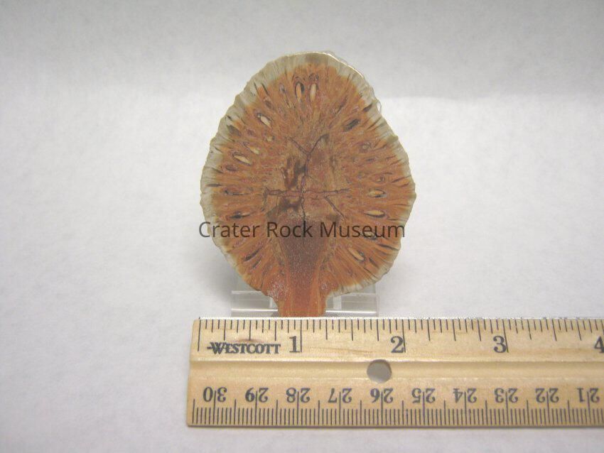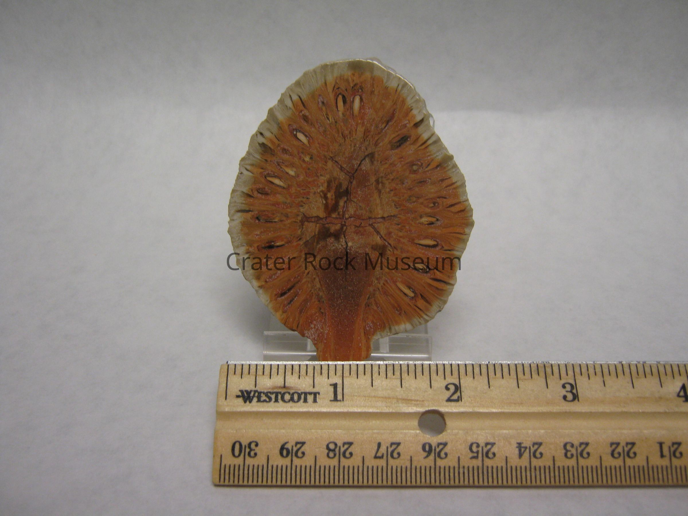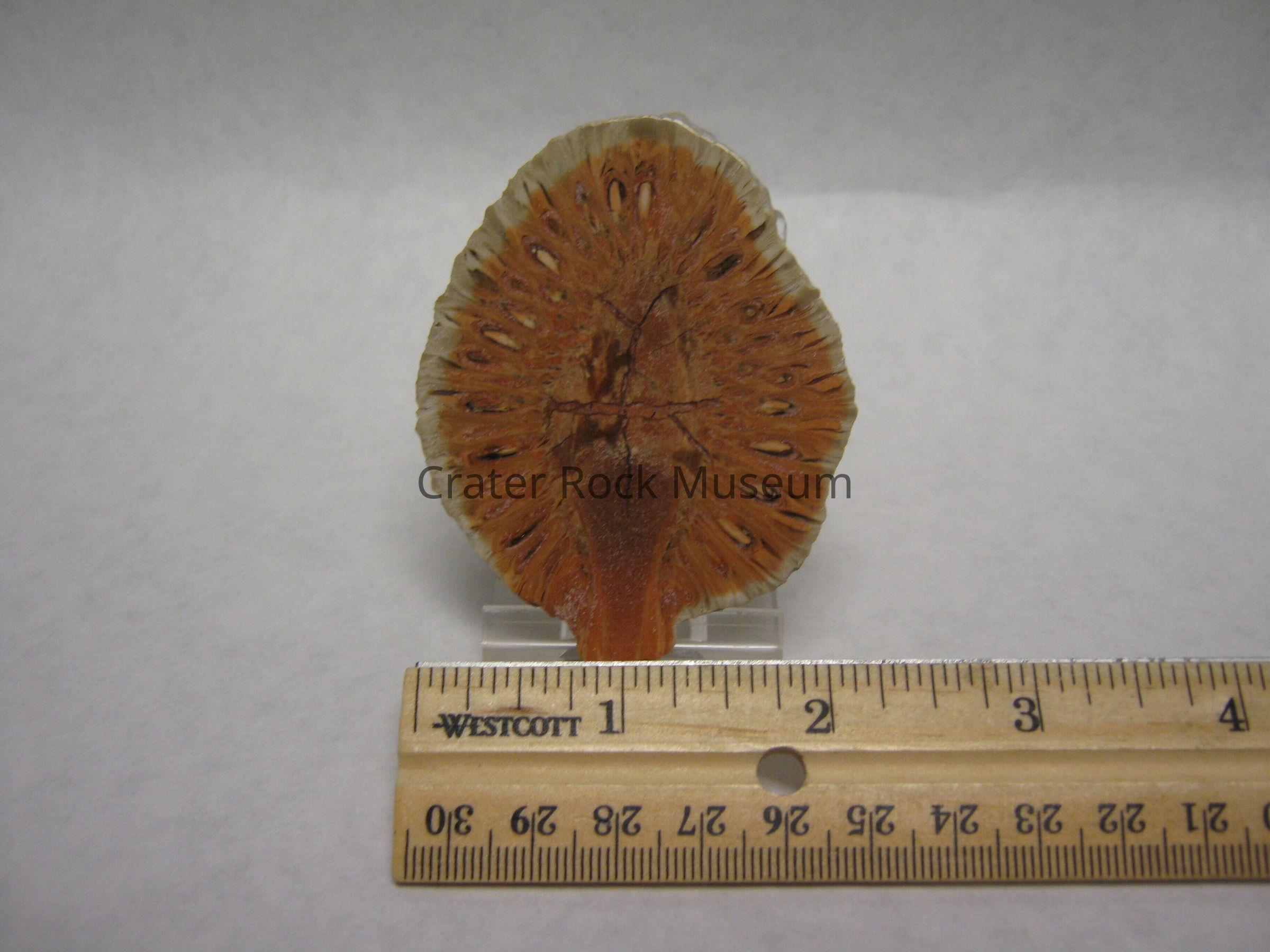 Description: Cut in half and polished araucaria seed cone in which you can see the seeds on the in side, colored beige on the outer side and is a pinkish-orange on the in side