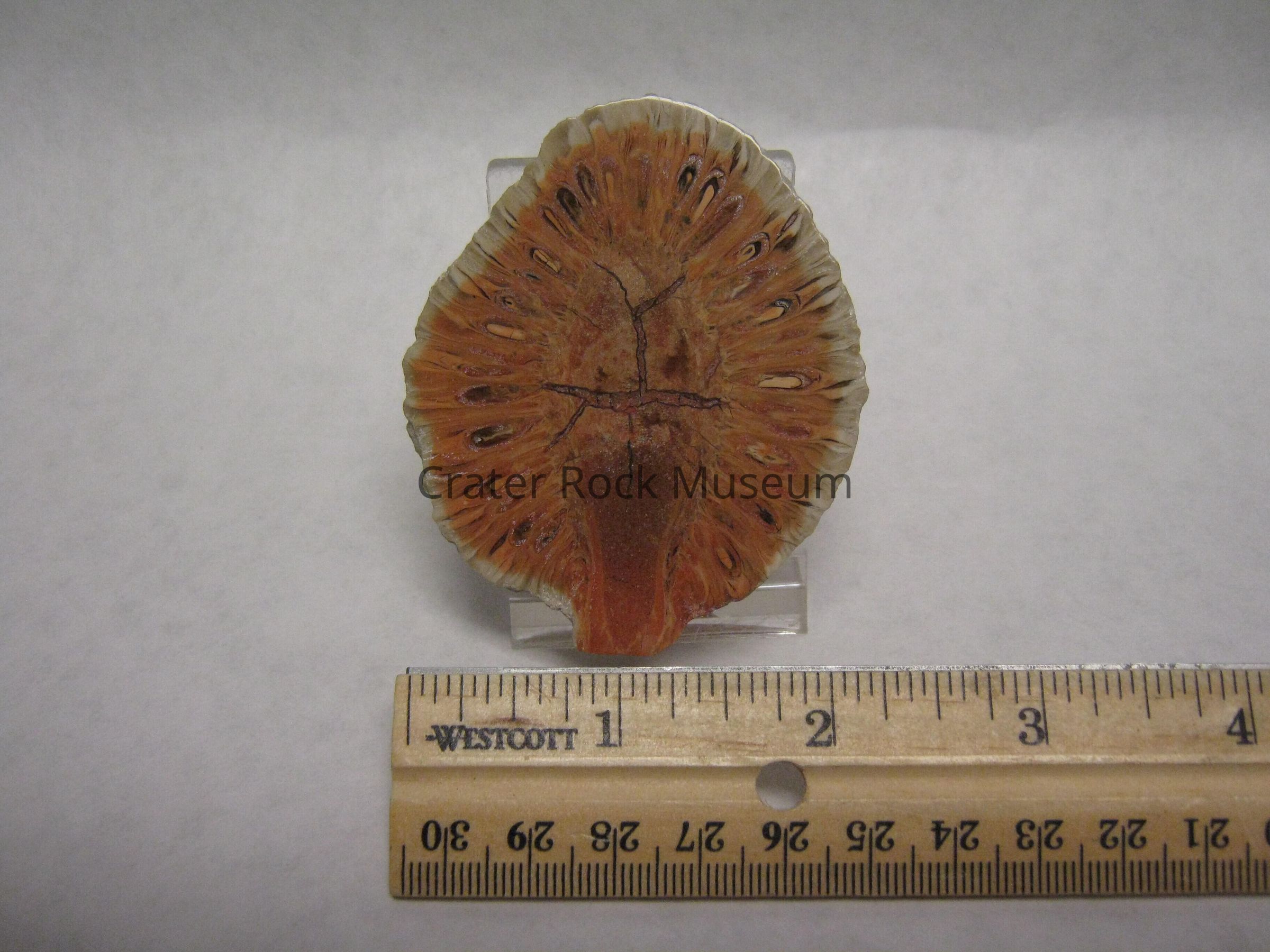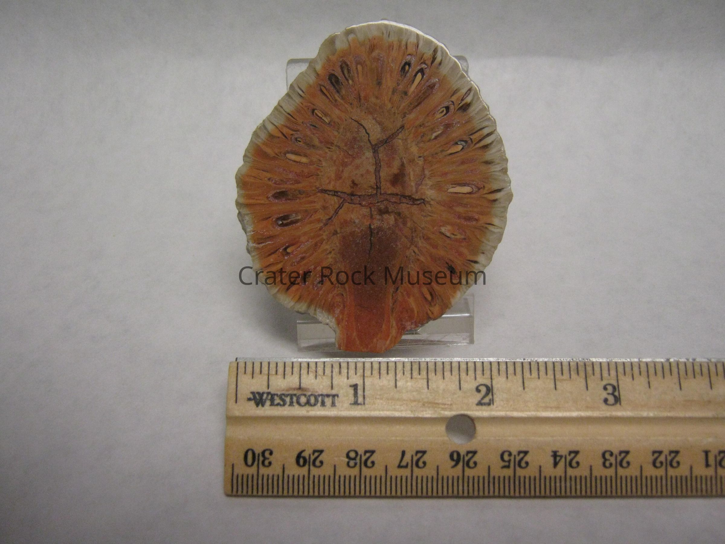Description: Cut in half and polished araucaria seed cone in which you can see the seeds on the in side, colored beige on the outer side and is a pinkish-orange on the in side