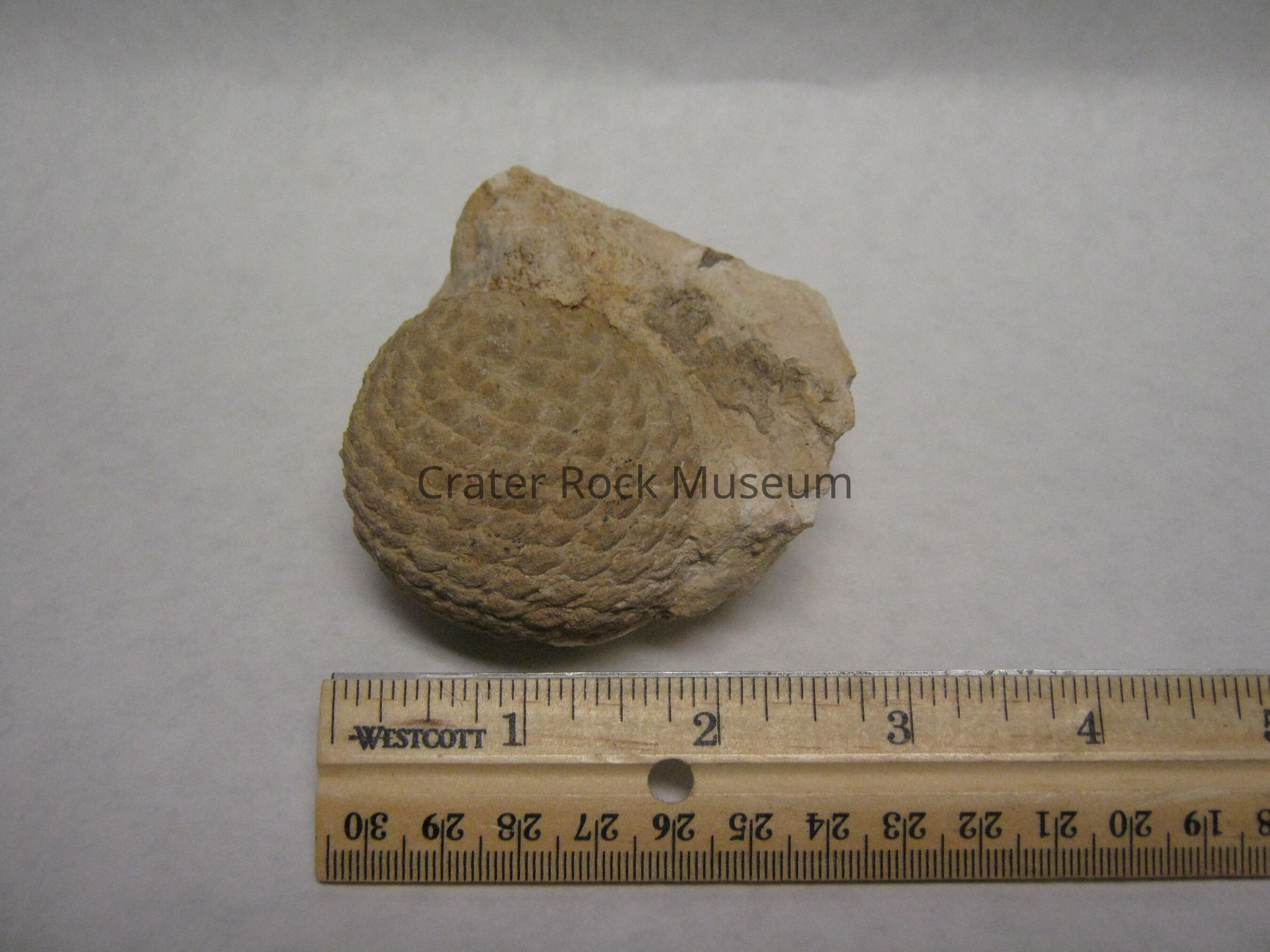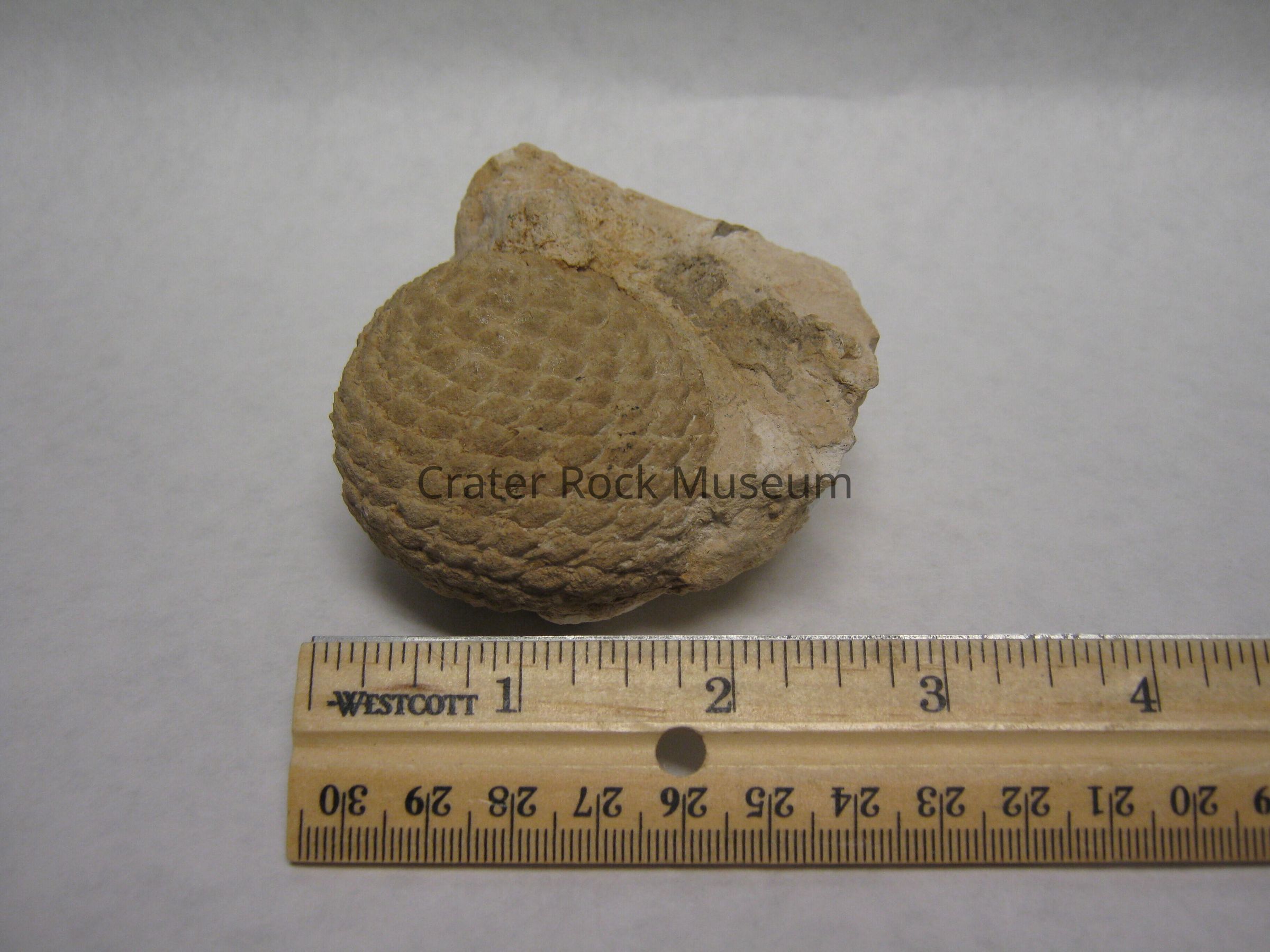 Description: A whole female araucaria seed cone, colored tan or pinkish-beige from the rhyolite tuffs
