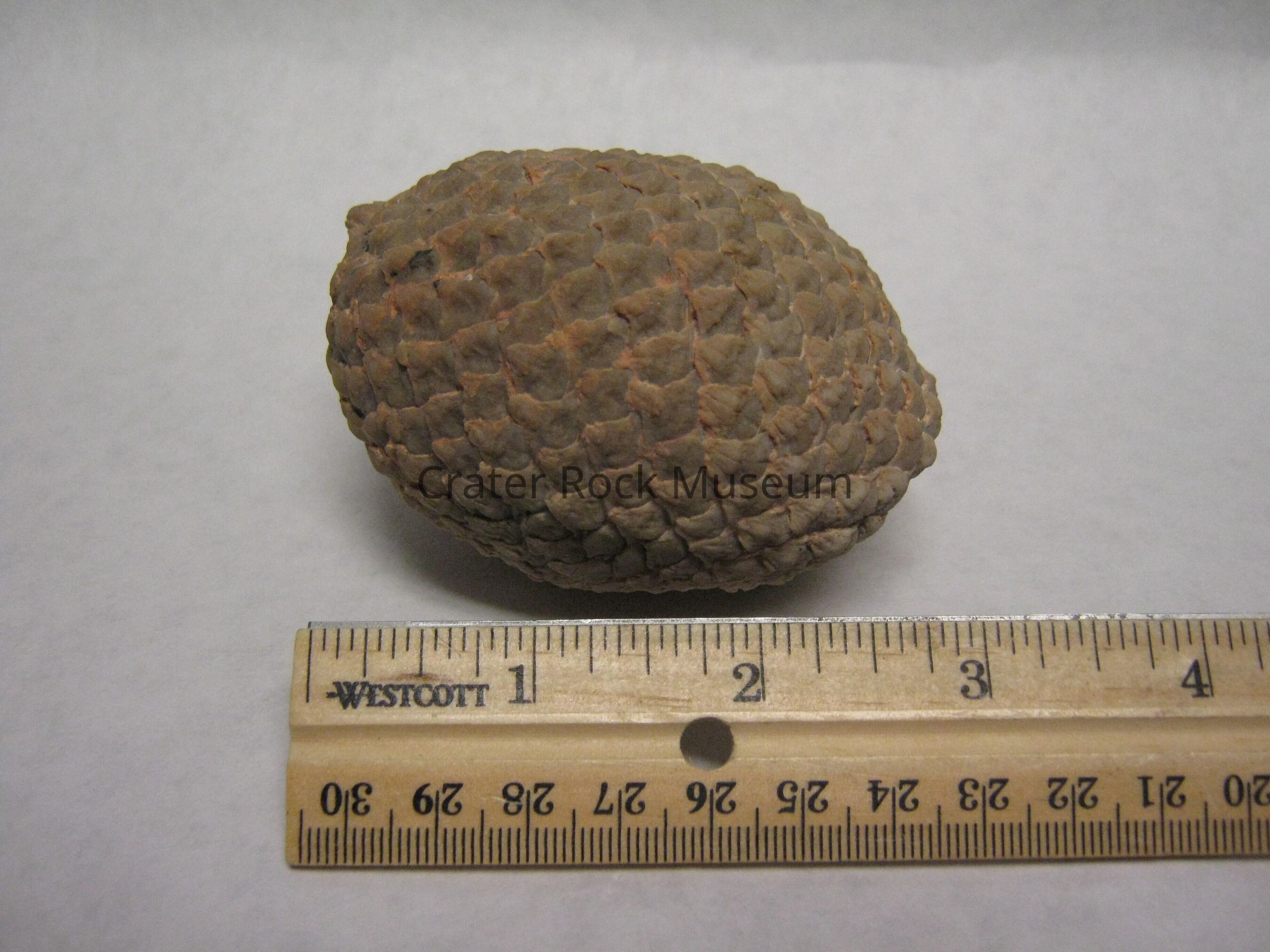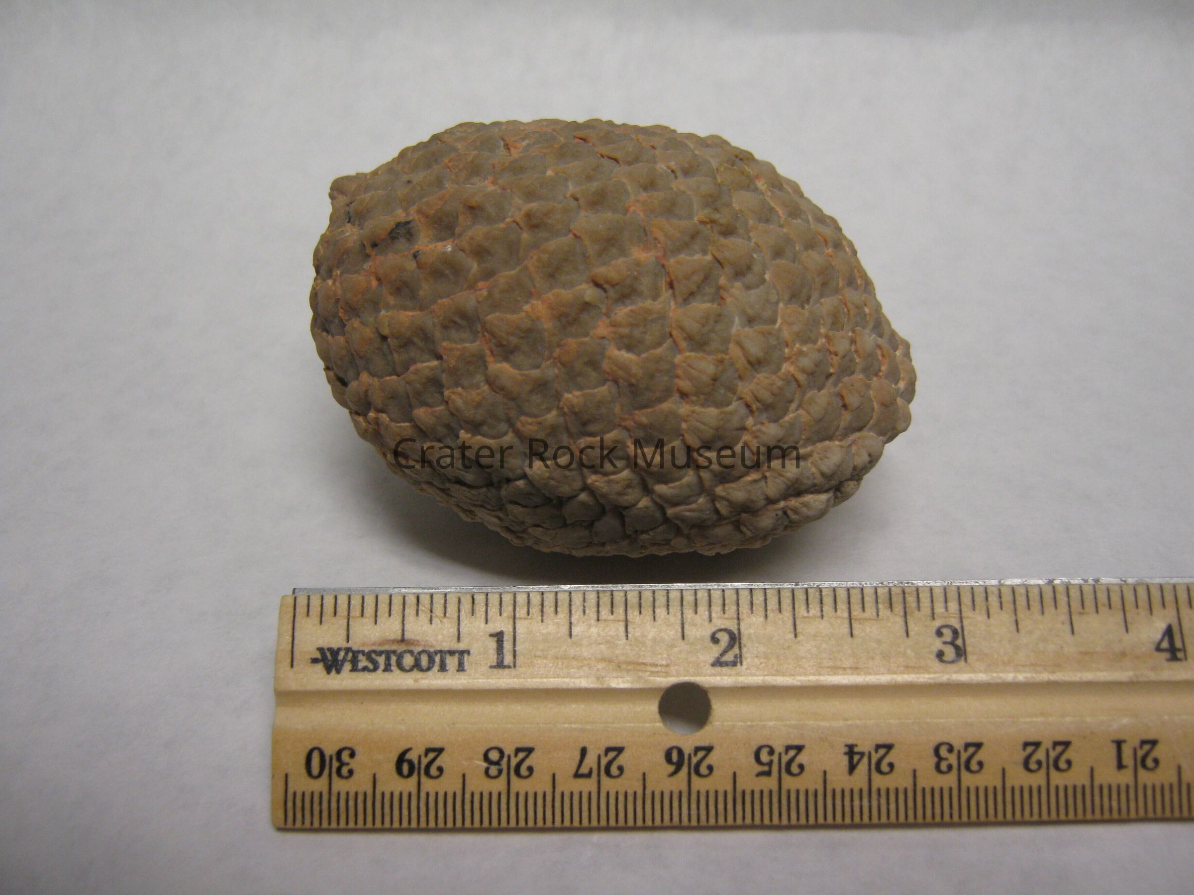 Description: A whole araucaria seed cone, colored tan or pinkish-beige from the rhyolite tuffs