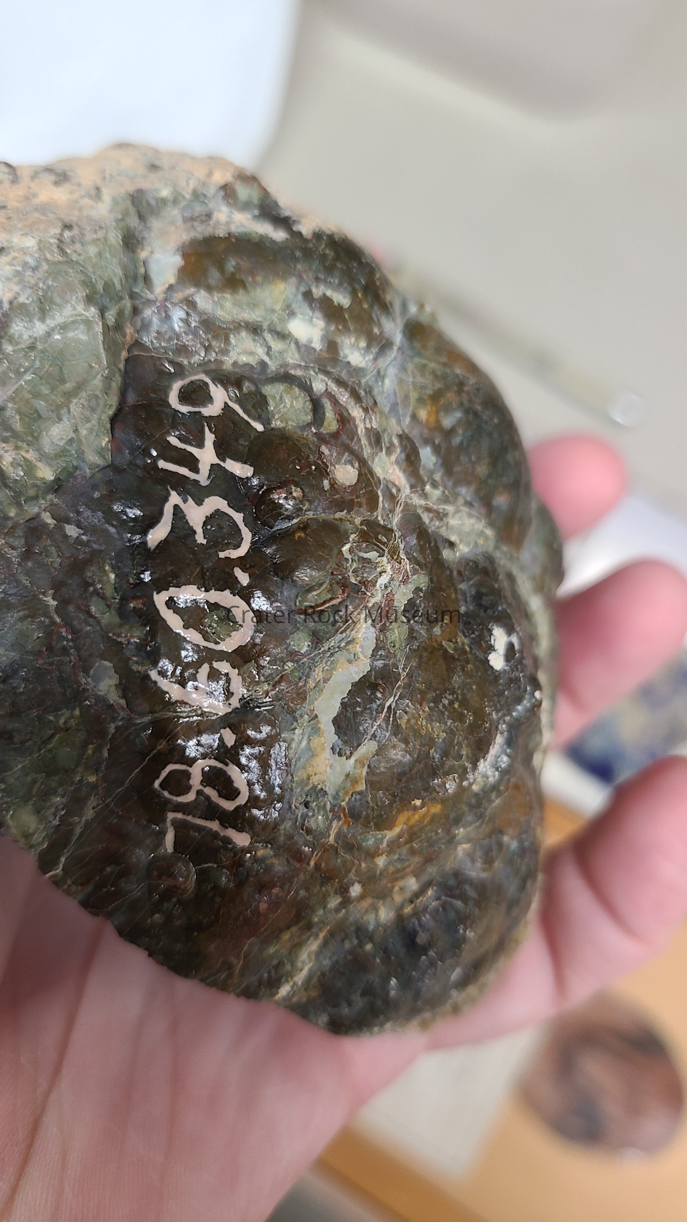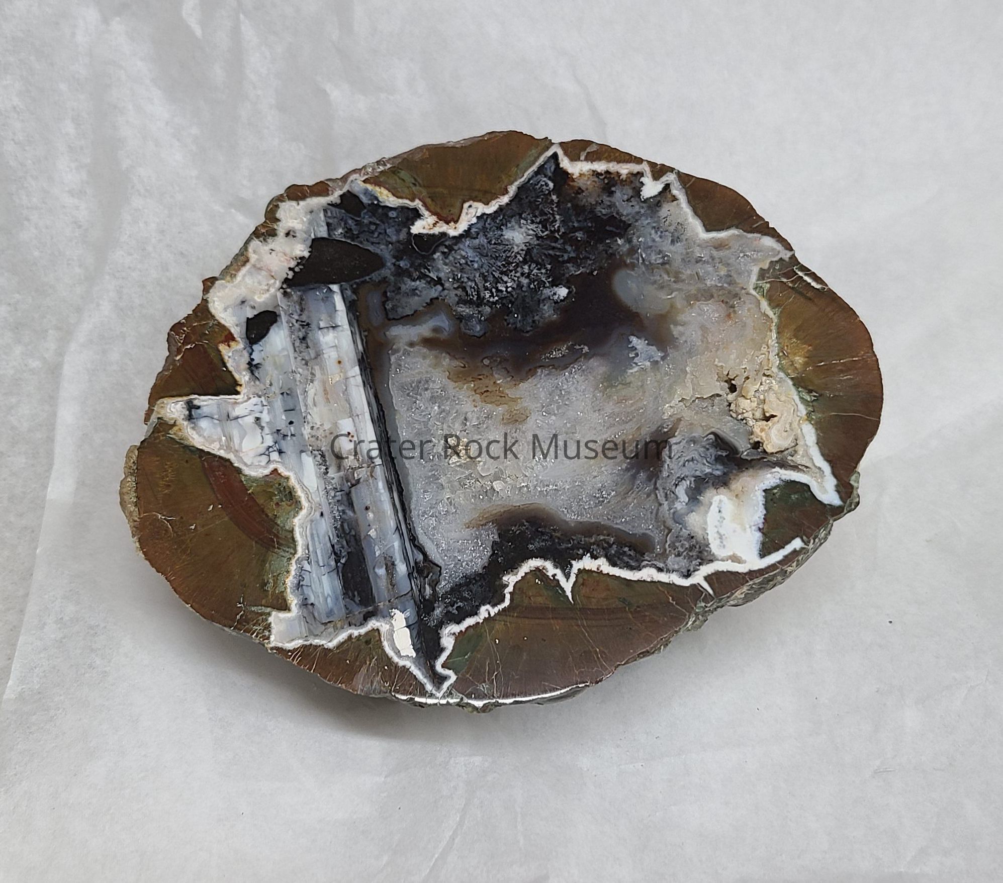 A Thunderegg from Burns, OR (Eastern OR). Cut side shows Agate center with swirled and bedded lines in White Grey, Brown, Black and Crystalline. Center surrounded rock is in Brown, Red and Green. Some Opaque Black rock seen to one side of Agate.Dimensions