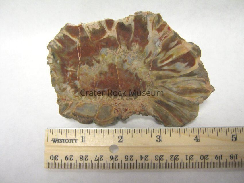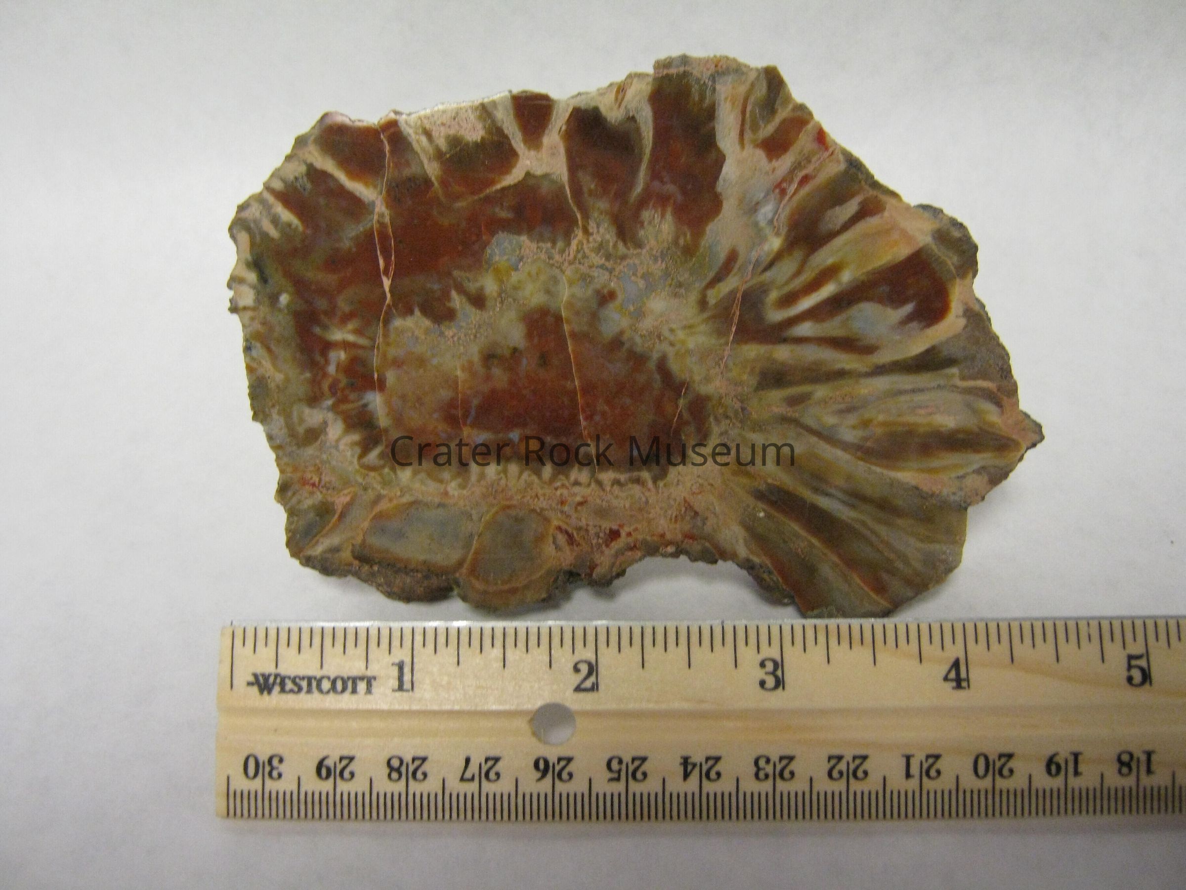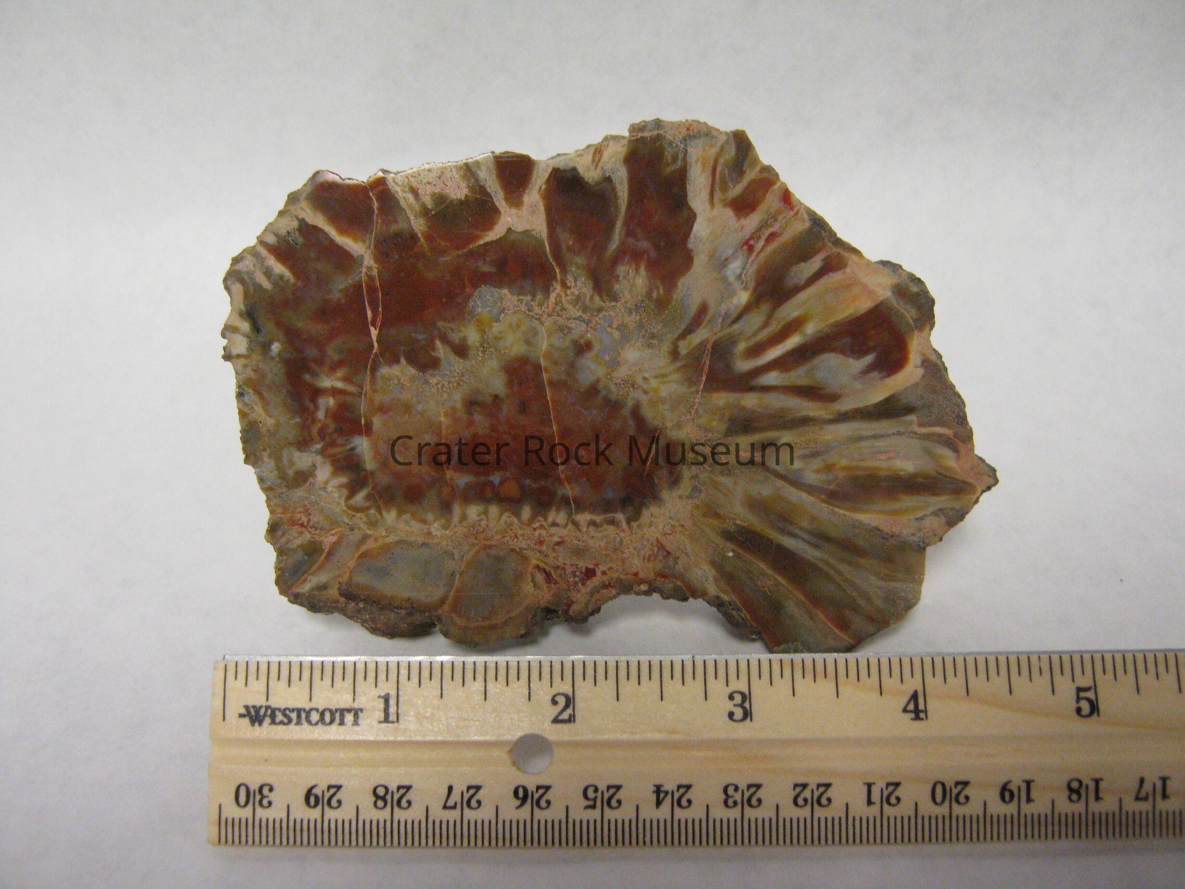 Description: A piece of petrified wood near Escalante, Utah. Polished side shows wood in orange, olive, mustard and grey. With some pink. Tropical tree. Probably from Jurassic period, Mesozoic era. l