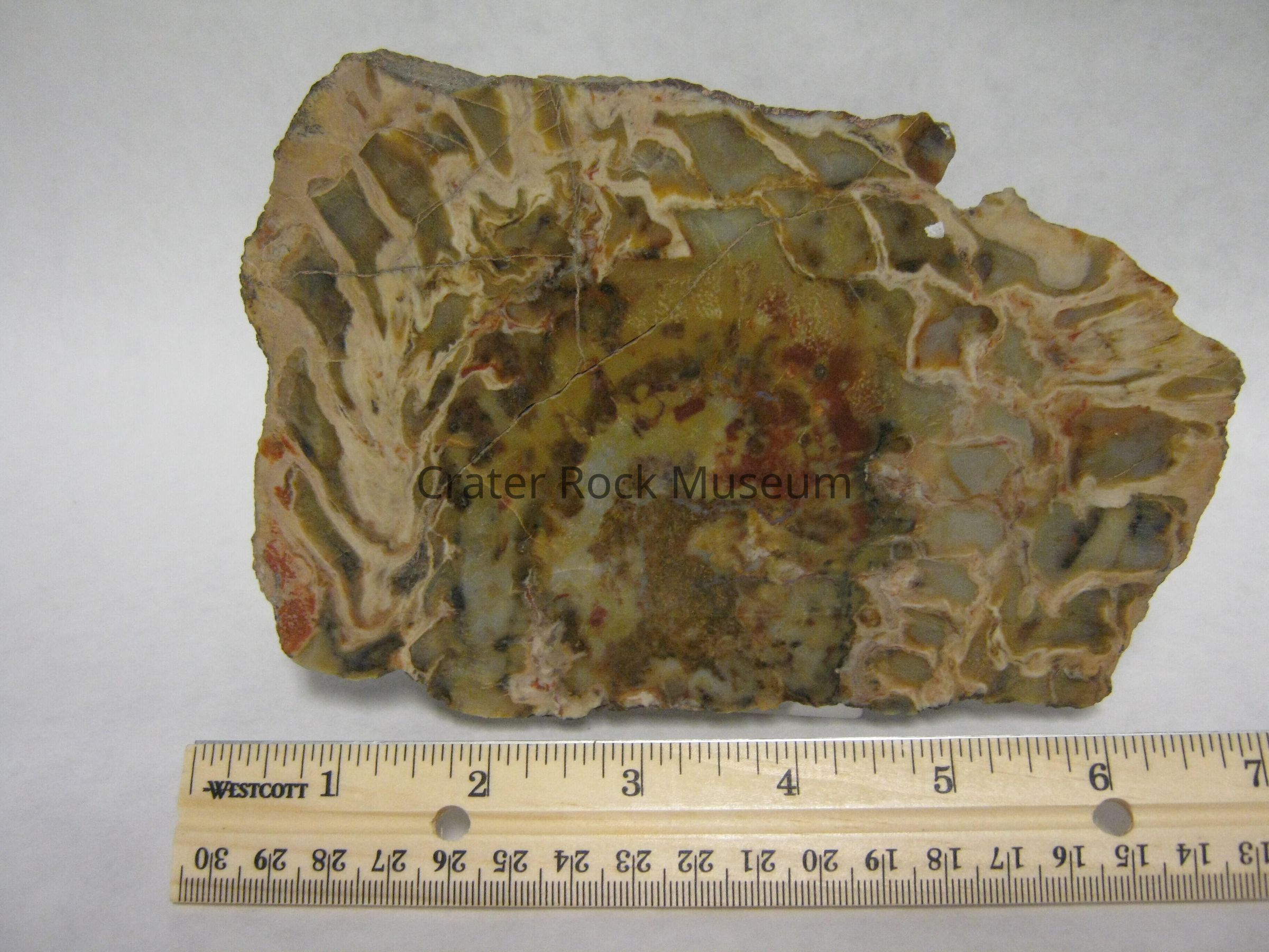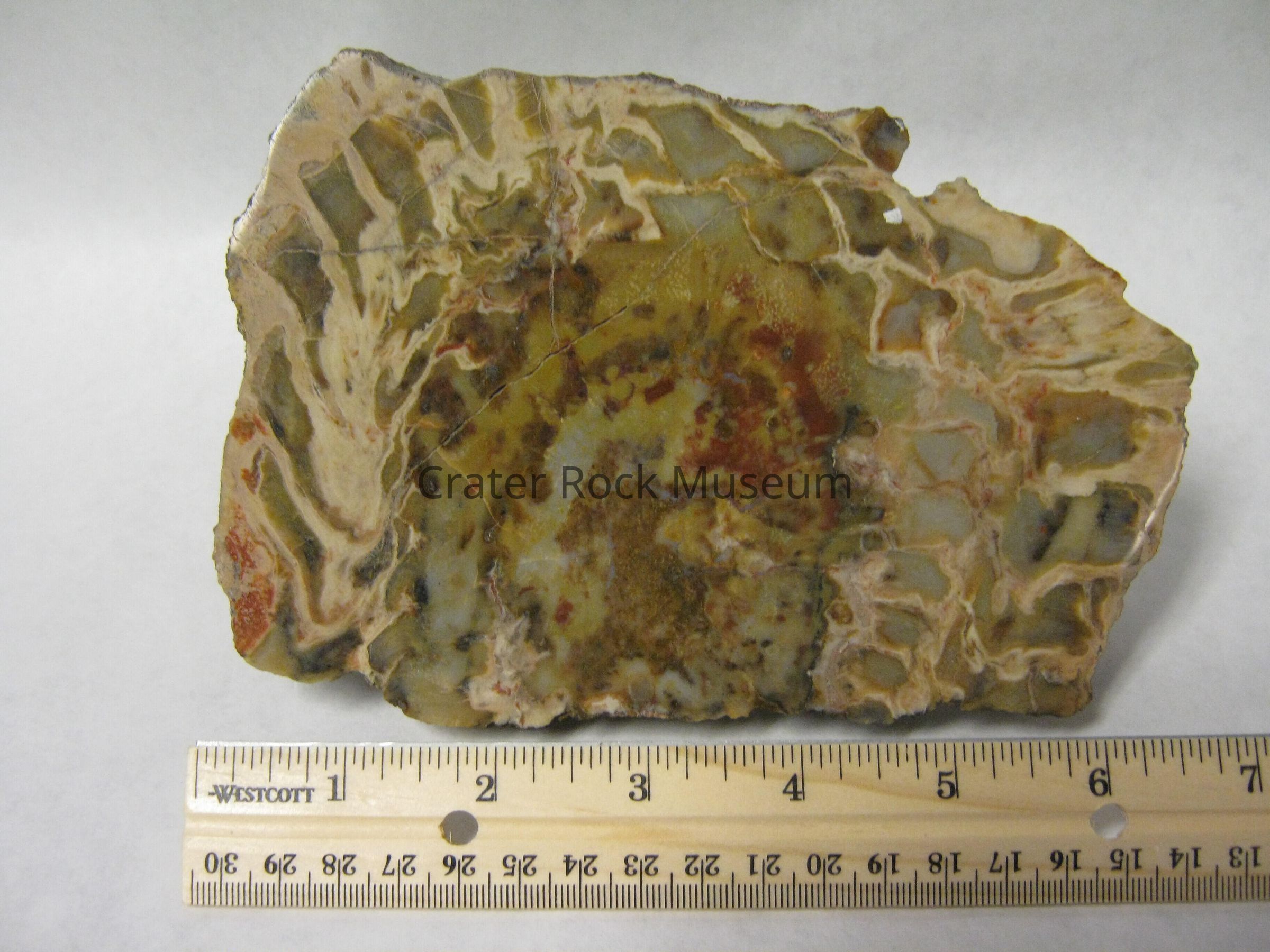 Description: A piece of petrified wood (cycad) from Utah. Polished side shows agatized wood in olive, greys and mustard, and red, in a pale pink tan wood. Surface cracks visible. Wood pattern shows an oval center with a square and elongated "petal" along edges. Probably from Jurassic period, Mesozoic era.