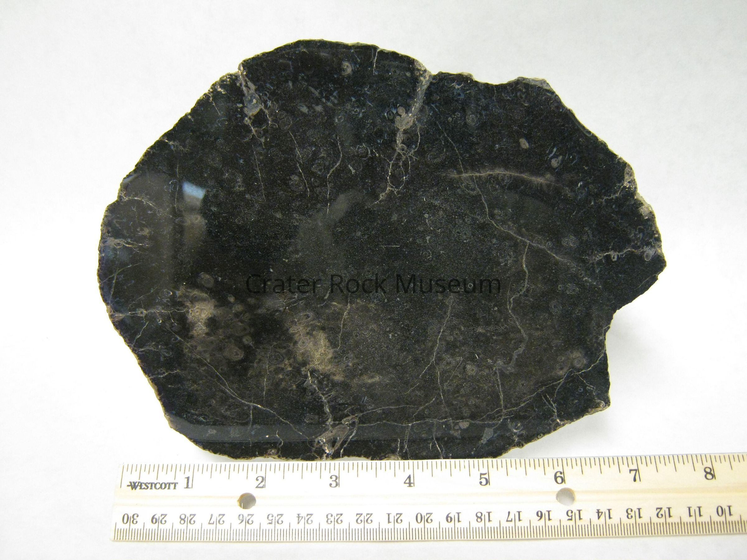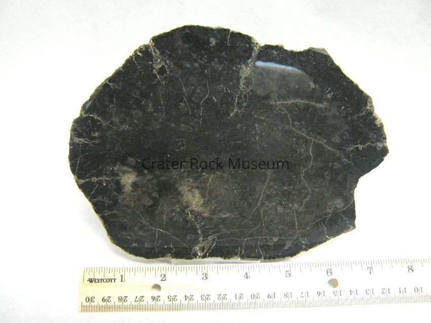 Description: A 5/8" (1.5 cm) thick slice of petrified wood (fern) from South Dakota. Type referred to as "Temskya Fern". Piece is dark in color (shade in black), with "eyes" and several cracks extending from edge inward. Some small areas in light brown. Delmar says this piece is very rare. Probably from the Jurassic period (Mesoaoic era). Tropical variety - no growth rings