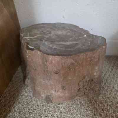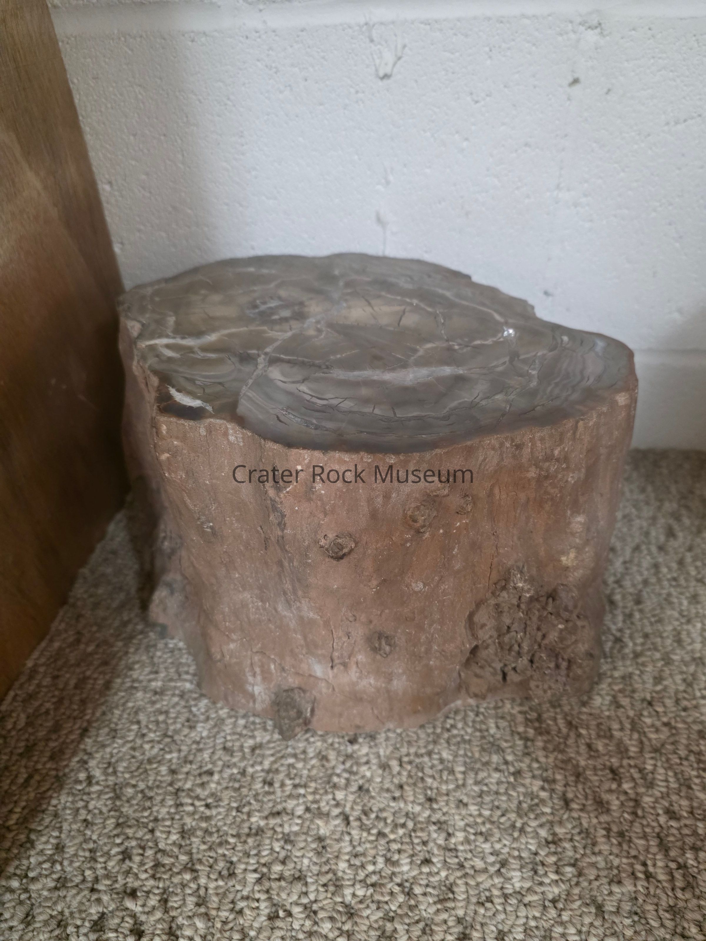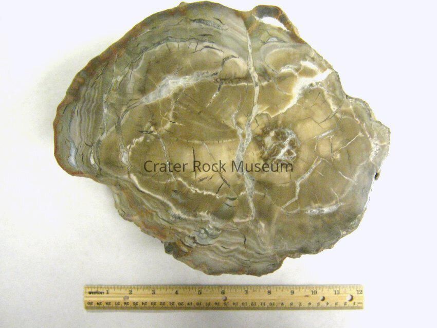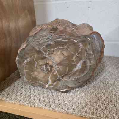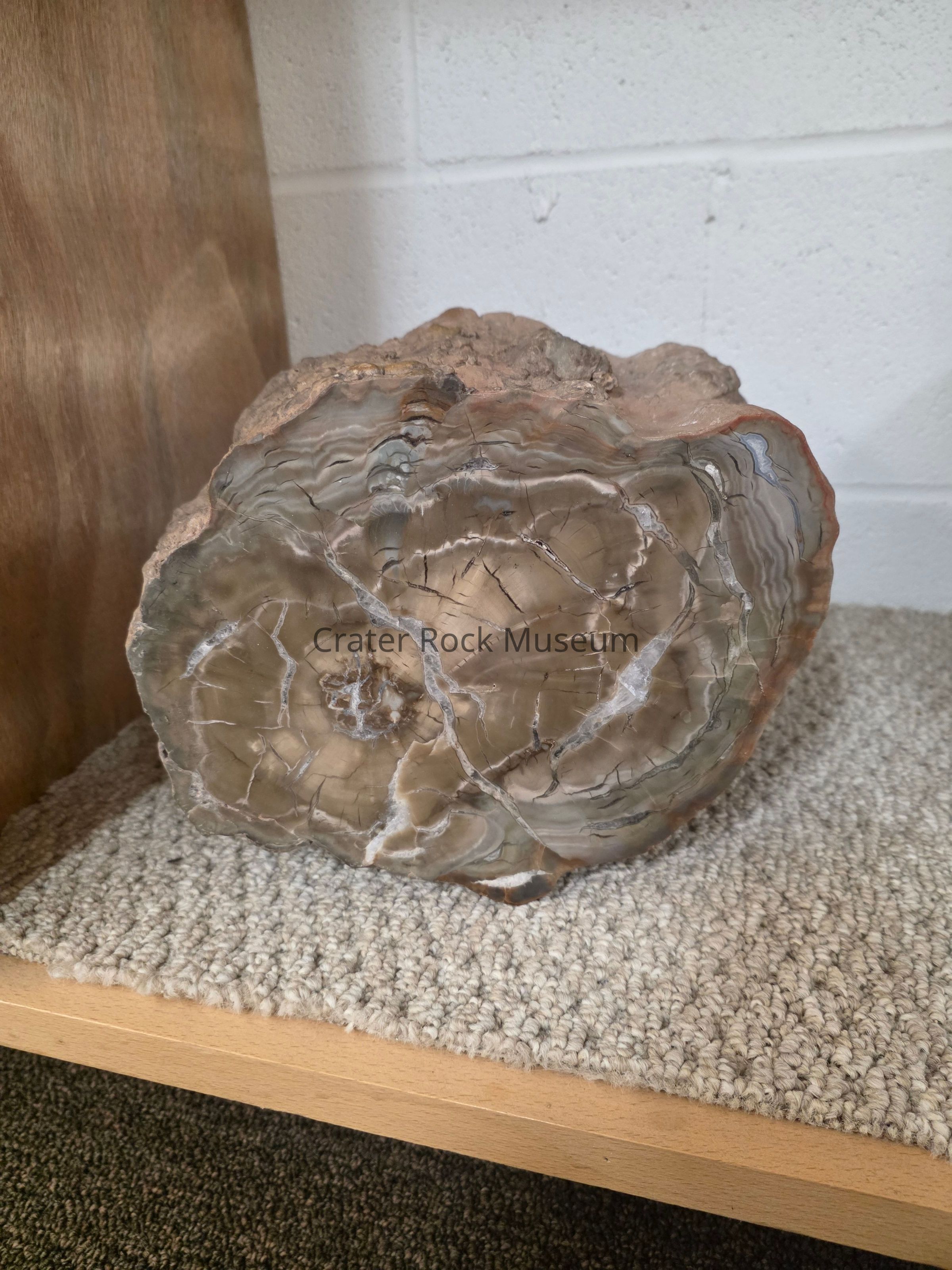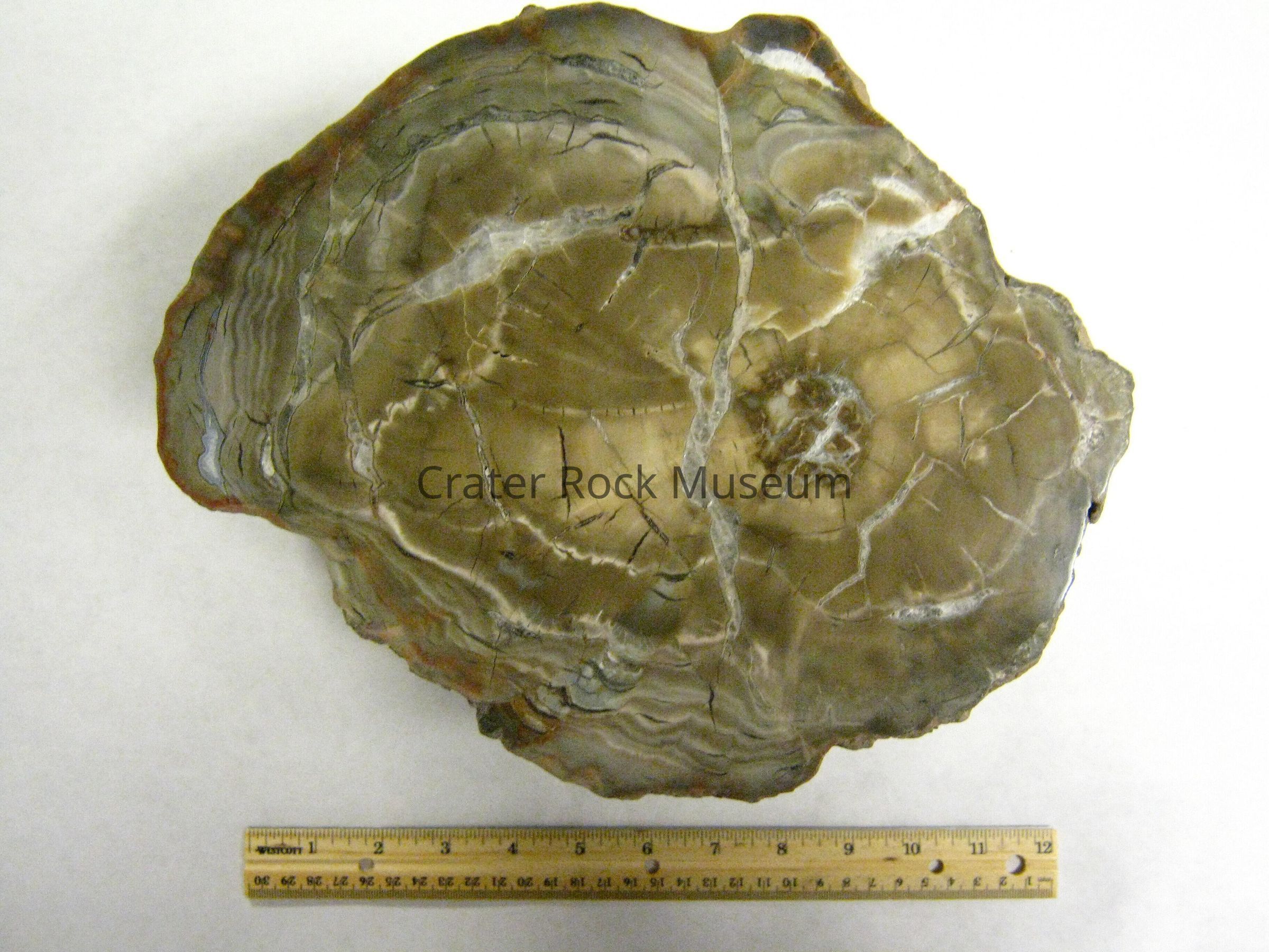 Description: One large tree stump or trunk with short shoot traces outer is a tanish-brown, the polished end shows crystalline cracks in clear and white, colors are a greenish-grey with beiges and tan tones. Some growth ring are apparent as and some rayaCollection