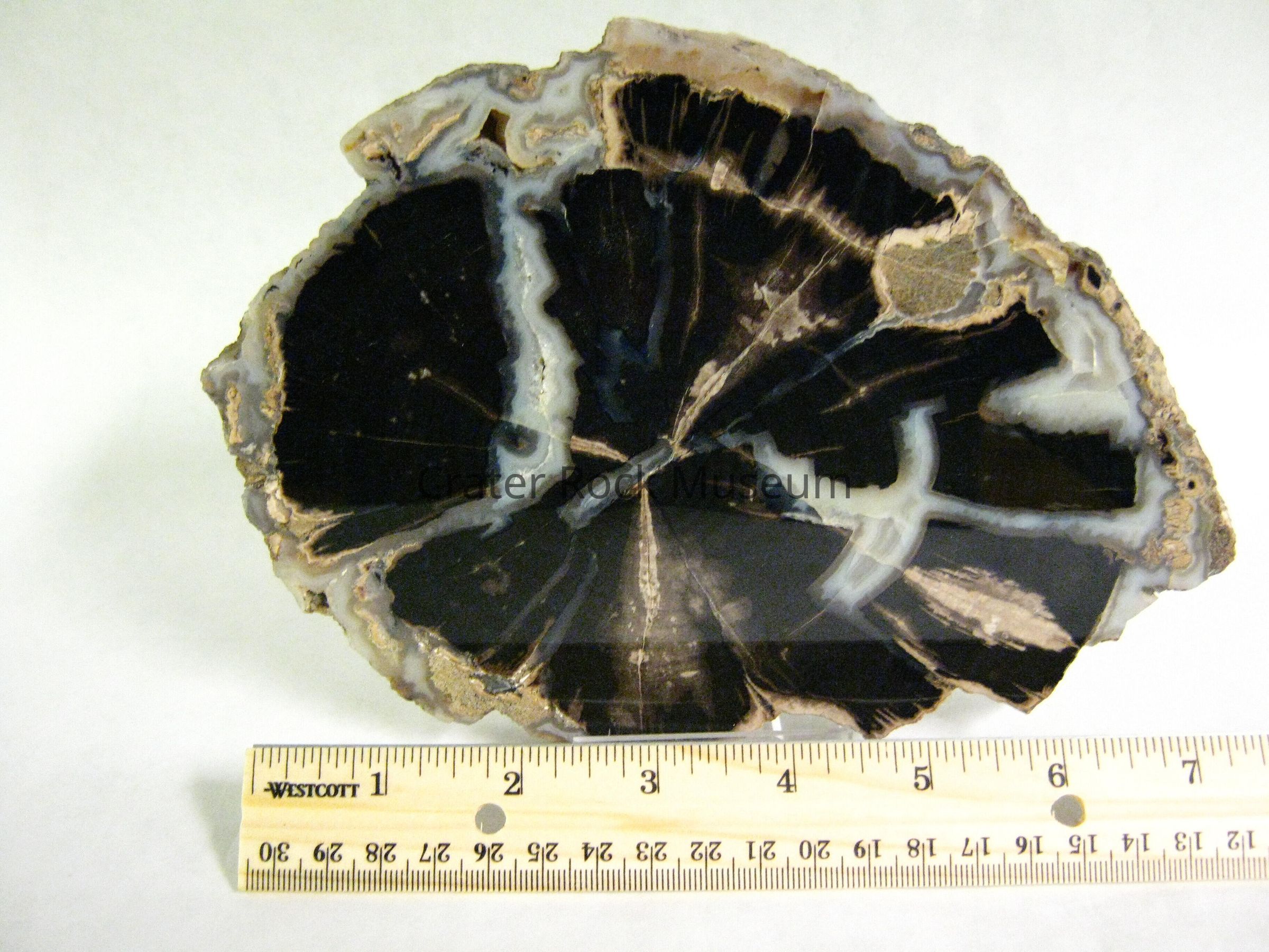 Description: Polished slab colored black, brown and beiges with crytalline cracks in clear and cream, growth rings apparent