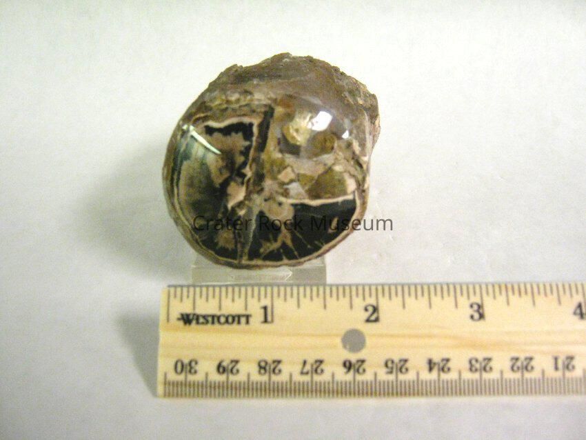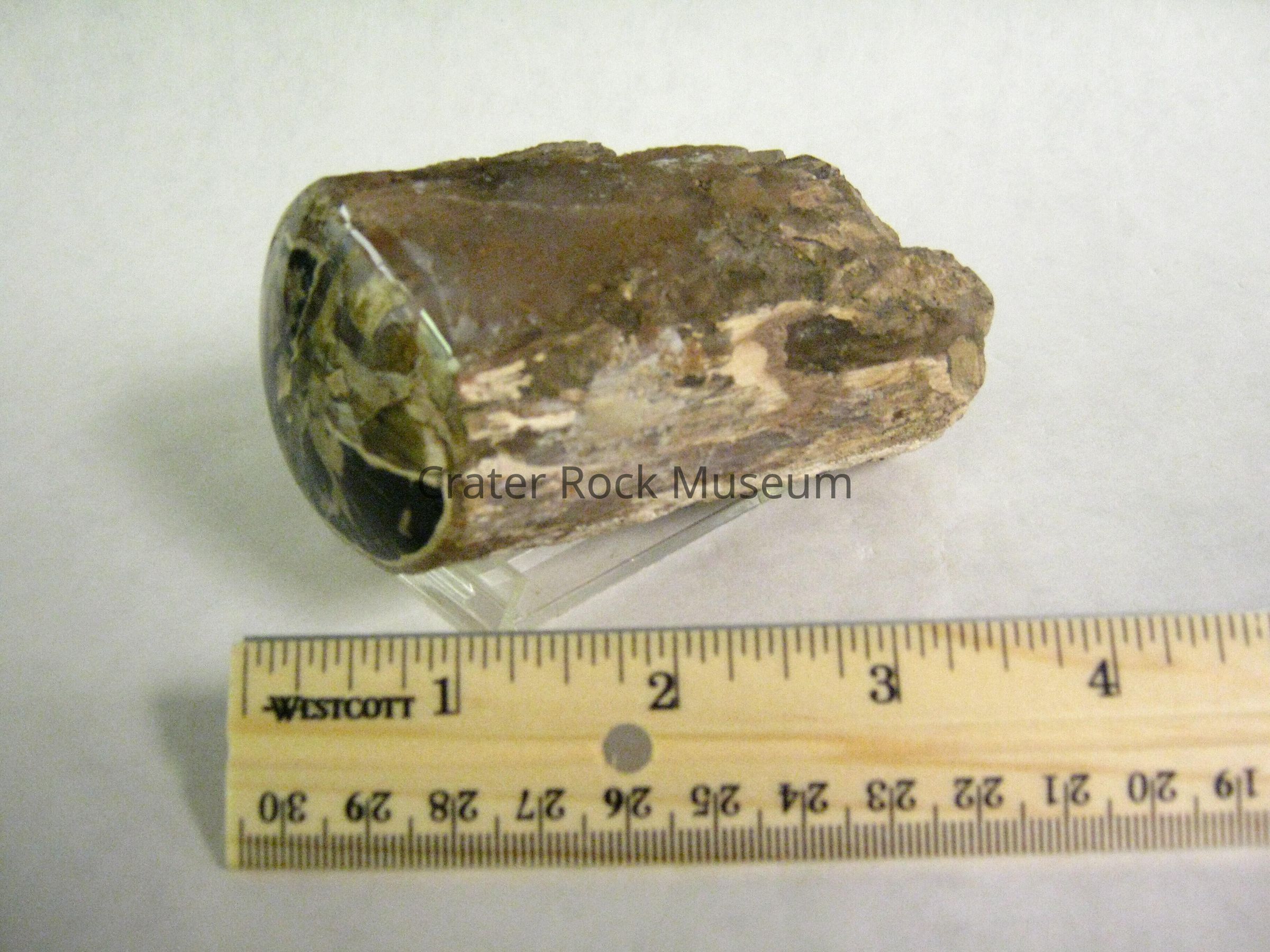 Occurrence: Silicified wood, which is the fossilization and opalization of organic woody matter by the deposition of SiO2 in a anaerobic environment to prevent decay. This means that the wood must somehow be buried in an oxygen free enviroment, possibly in the silt-laden river or the bottom of a lake or buried by volcanic ash or volcanic related mudflow. The organic material is then replaced by (SiO2) silica, other minerals determined its colors.