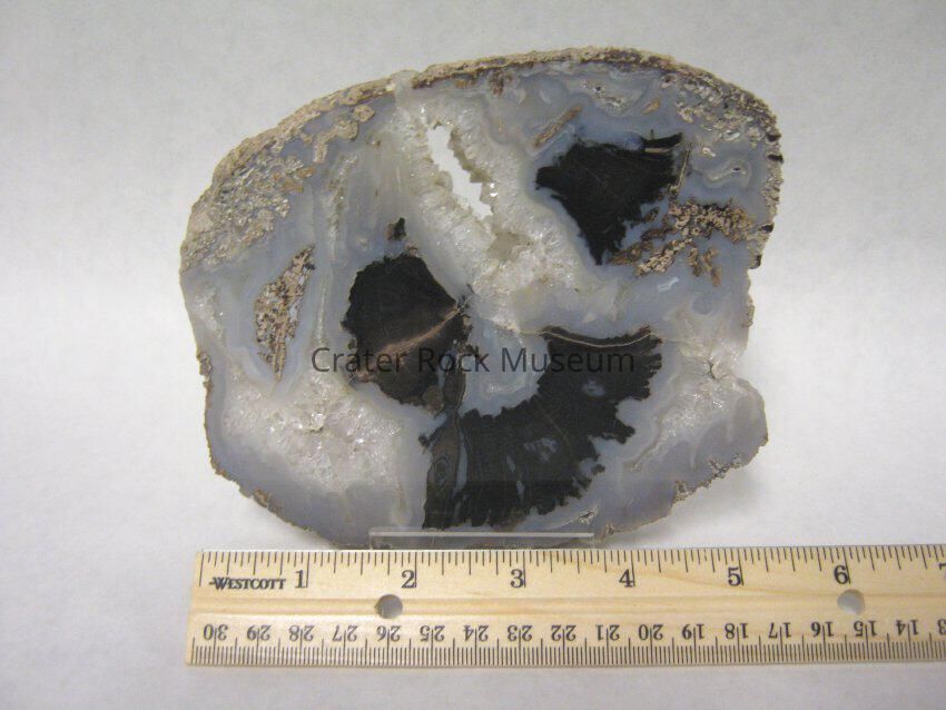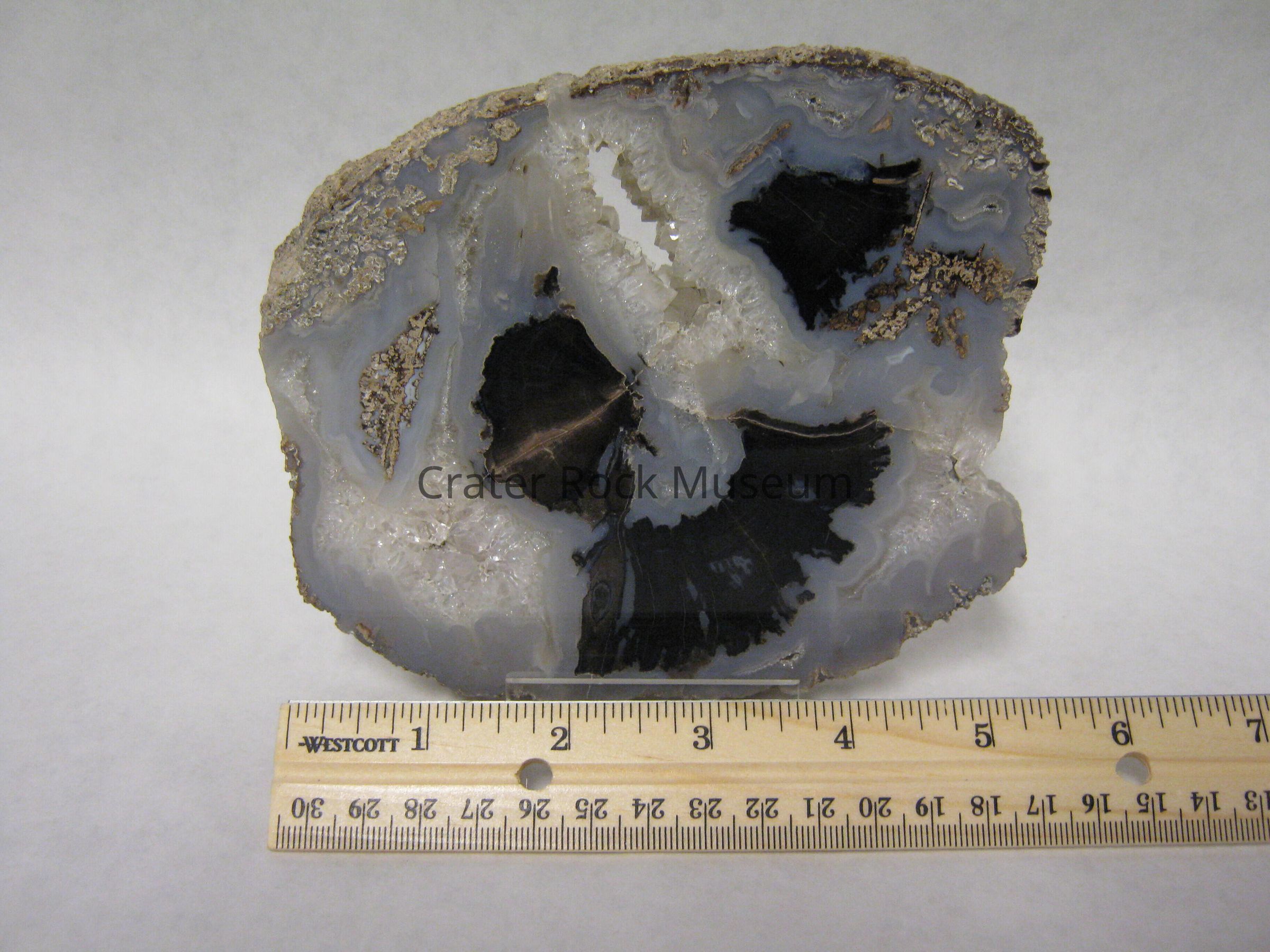 Description: A 3/4" (1.9 cm) thick slice of a limbcast with some of original wood showing, from Eden Valley, Wyoming. Polished side shows a brown and black wood segements, there is grey agate along with several crystalline areas and open cracks with crystals, with some brown opaque rock. Delmar believed this was possibly a tropical tree and from the Jurassic period (Mesozoic era).
