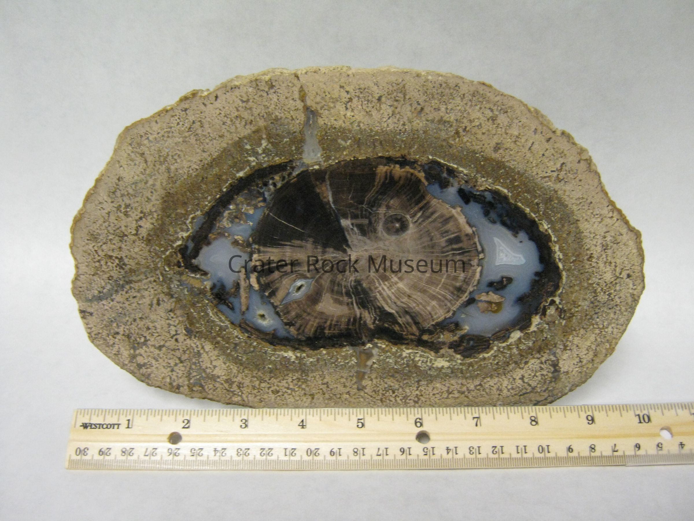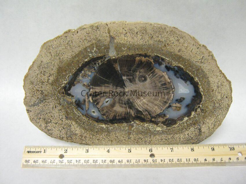 Description: A 5/8" (1.6 cm) thick slice of a piece of petrified wood encased in algae. Polished side shows oval center with a circular piece of wood in middle in browns and beiges, some black seen by blue grey agate (in front of areas), and some crystal with pieces of breccia wood along the edges, (brown, beiges and black).
