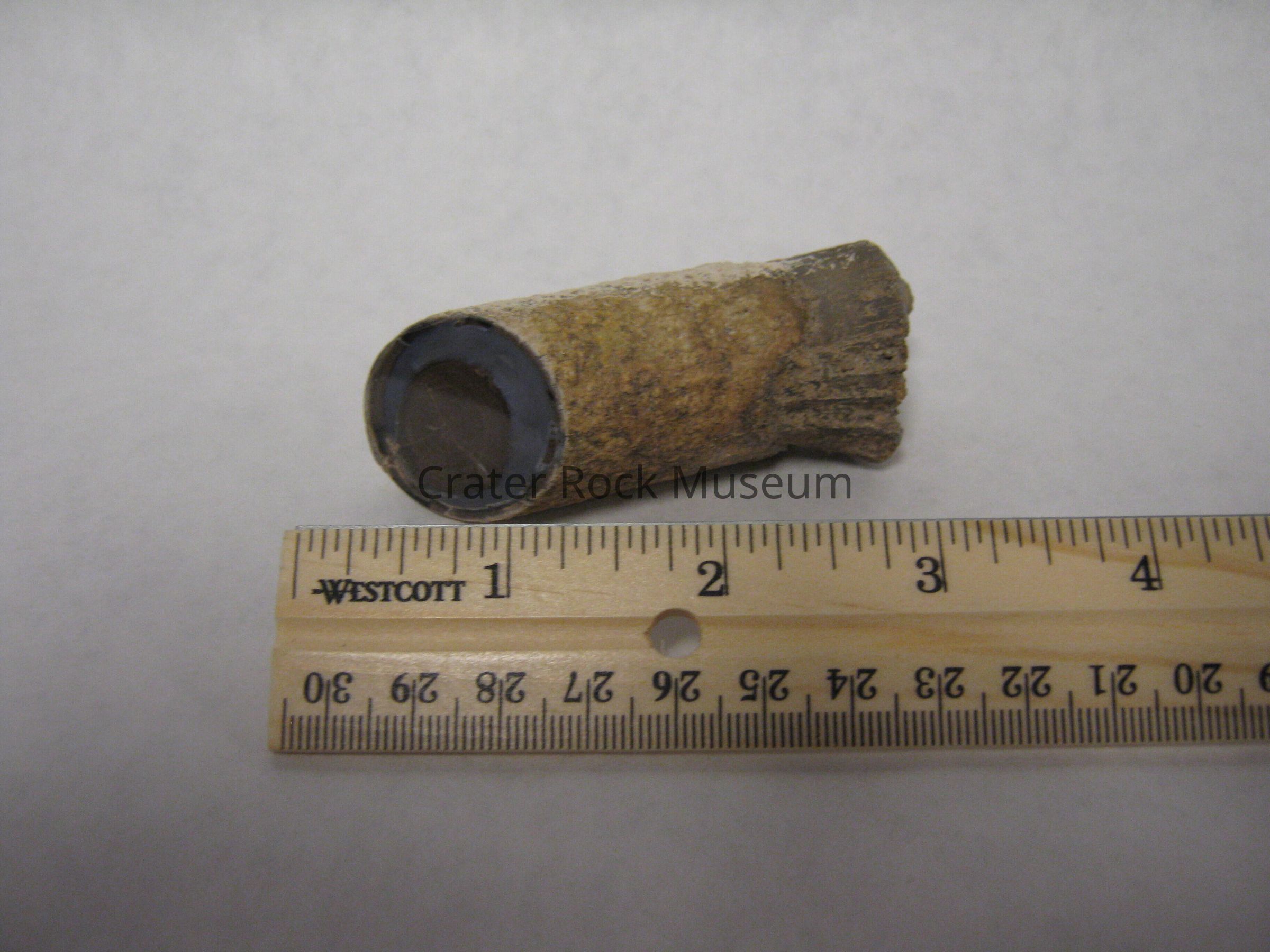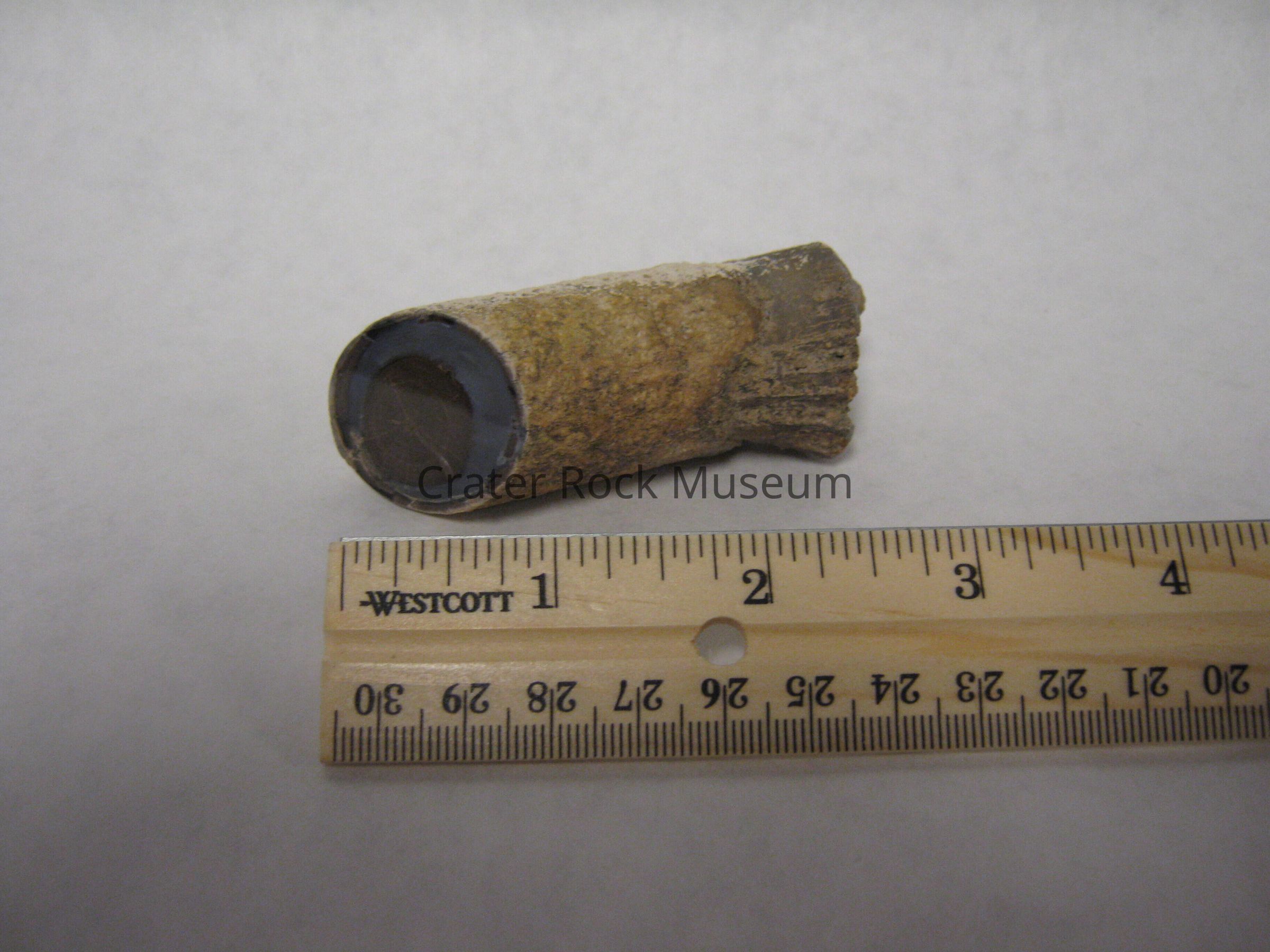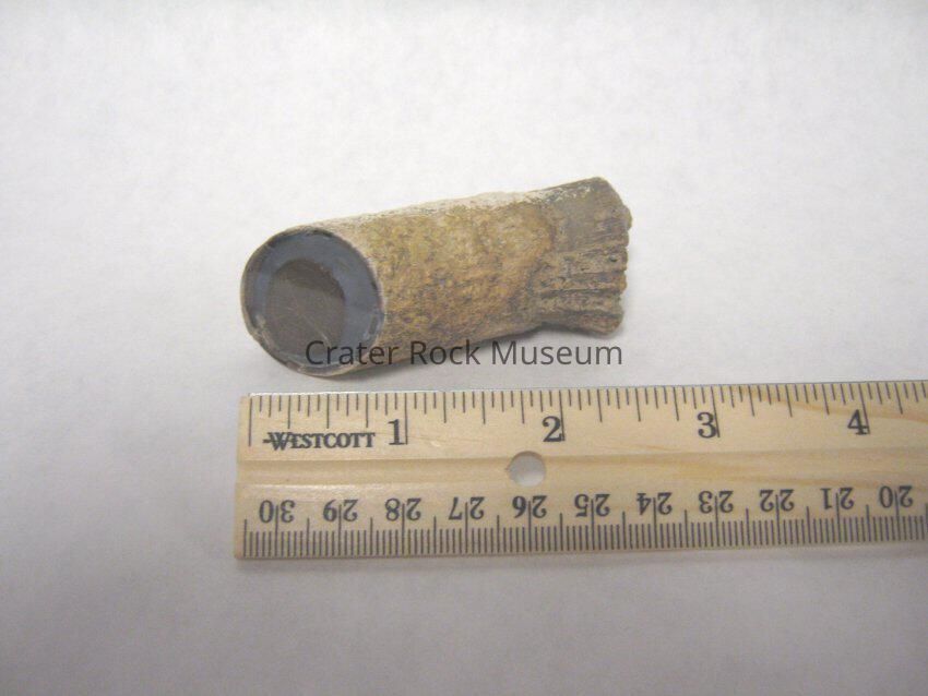 Description: (B) one of four pieces, a limb cast from the Green River Formation in Wyoming, colors grey, brown, black, beige and clear agate.